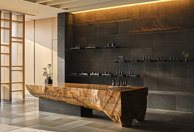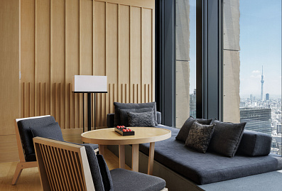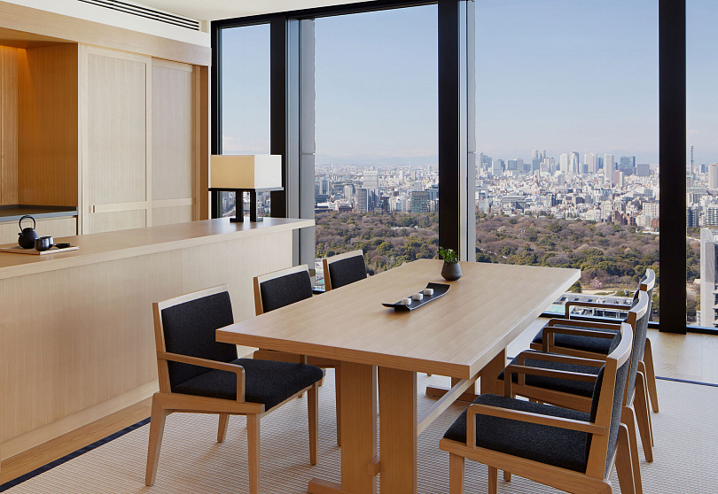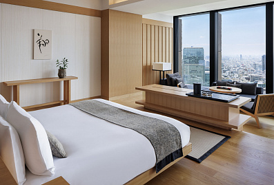 Тишину обеспечивает впечатляющая высота: поднимитесь на 33 этаж башни Отемати, и Токио станет всего лишь воспоминанием. Интерьеры номеров были созданы австралийским архитектором Керри Хиллом, автором многих отелей сети. Верность японской эстетике и уже привычная для Aman безупречность считываются сразу: номера представляют собой современную интерпретацию рекана, абстрактная каллиграфия и современное искусство расставляют акценты, а глубоки каменные ванны у окна дарят один из лучших видов в Токио, особенно ночью или ранним утром.