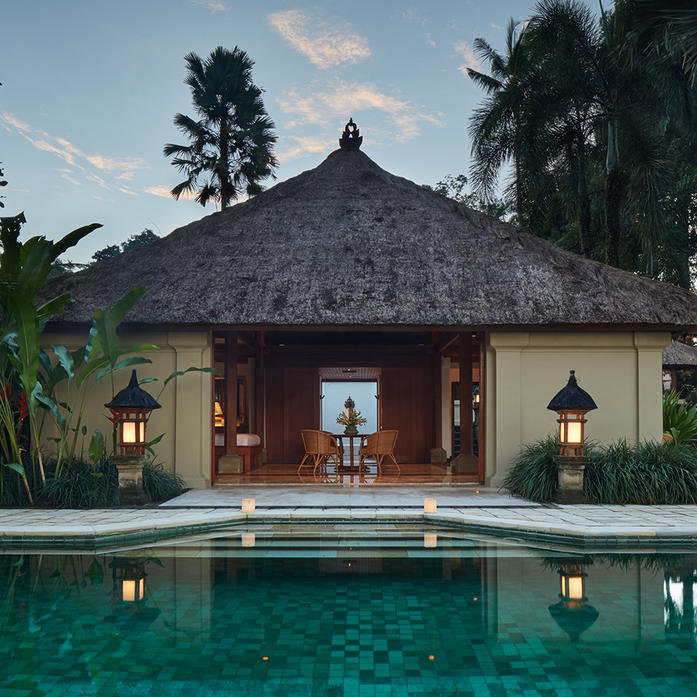 Номер с садом и бассейном. Обеденная зона на открытом воздухе. К спальне примыкает гардеробная и ванная комната с двумя раковинами, глубокой ванной и тропическим душем. Кровать king-size.
