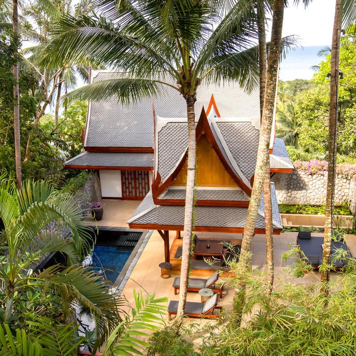 Окруженная садами и деревьями вилла с одной спальней, террасой и бассейном. Кровать king-size. Обеденная зона на открытом воздухе. Просторная ванная комната с глубокой ванной и двумя раковинами.