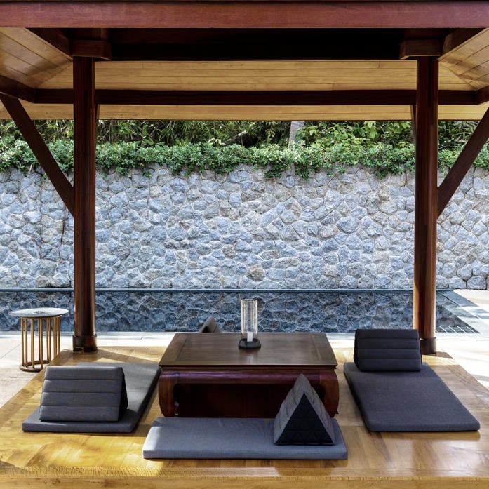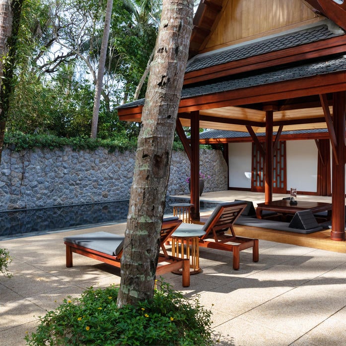 Окруженная садами и деревьями вилла с одной спальней, террасой и бассейном. Кровать king-size. Обеденная зона на открытом воздухе. Просторная ванная комната с глубокой ванной и двумя раковинами.