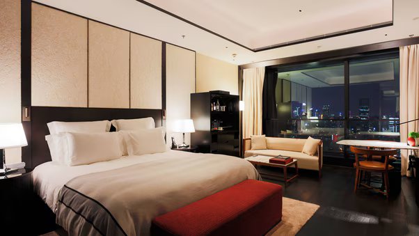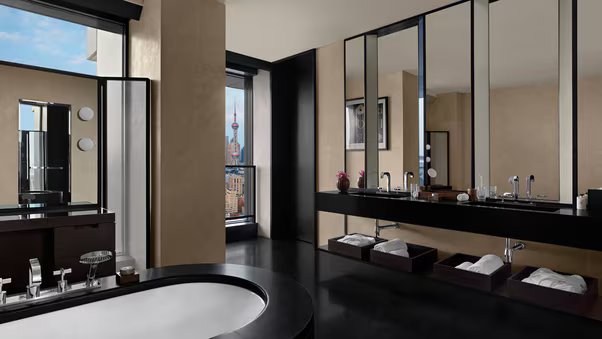 Несмотря на неотразимую красоту внутри, главное здесь — виды, от которых буквально подкашиваются ноги. Отель стоит на берегу реки, возвышаясь над Китайской торговой палатой и открывая панорамы исторической набережной, футуристических видов Пудуна и впечатляющего сочетания небоскребов и красных крыш Пуси.