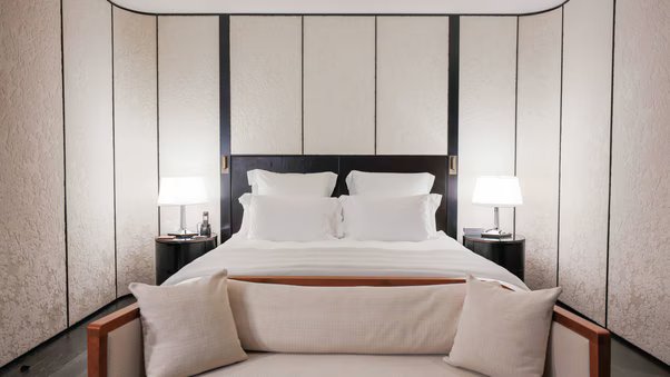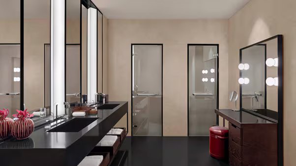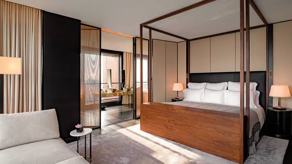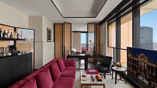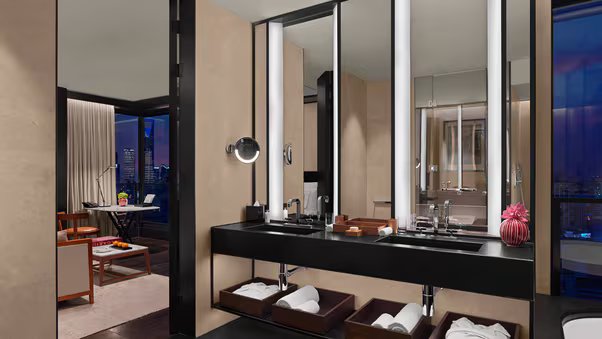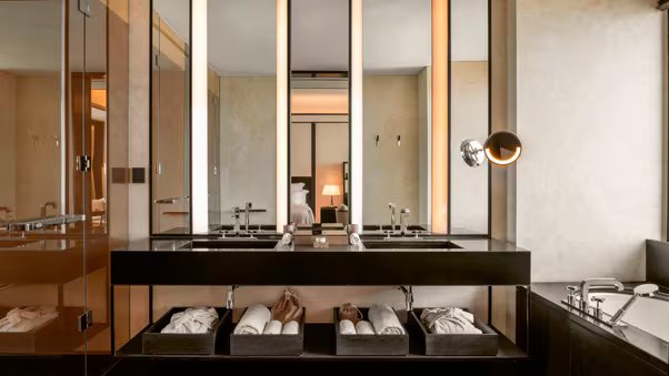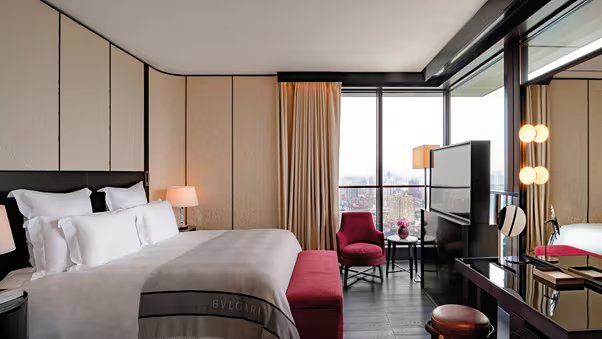 Для бренда, который так тесно связан с Римом, Bvlgari удивительно хорошо адаптируется к другим локациям — Шанхай не стал исключением. Как и его собратья в Милане, Лондоне и Пекине, отель достигает почти немыслимых высот роскоши, оставаясь при этом удивительно сдержанным и элегантным. Эстетика Bvlgari повсюду: от винтажных черно-белых снимков над камином до погруженных в полумрак лифтов и искусно разложенных на кроватях пледов. Если вы не чувствовали себя в Риме минуту назад, до того, как вошли через триумфальную арку, то теперь уж точно — перед вами Италия во всей красе. Немного закружилась голова? Присаживайтесь, ваш негрони для восстановления равновесия уже готовят.