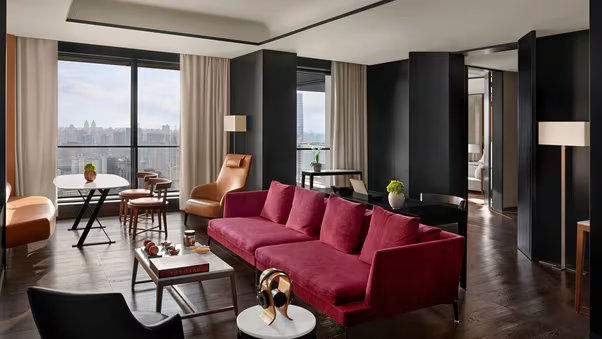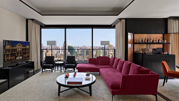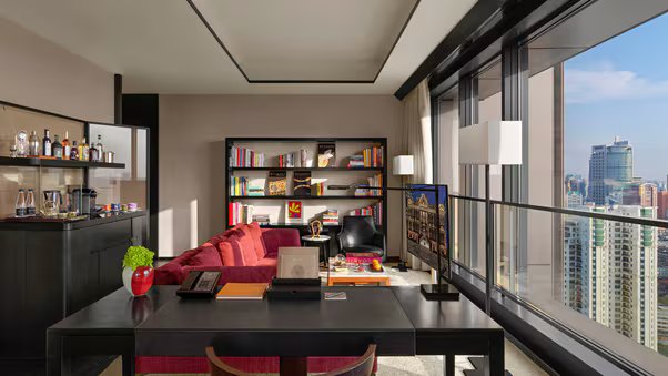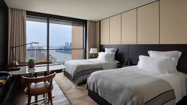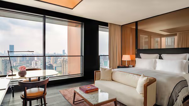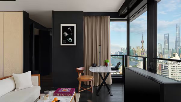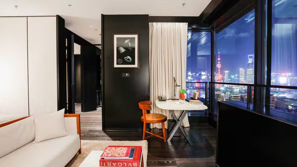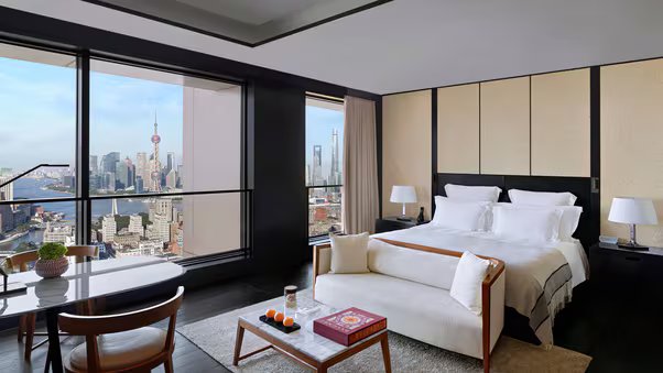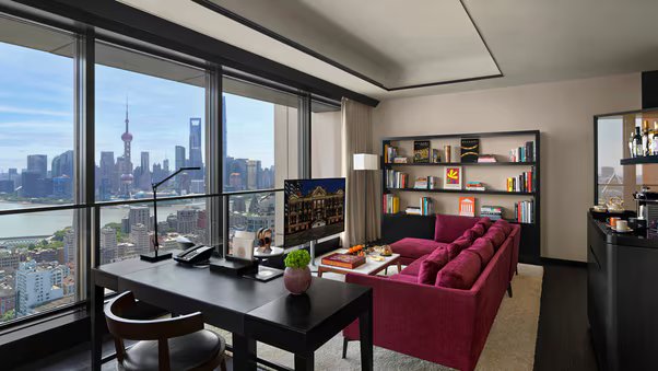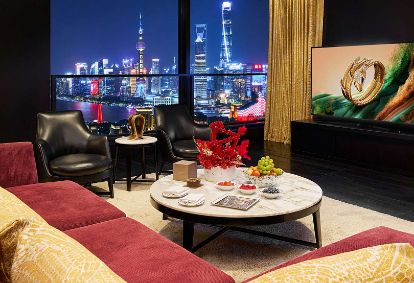 Несмотря на неотразимую красоту внутри, главное здесь — виды, от которых буквально подкашиваются ноги. Отель стоит на берегу реки, возвышаясь над Китайской торговой палатой и открывая панорамы исторической набережной, футуристических видов Пудуна и впечатляющего сочетания небоскребов и красных крыш Пуси.