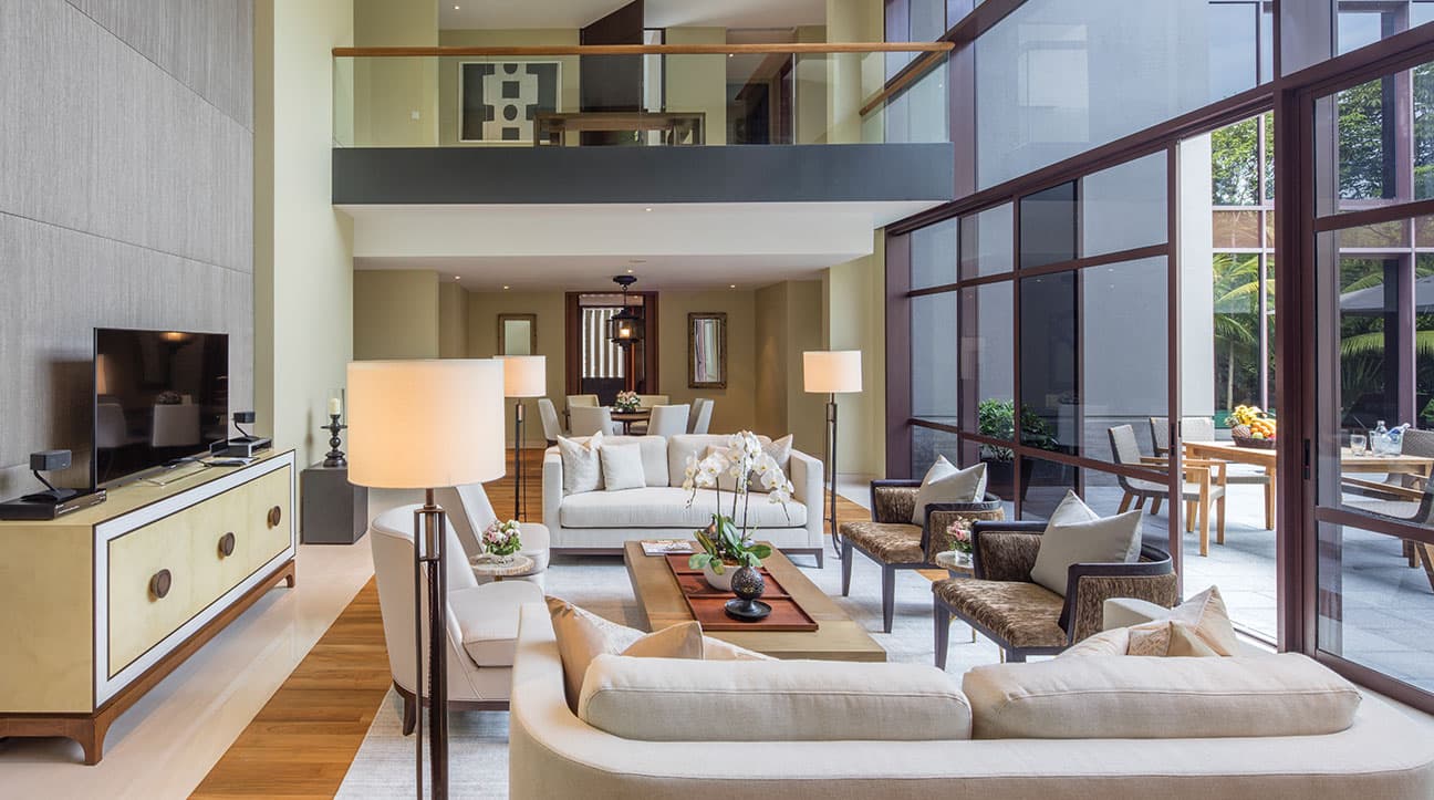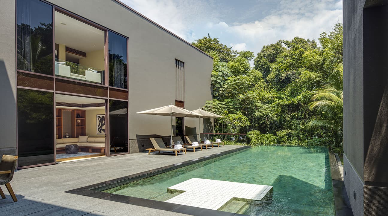 Двухэтажная усадьба с тремя спальнями и бассейном. Отдельнаz гостиная, терраса с шезлонгами, кухня, офис и гостевой туалет. К каждой спальне примыкает ванная комната.