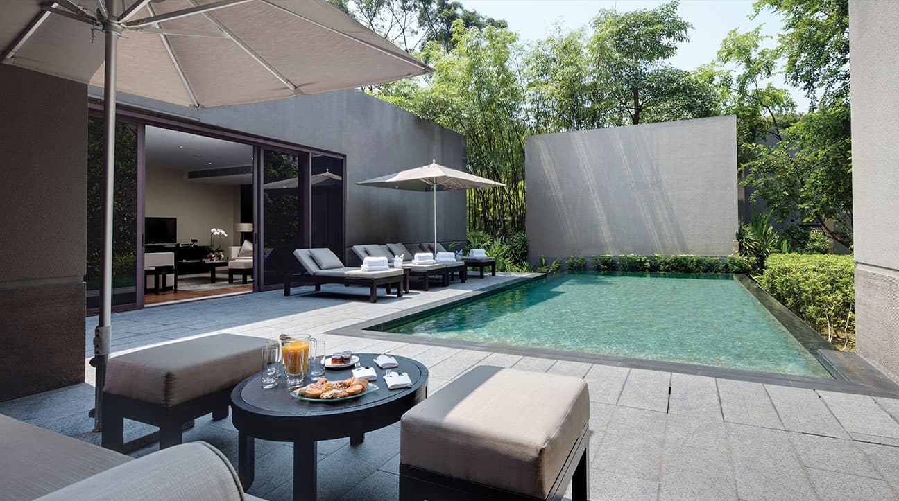 Двухэтажная усадьба с тремя спальнями и бассейном. Отдельнаz гостиная, терраса с шезлонгами, кухня и гостевой туалет. К каждой спальне примыкает ванная комната.