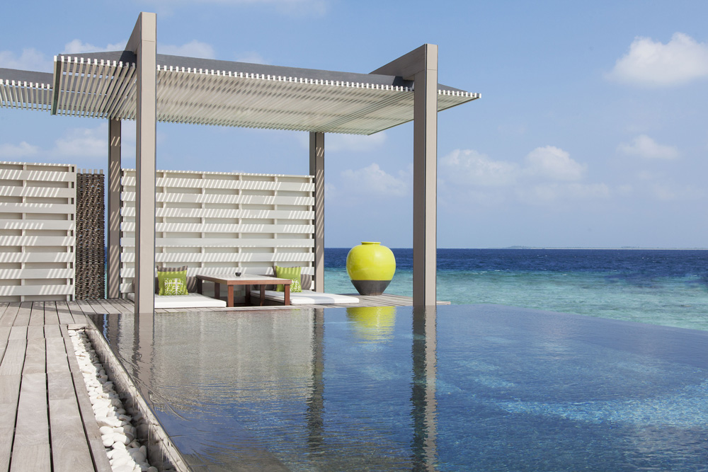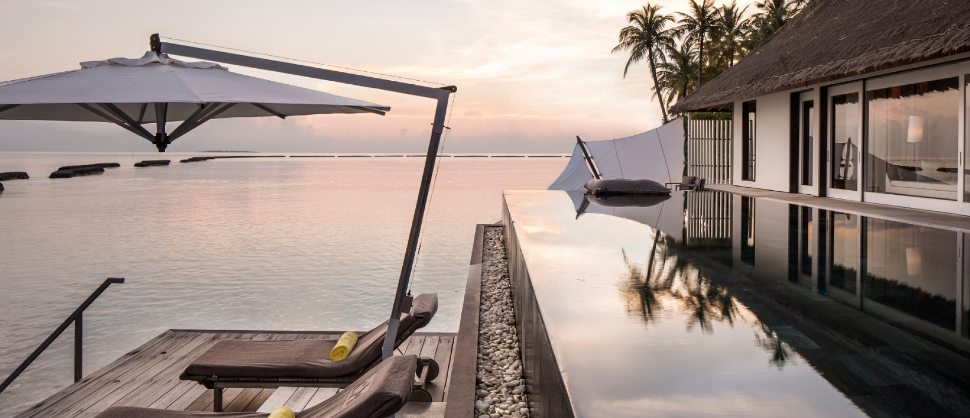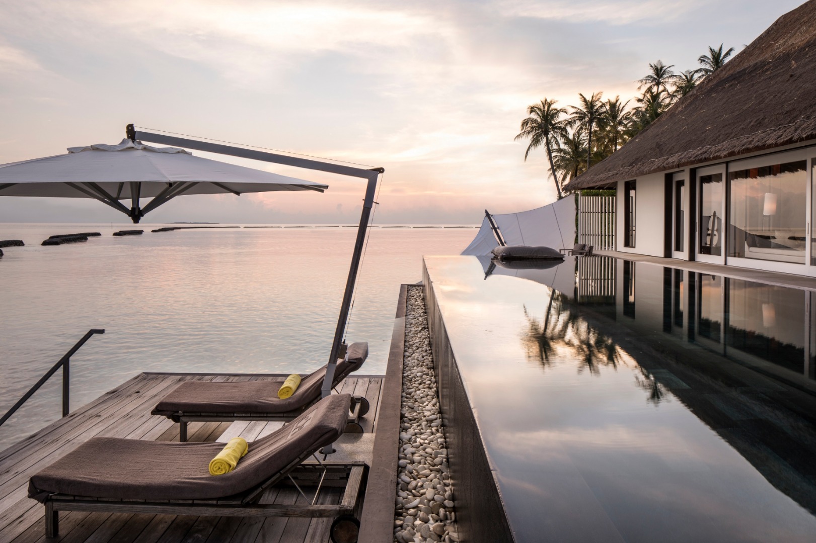 Уединенная вилла на сваях идеально подойдет для пар и тех, кто хочет провести побольше времени в уединении. Просторная гостиная с панорамными окнами, спальня, в которой примыкает гардеробная и ванная комната с двумя раковинами, ванной и тропическим душем. Большая терраса с шезлонгами, гамаком и инфинити-бассейном. Гостевой туалет.