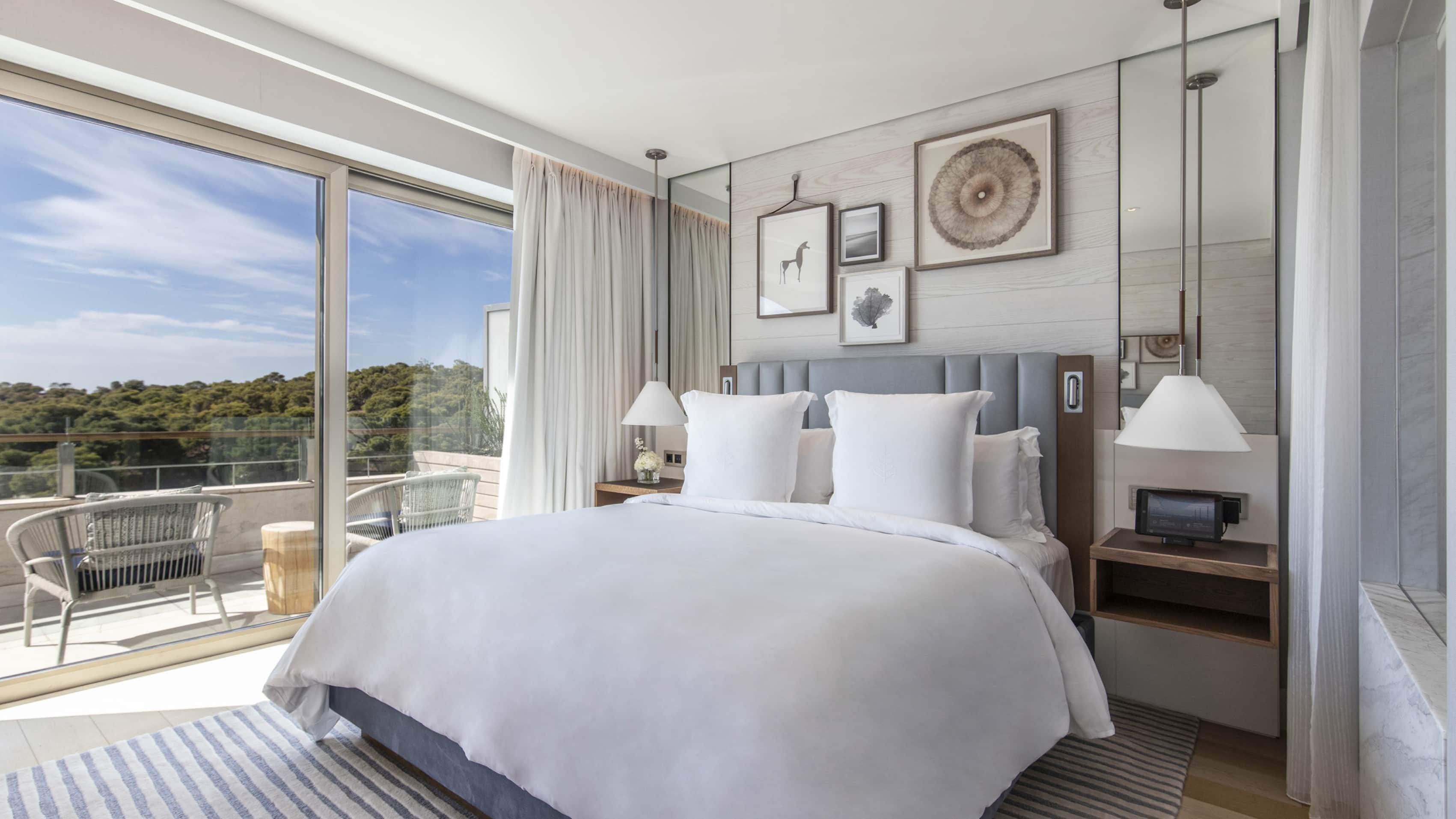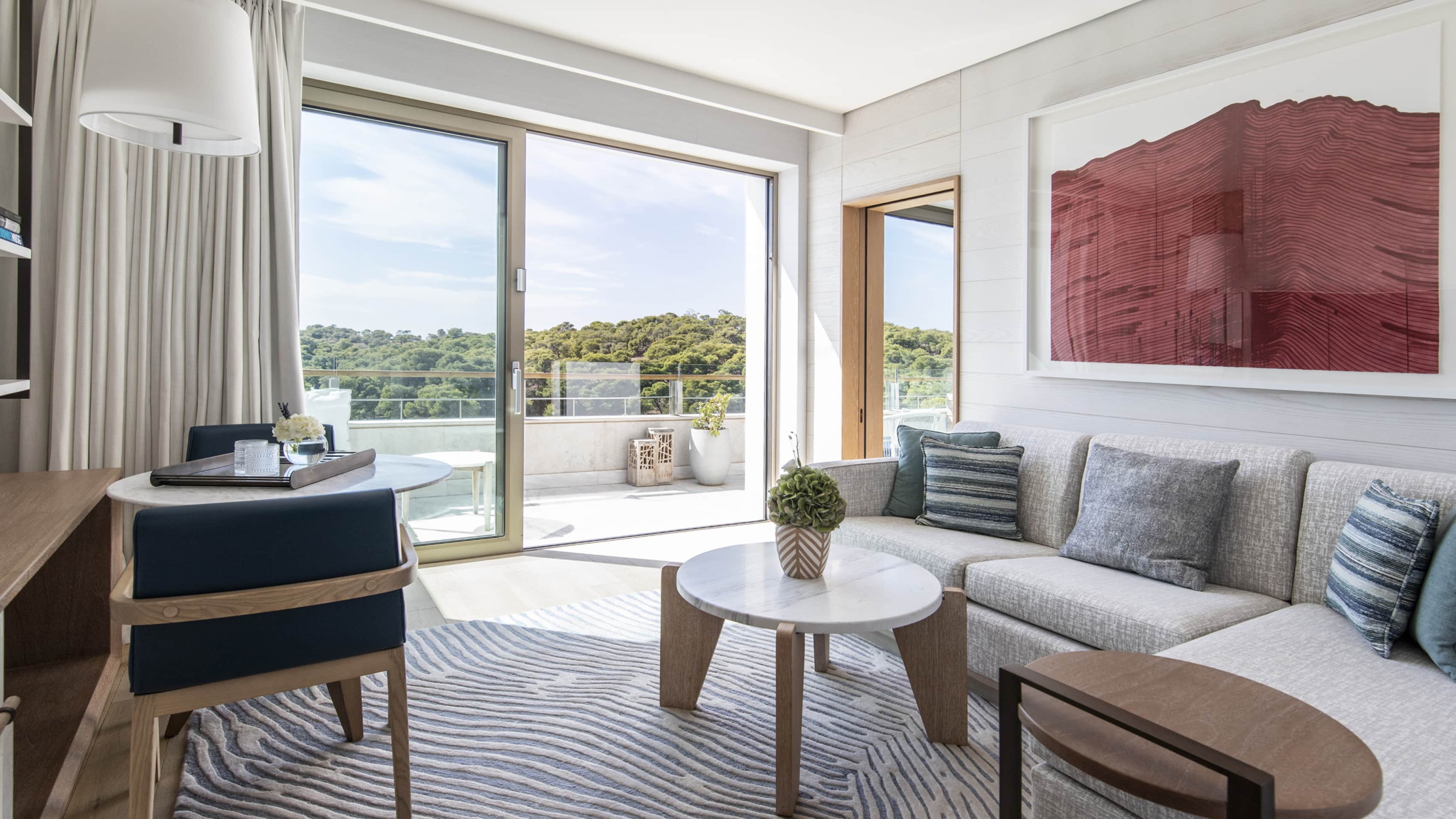 Номер с отдельной гостиной, террасой и видом на сосновую рощу. Кровать king-size. Глубокая ванна, две раковины и отдельный душ в ванной комнате.