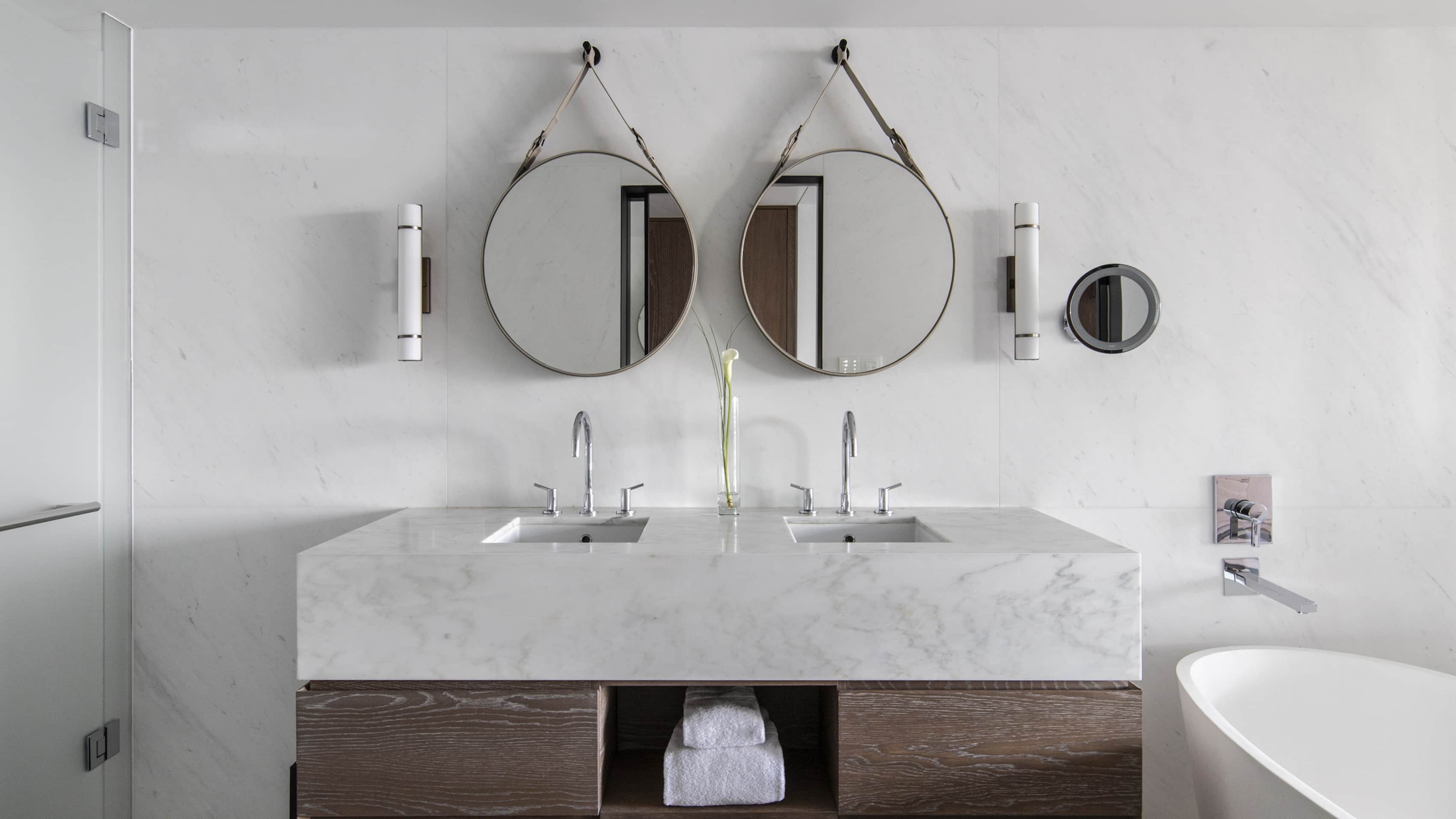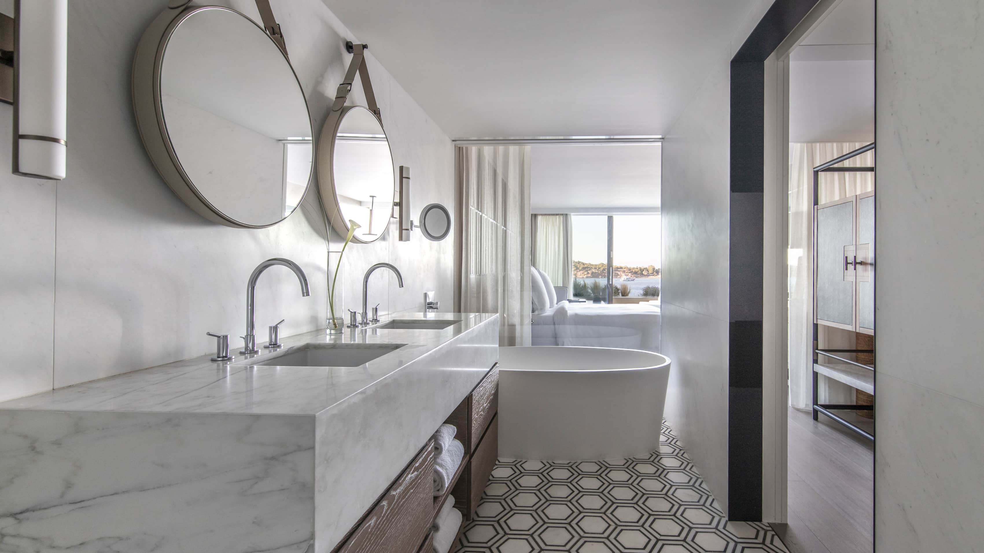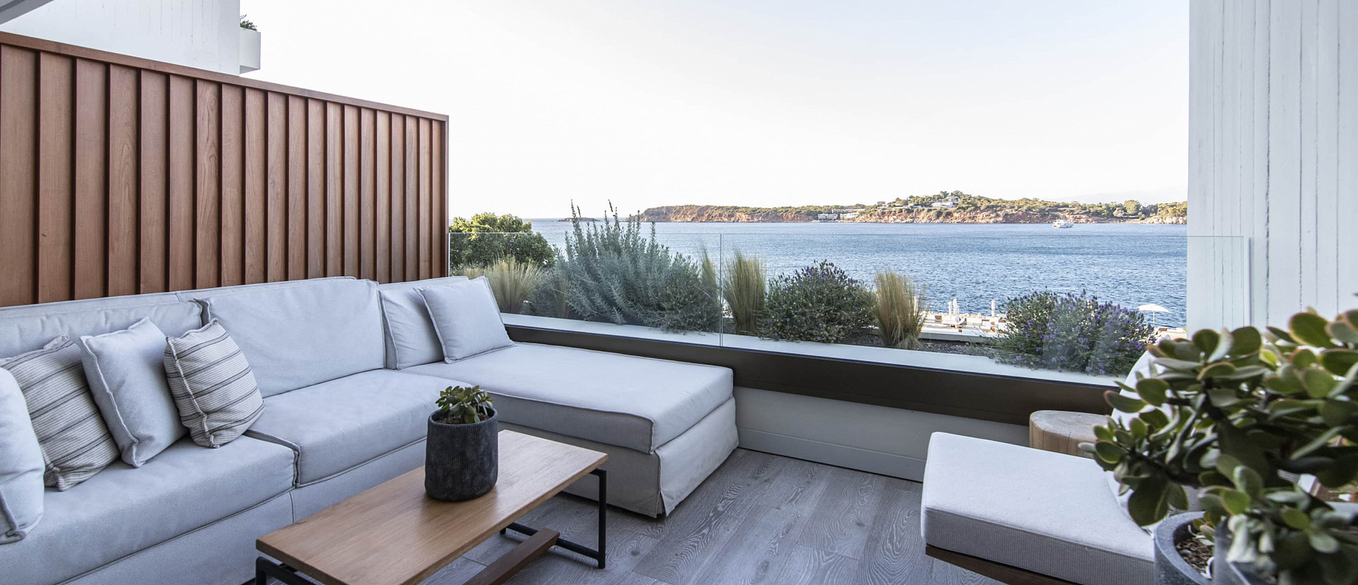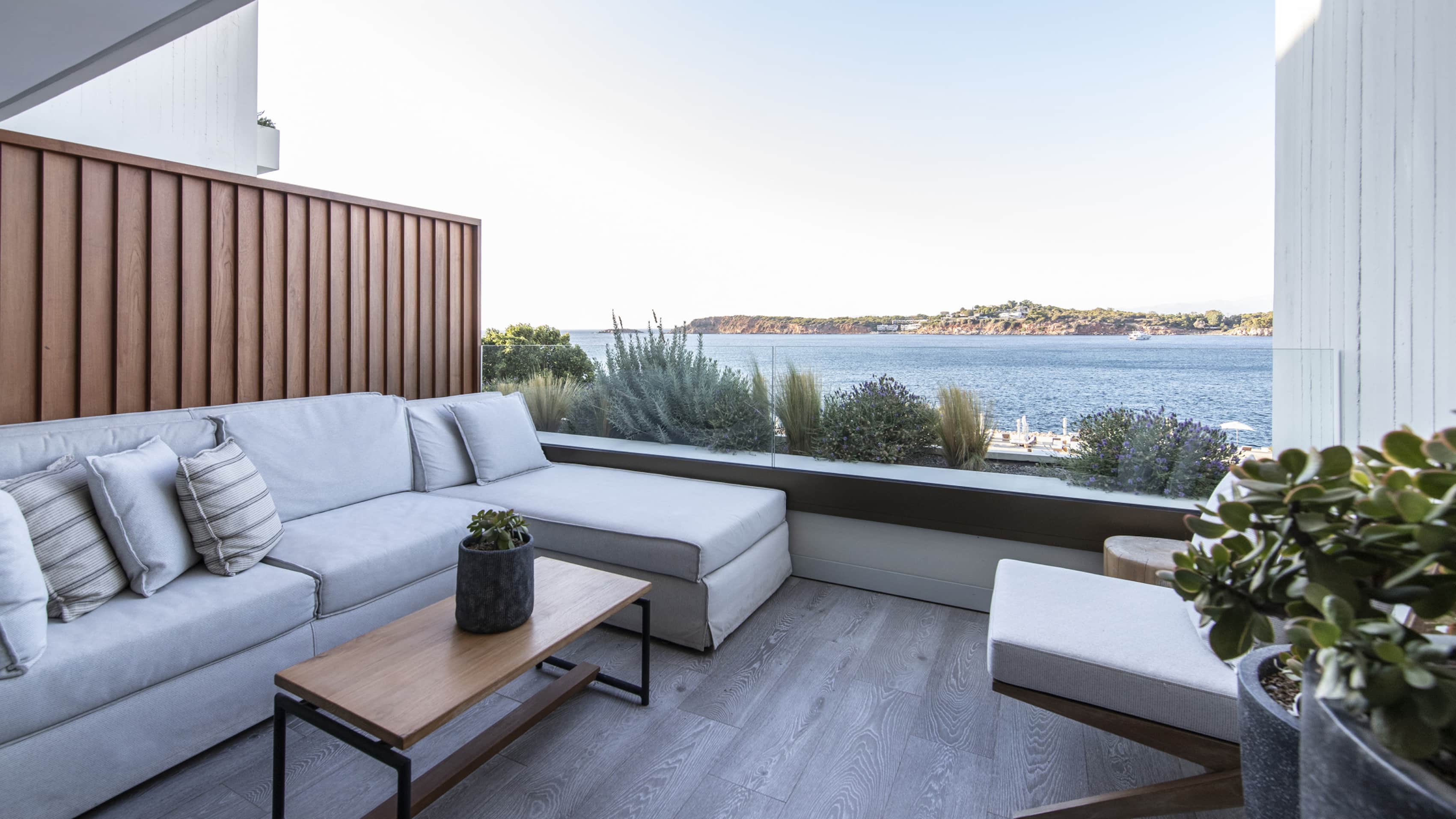 Просторный номер с меблированной террасой и видом на море. Кровать king-size. Две раковины, глубокая ванна и отдельный душ в ванной комнате.