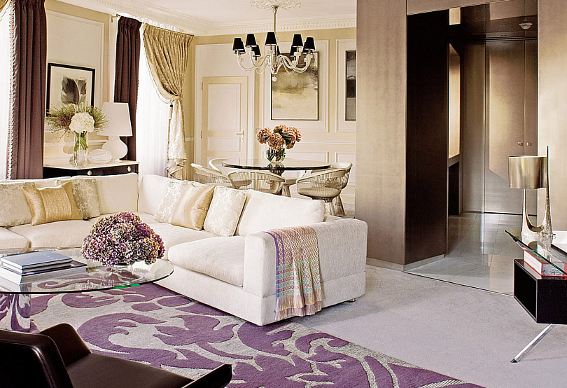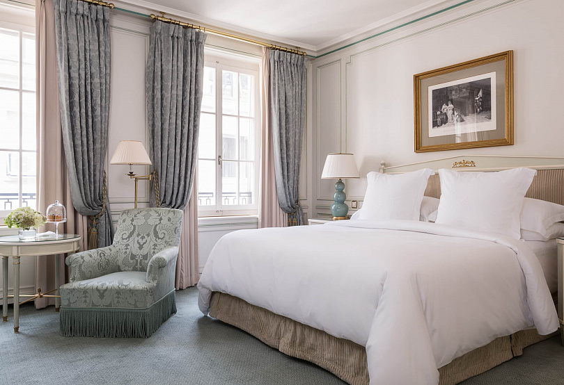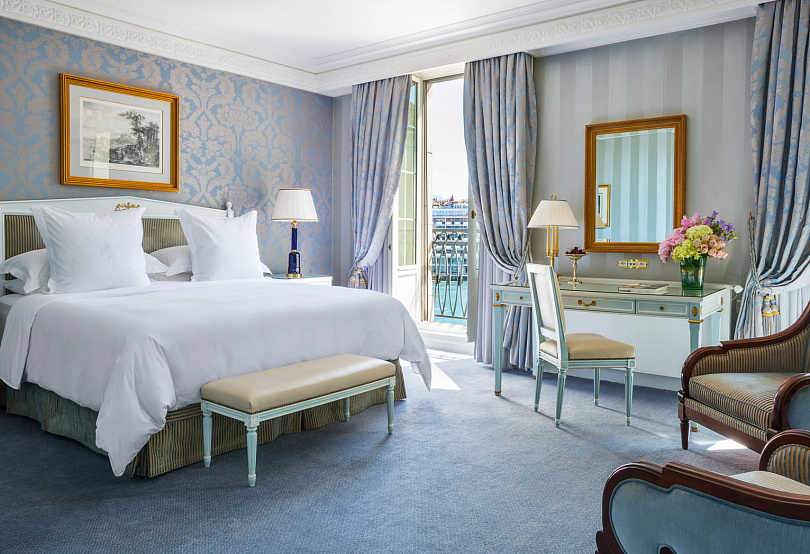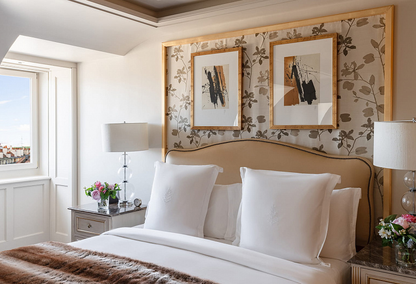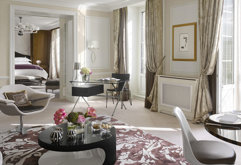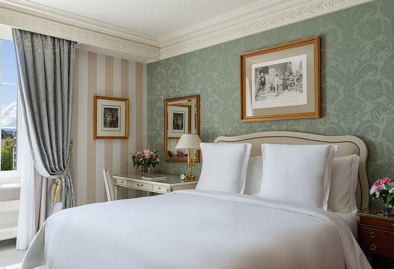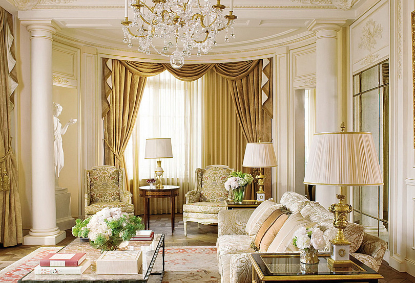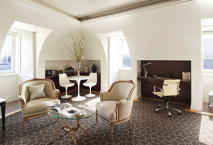 Фойе встречает мраморными полами, колоннами, украшенными кристаллами люстрами и изысканными цветочными композициями гаргантюанских размеров. Лаунж напоминает гостиную аристократа XIX века, с книжными шкафами красного дерева и обоями с изображением замков, карет и сельских пеазйжей. В номерах — антикварная мебель, спокойные оттенки и мраморные ванные комнаты.