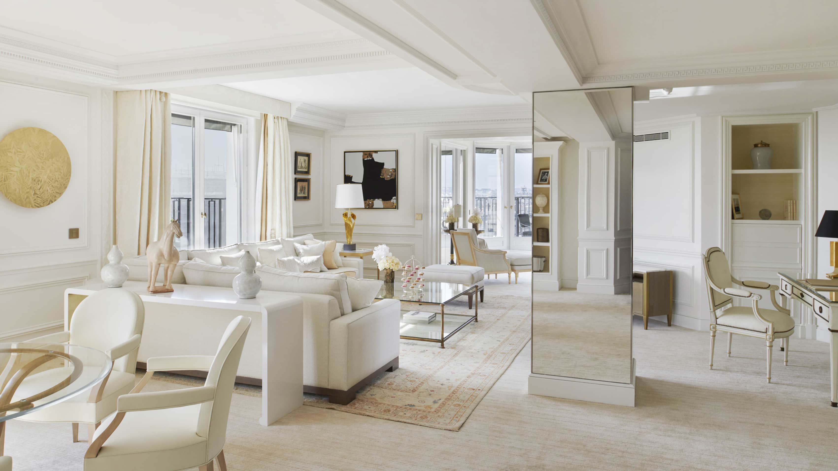 Номер на седьмом этаже отеля с несколькими террасами и панорамными видами на Эйфелеву башню. Возможна конфигурация с одной или двумя спальнями. Отдельная гостиная с обеденным столом, рабочее место.
