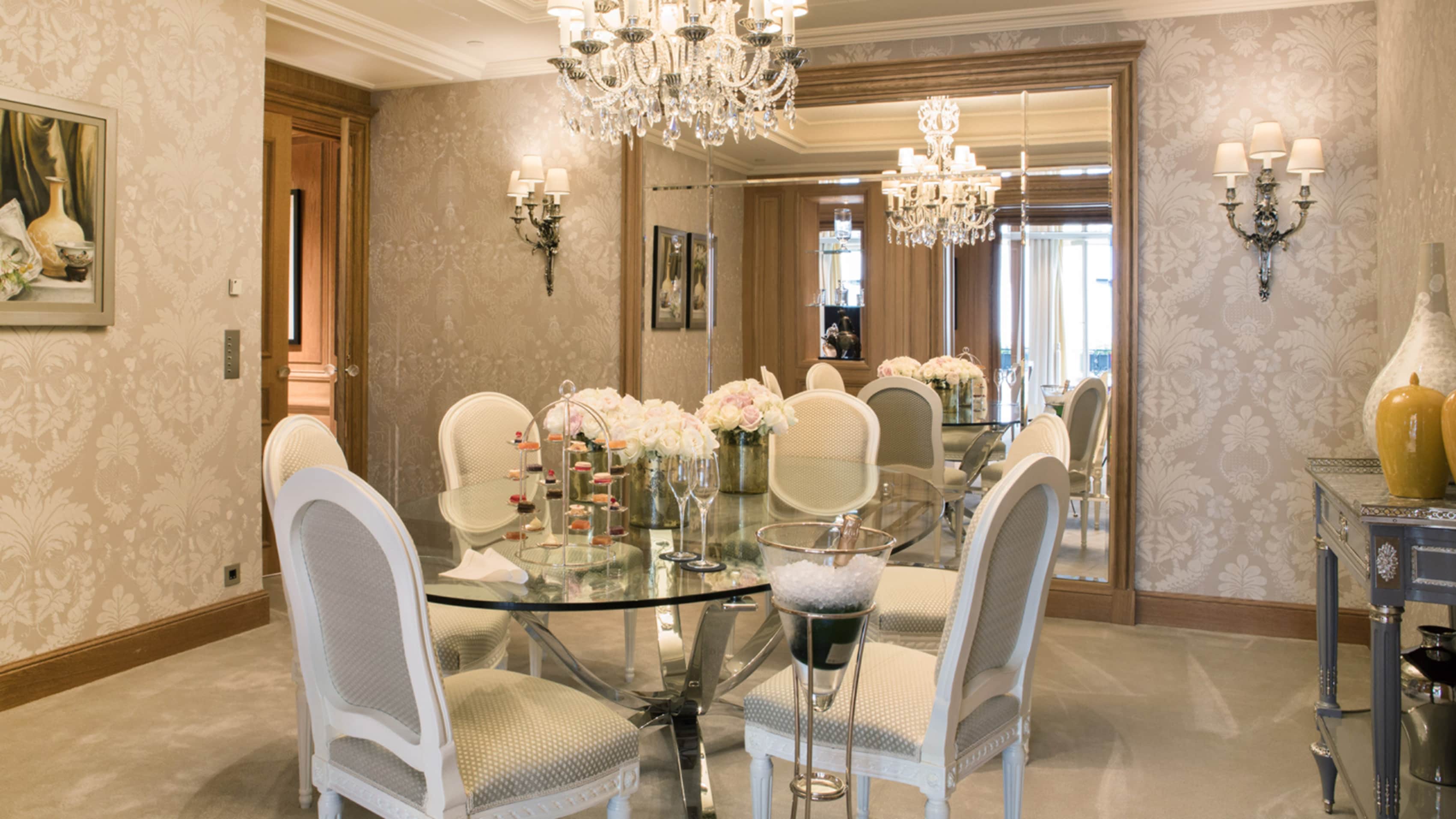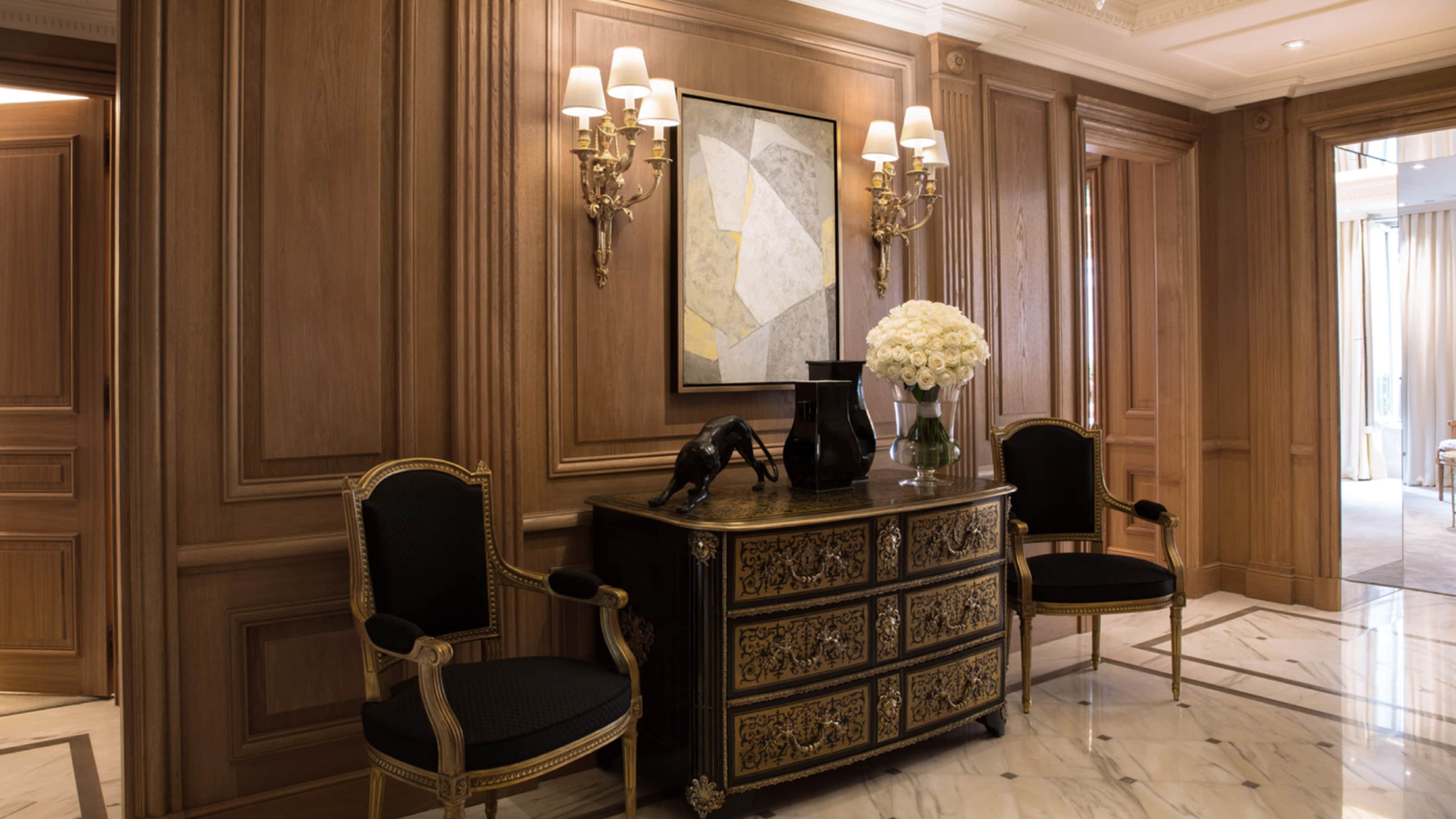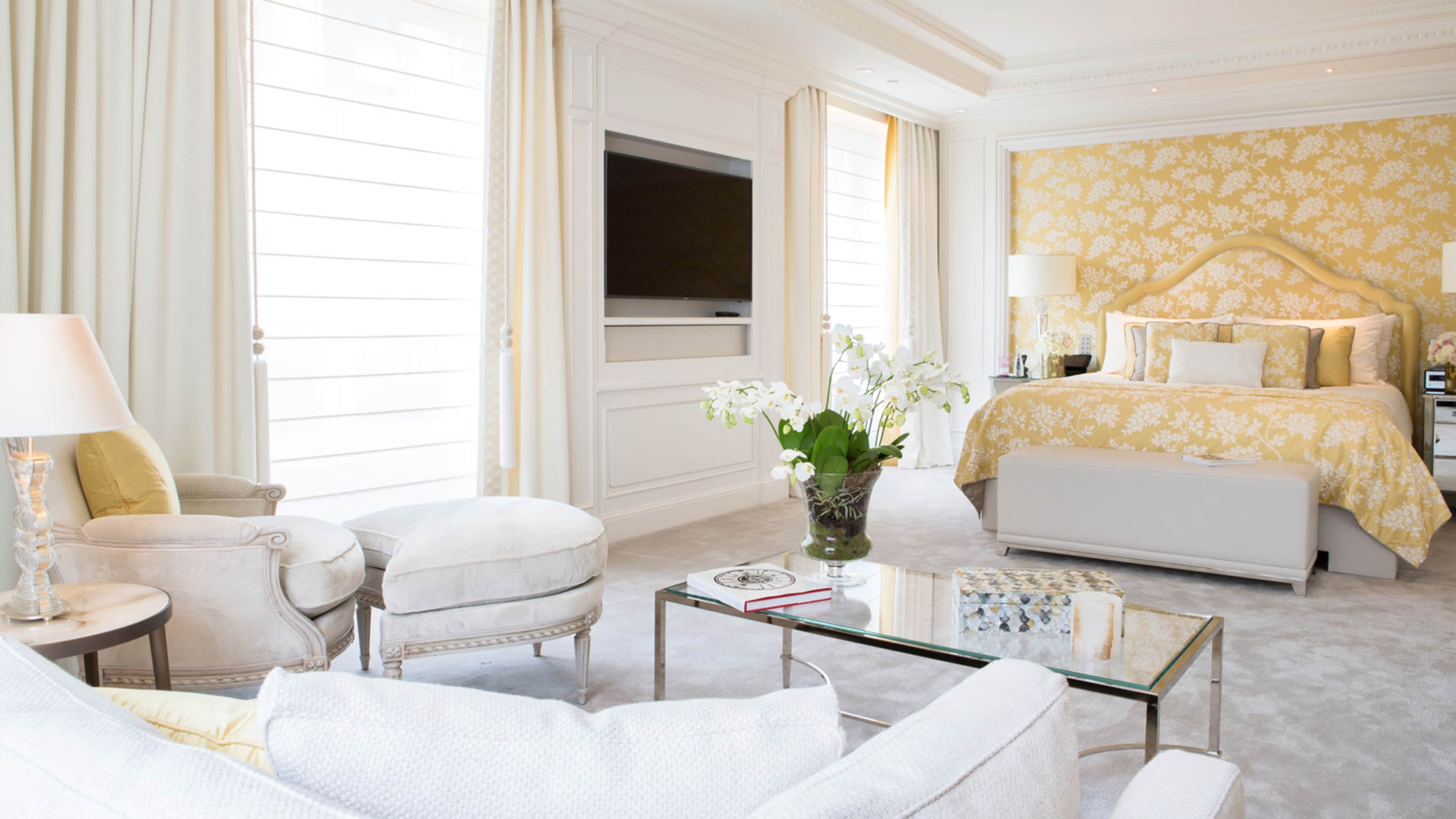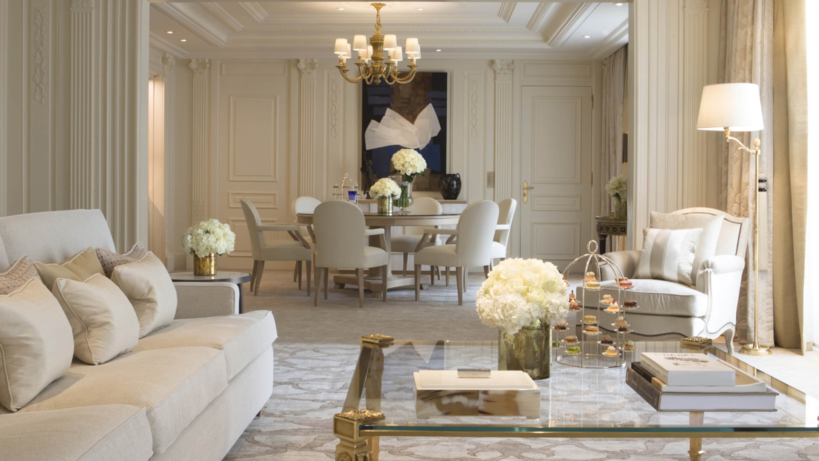 Номер доступен в конфигурациях от одной до четырех спален. Хрустальные люстры, картины французских художников и предметы искусства в каждой комнате. Большая гостиная с рабочей и обеденной зоной. К спальне примыкает гардеробная. Хаммам, две раковины, ванна и душевая кабина в ванной комнате. Есть гостевой туалет.