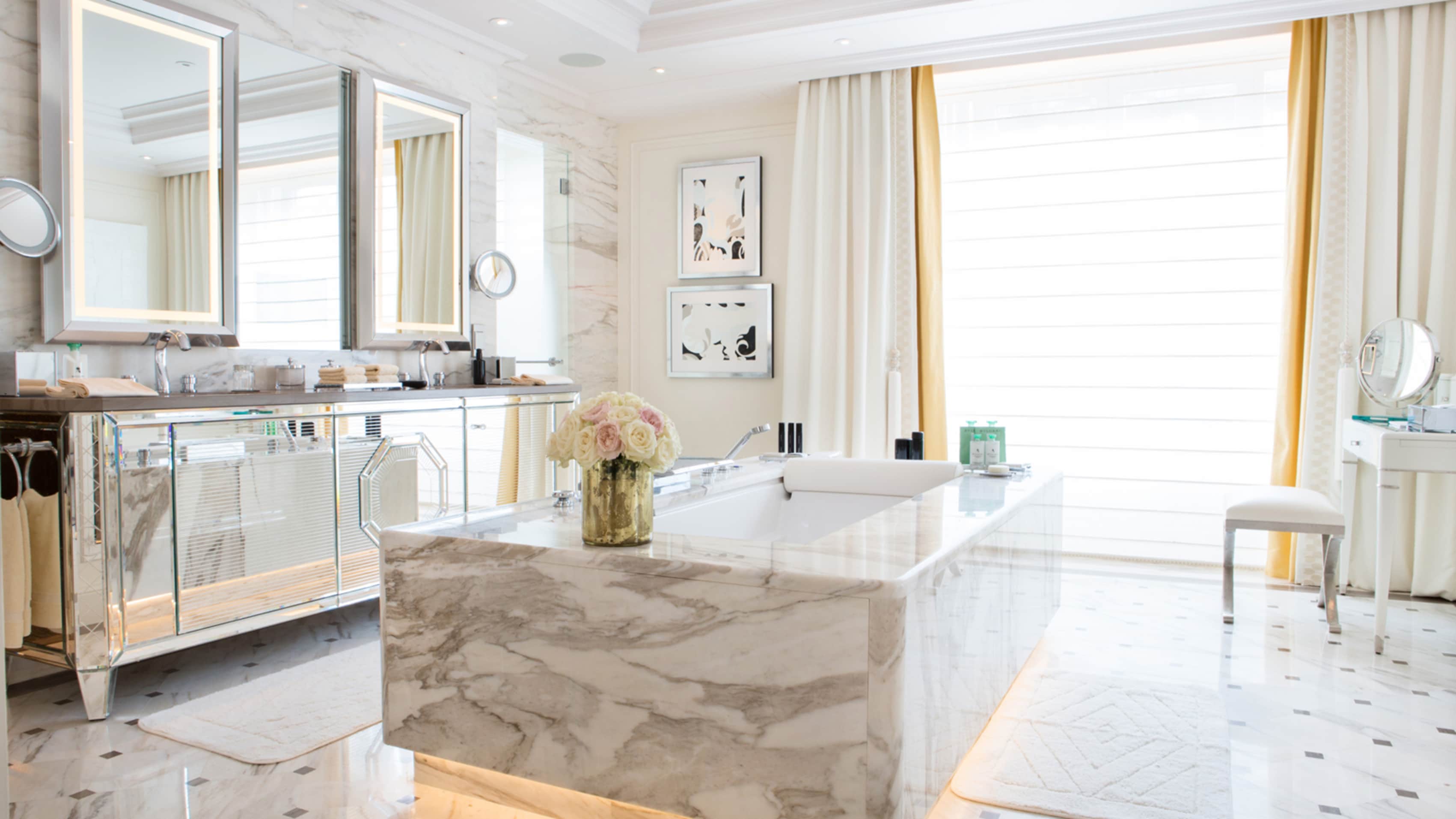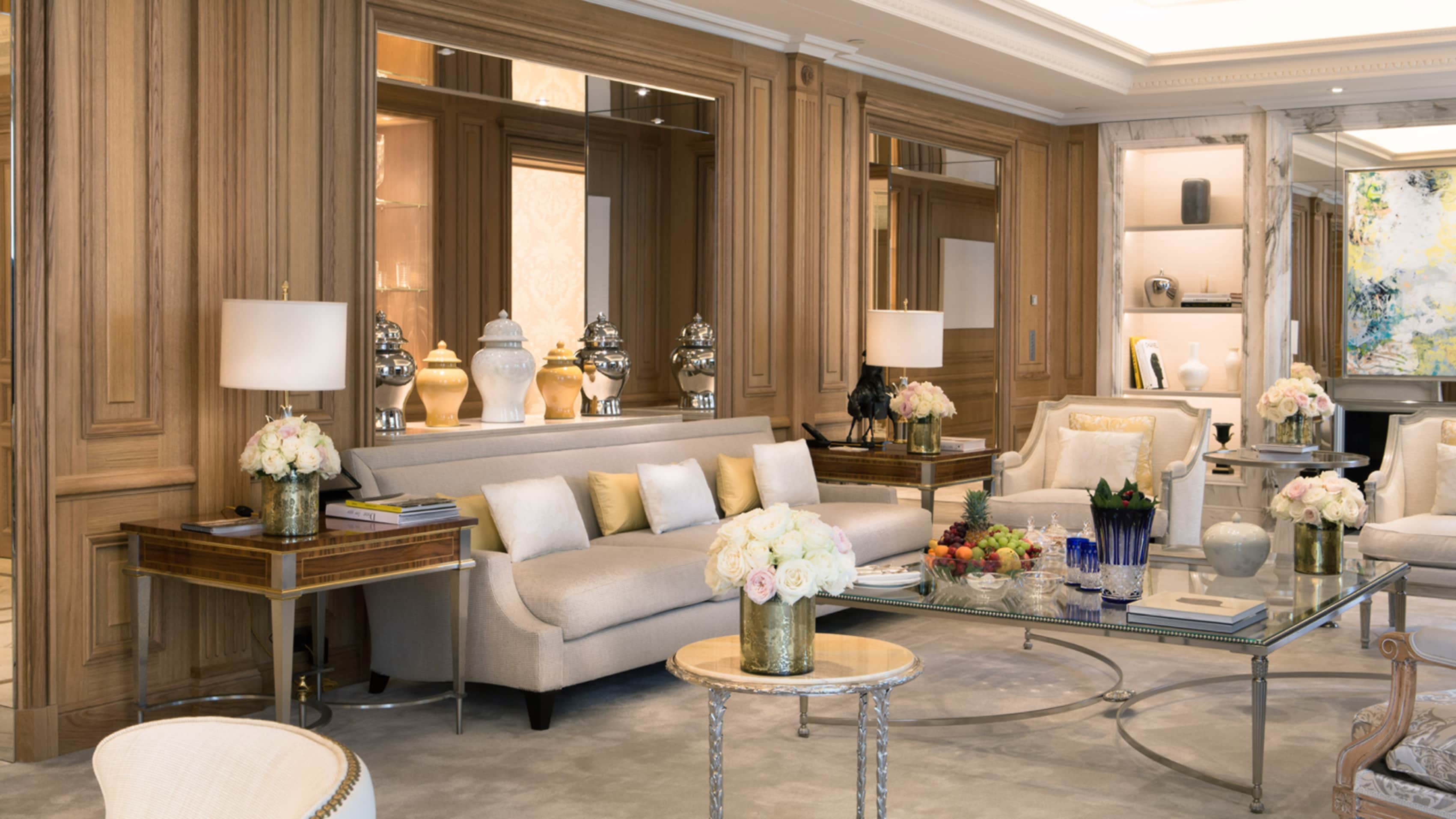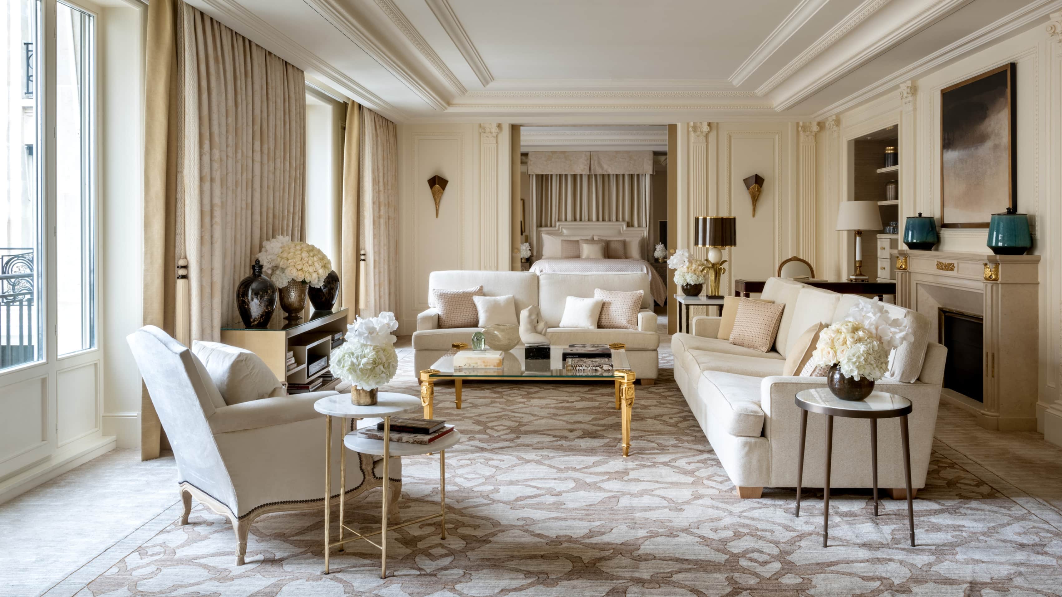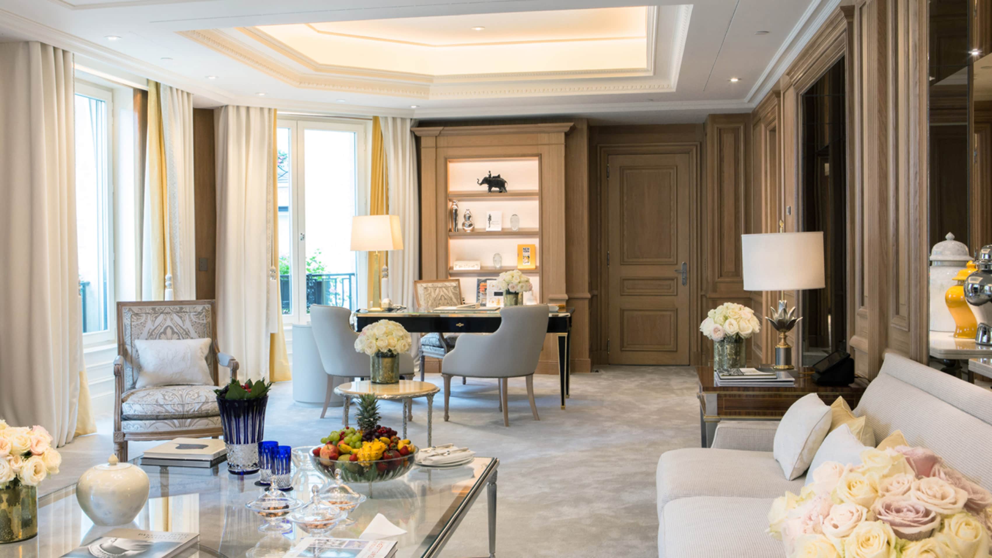 Номер доступен в конфигурациях от одной до четырех спален. Хрустальные люстры, картины французских художников и предметы искусства в каждой комнате. Большая гостиная с рабочей и обеденной зоной. К спальне примыкает гардеробная. Хаммам, две раковины, ванна и душевая кабина в ванной комнате. Есть гостевой туалет.