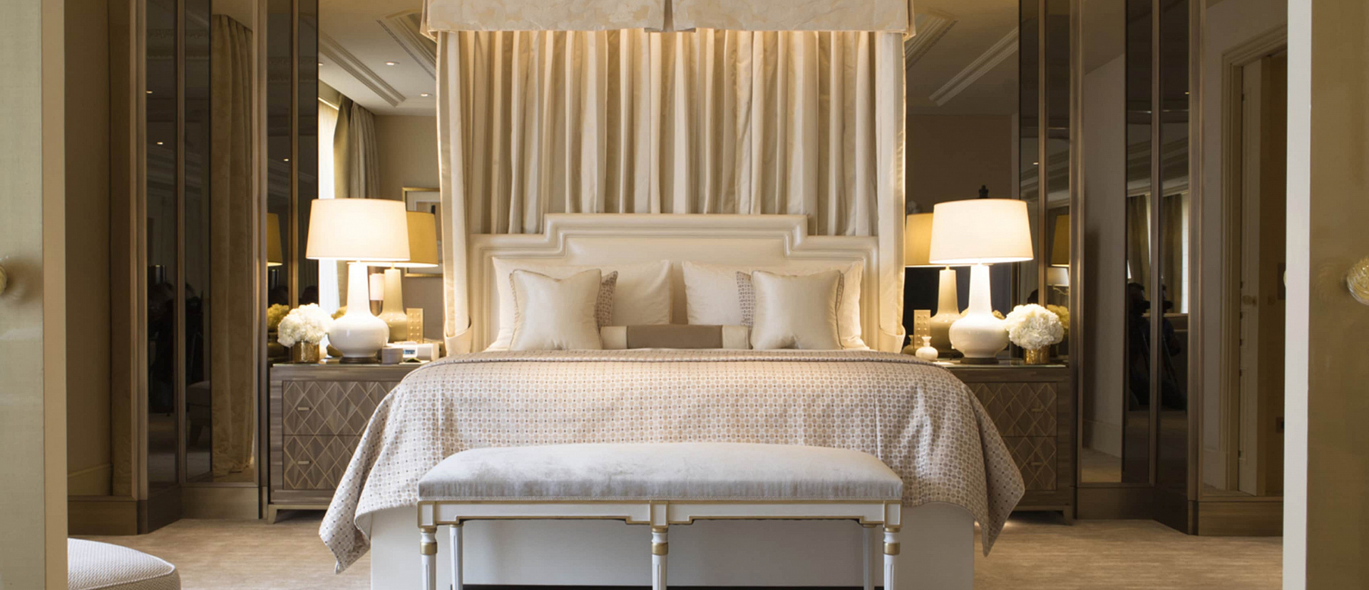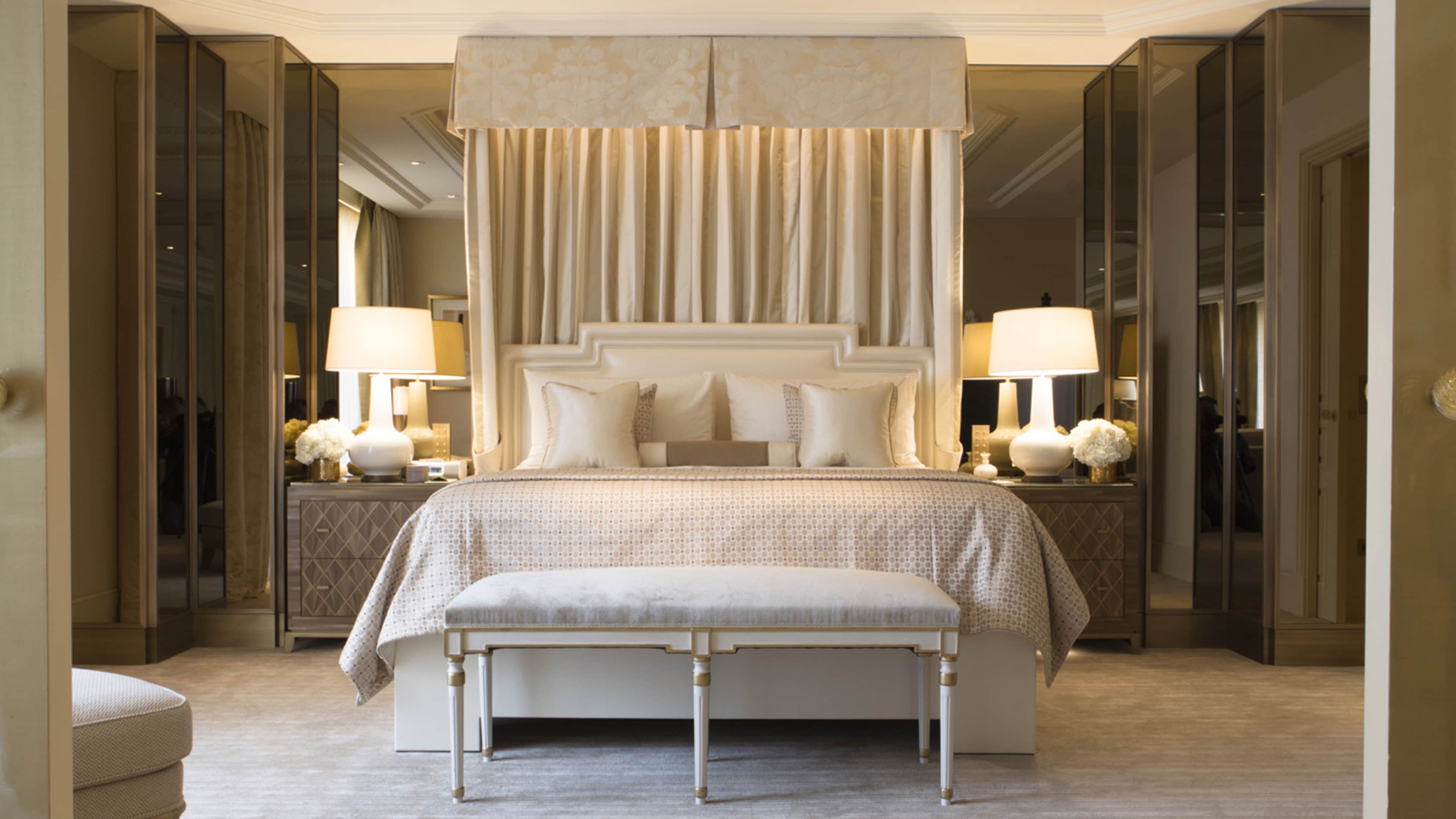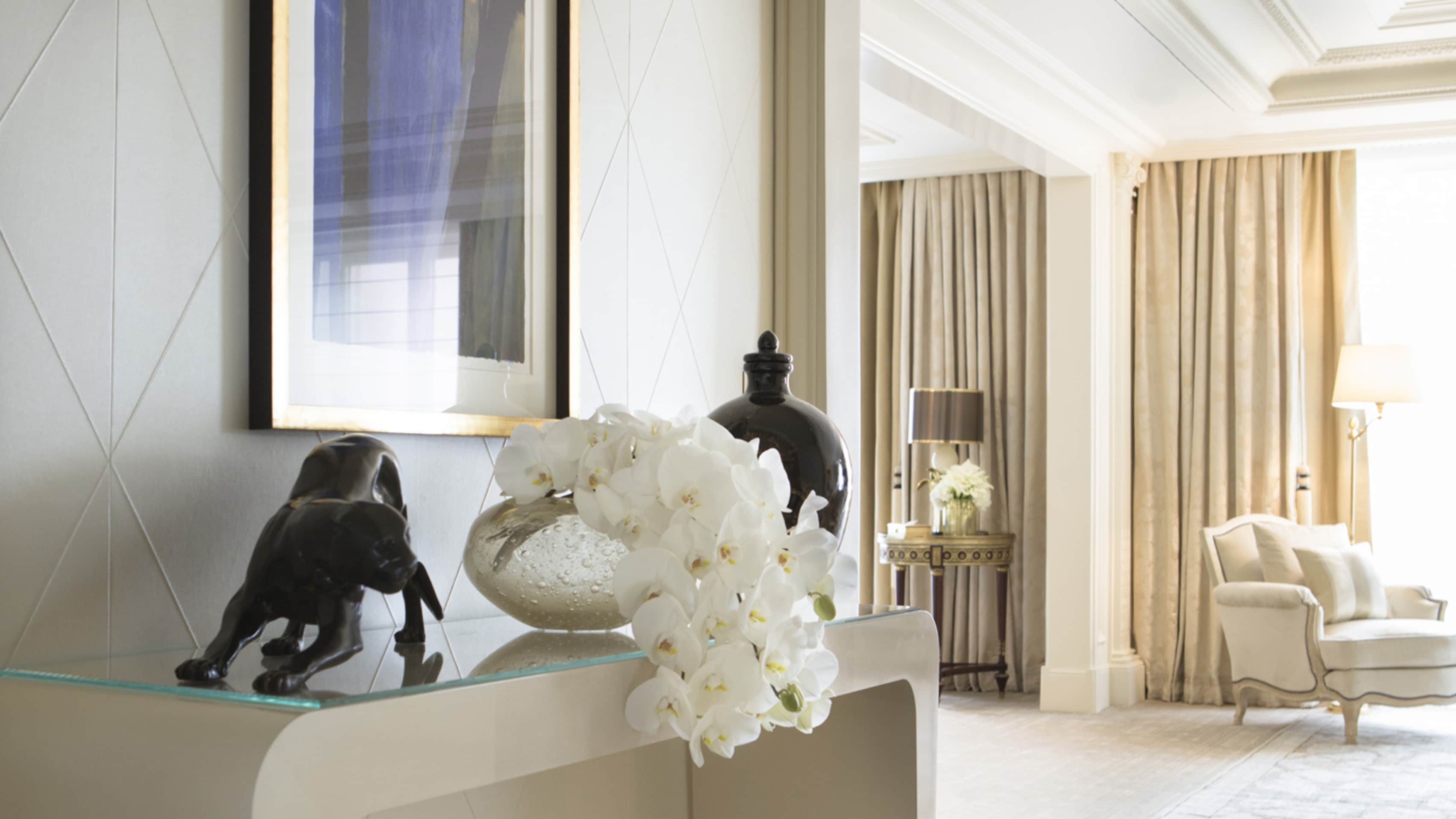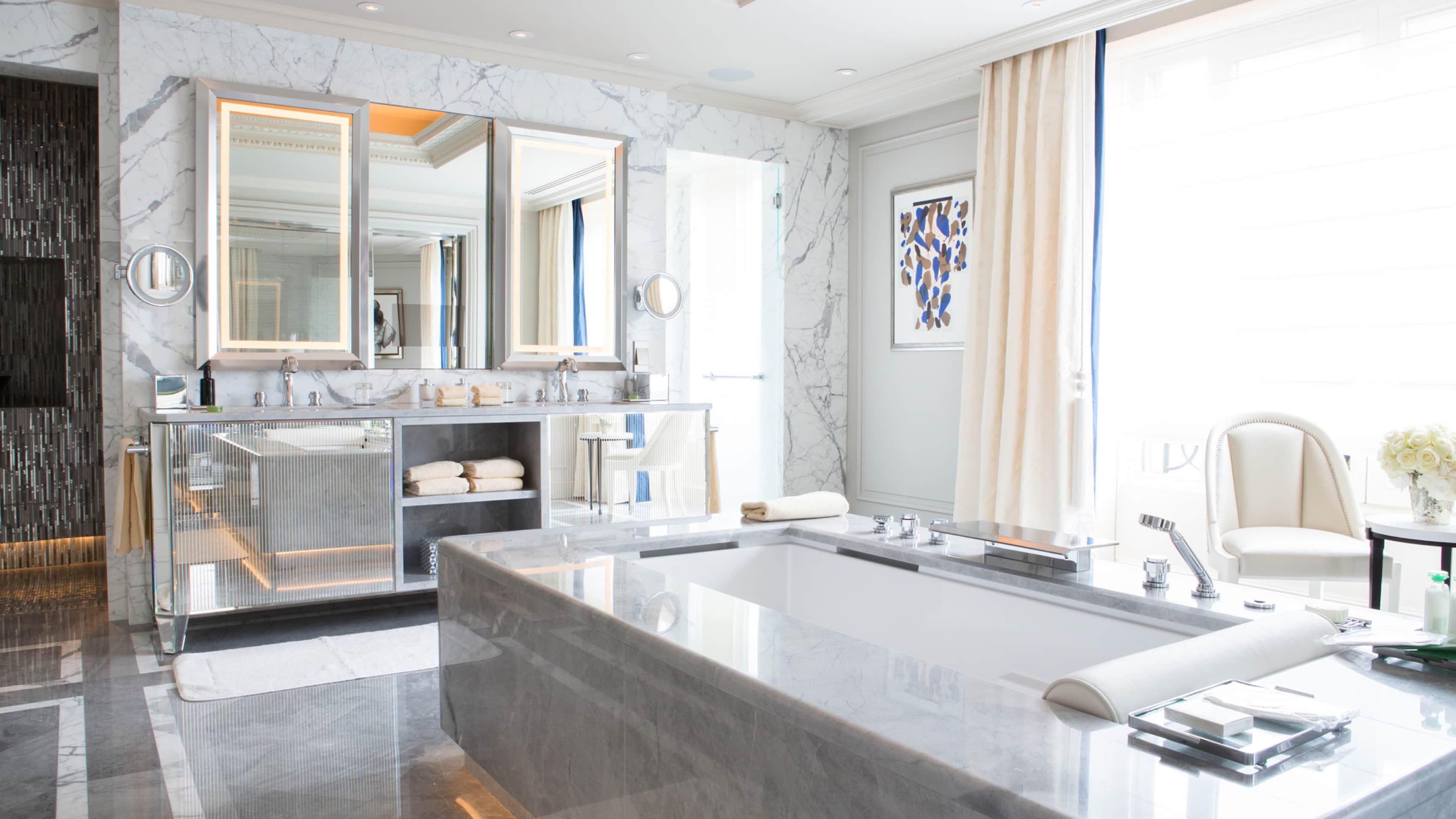 Номер доступен в конфигурациях от одной до четырех спален. Хрустальные люстры, картины французских художников и предметы искусства в каждой комнате. Большая гостиная с рабочей и обеденной зоной. К спальне примыкает гардеробная. Хаммам, две раковины, ванна и душевая кабина в ванной комнате. Есть гостевой туалет.