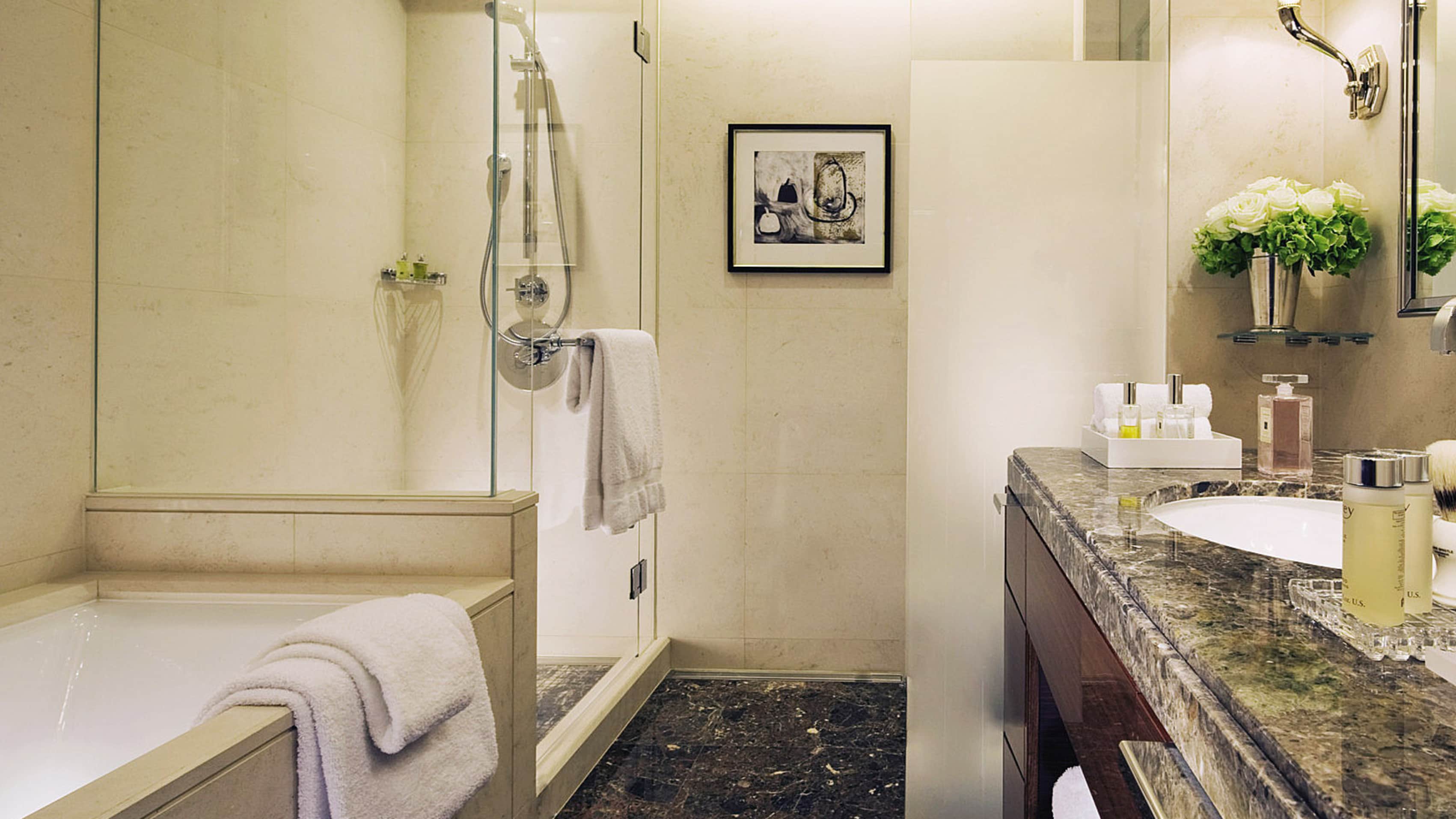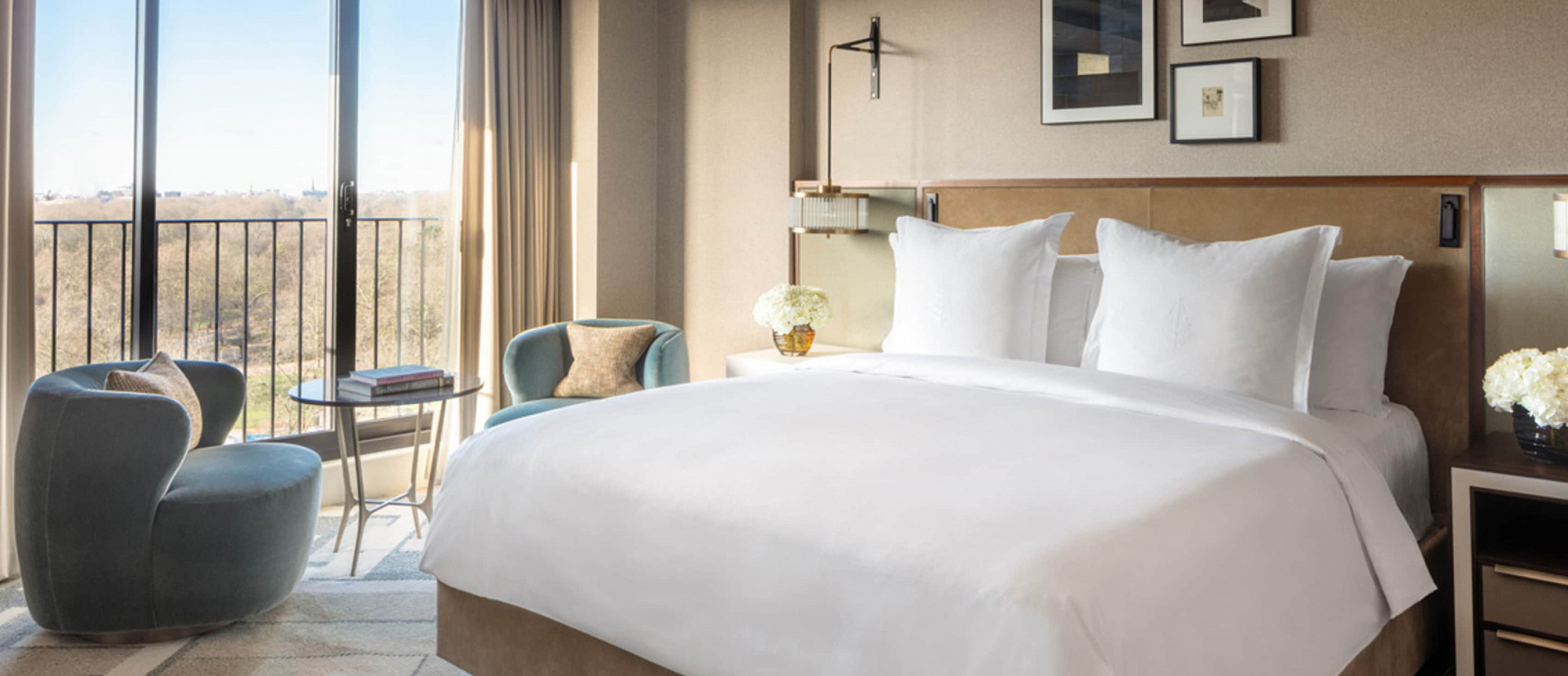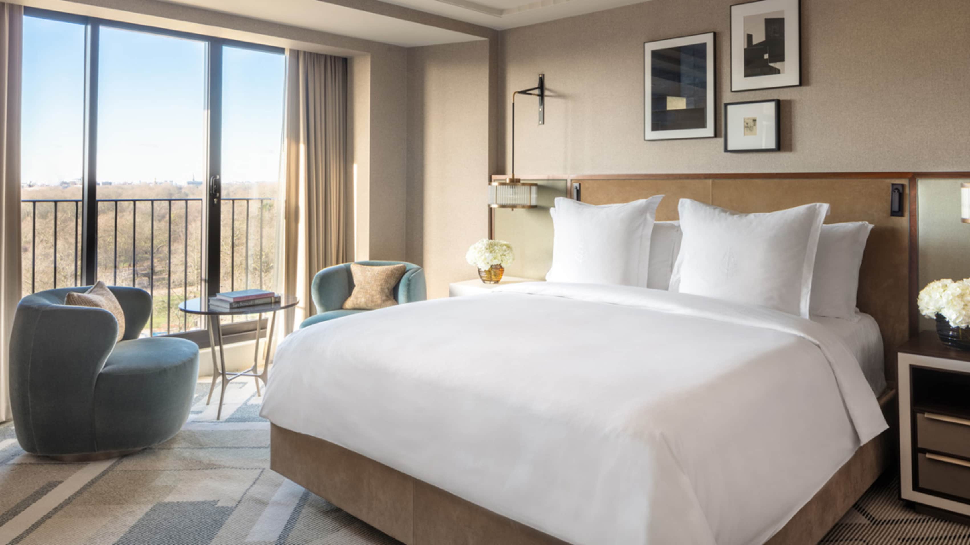 Номер в спокойной цветовой гамме с видом на парк. Доступен с двумя отдельными кроватями или одной king-size.