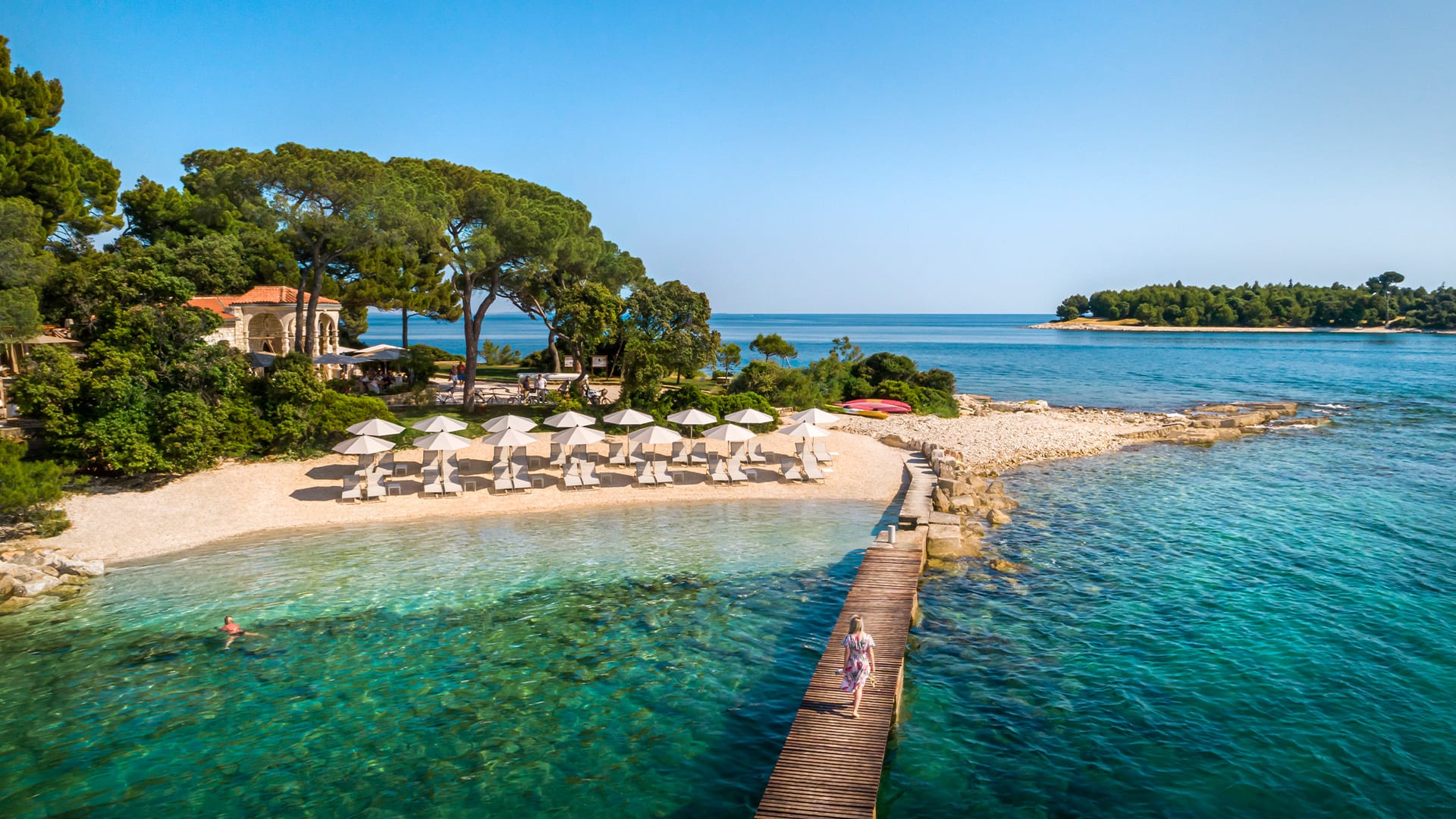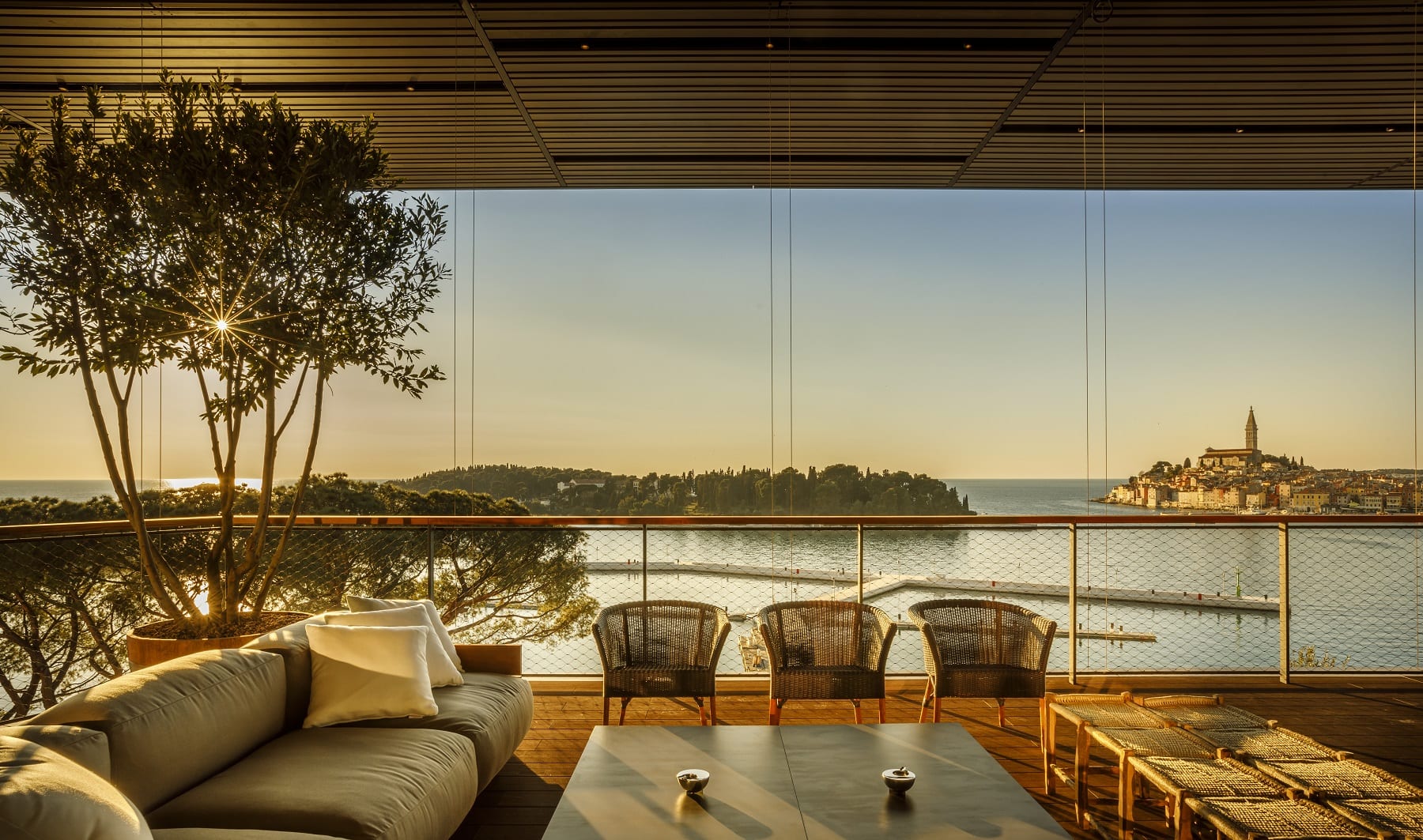До исторического центра Ровиня отсюда можно дойти пешком, а сам отель больше напоминает не курорт у моря, а убежище злодеев из голливудских фильмов в лучшем смысле: место, куда стремятся все, от эстетской молодежи до пенсионеров в льняных нарядах.