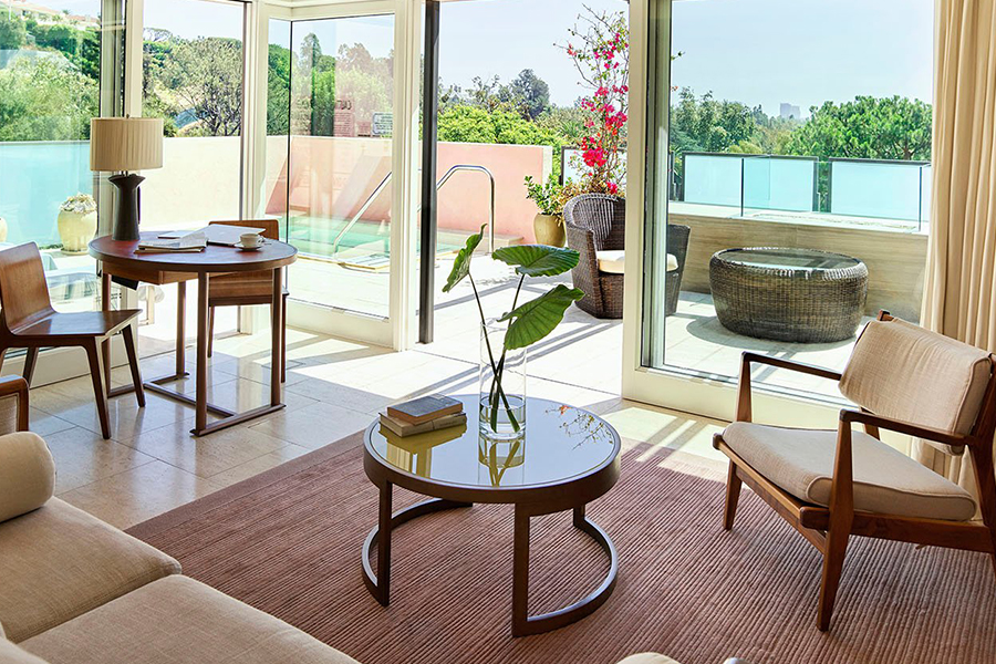 Просторный номер с террасой, камином на открытом воздухе, бассейном и видом на каньон. Кровать king-size. Глубокая ванна в ванной комнате.