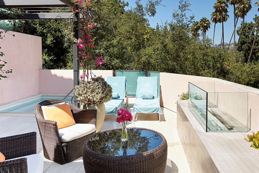 Номер с большим меблированным патио, камином на открытом воздухе, бассейном и видом на каньон. Кровать king-size. Глубокая ванна в ванной комнате.
