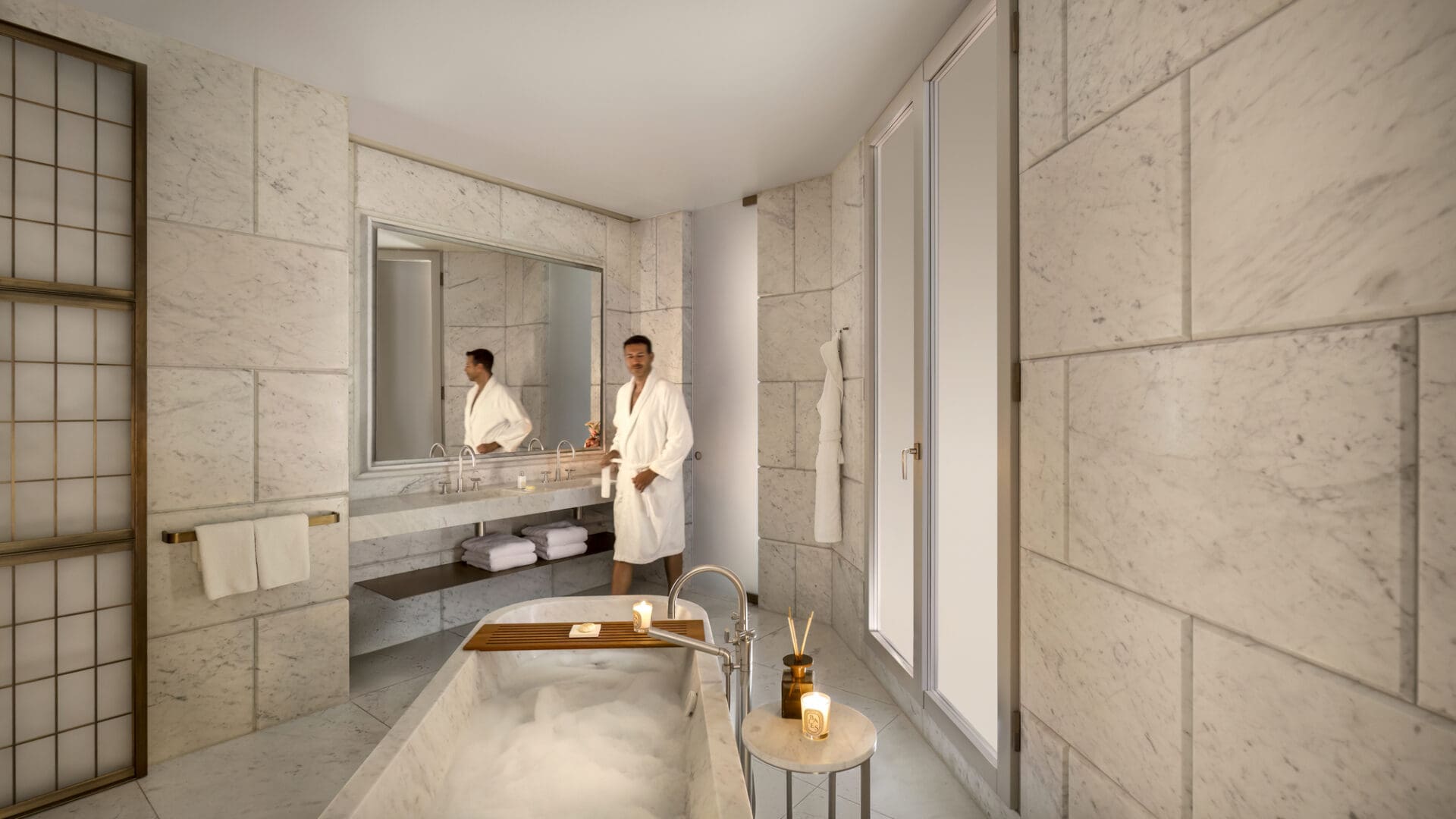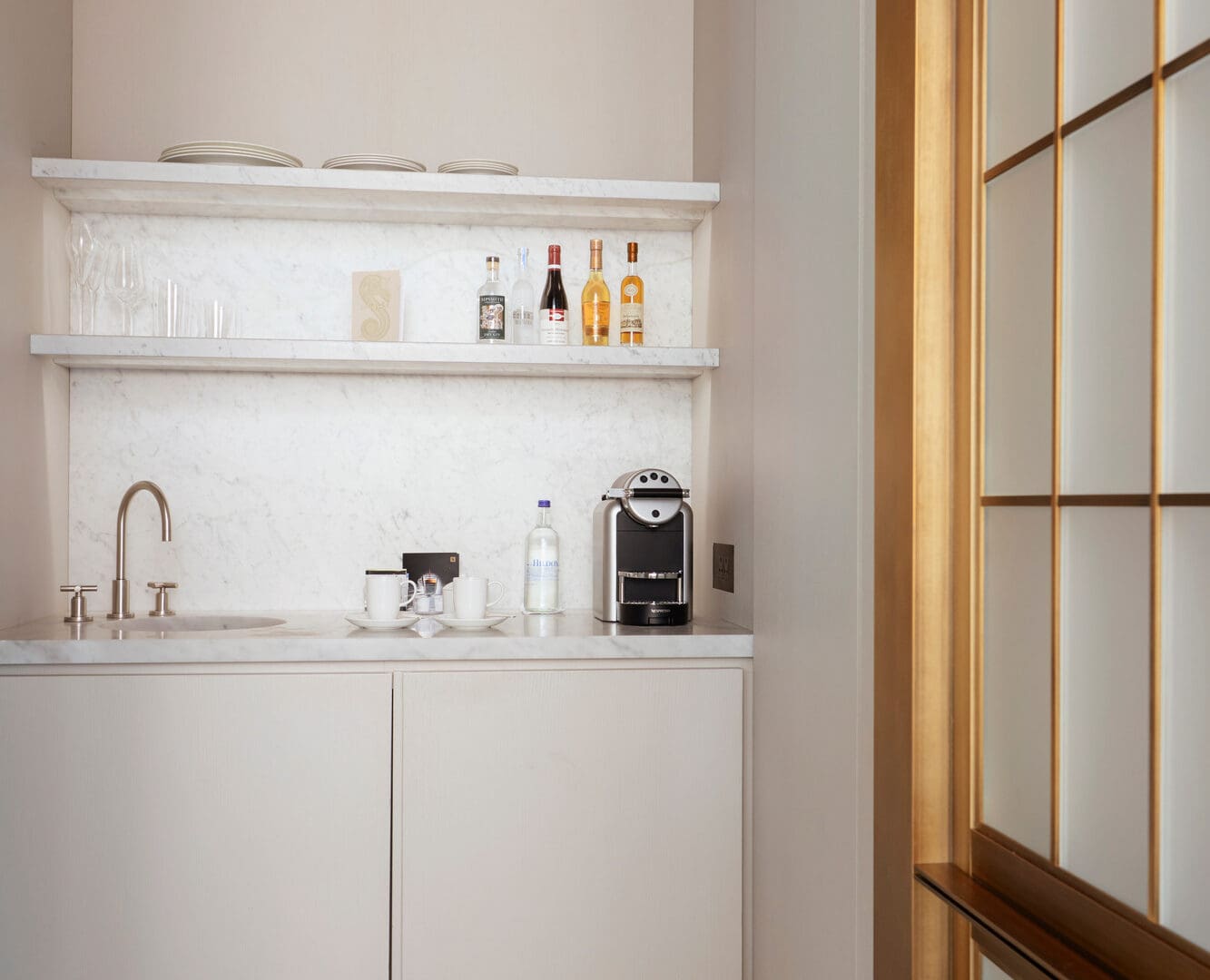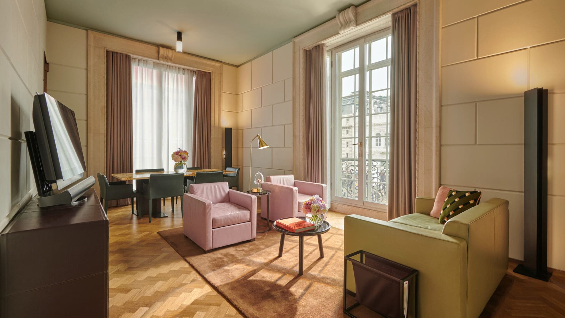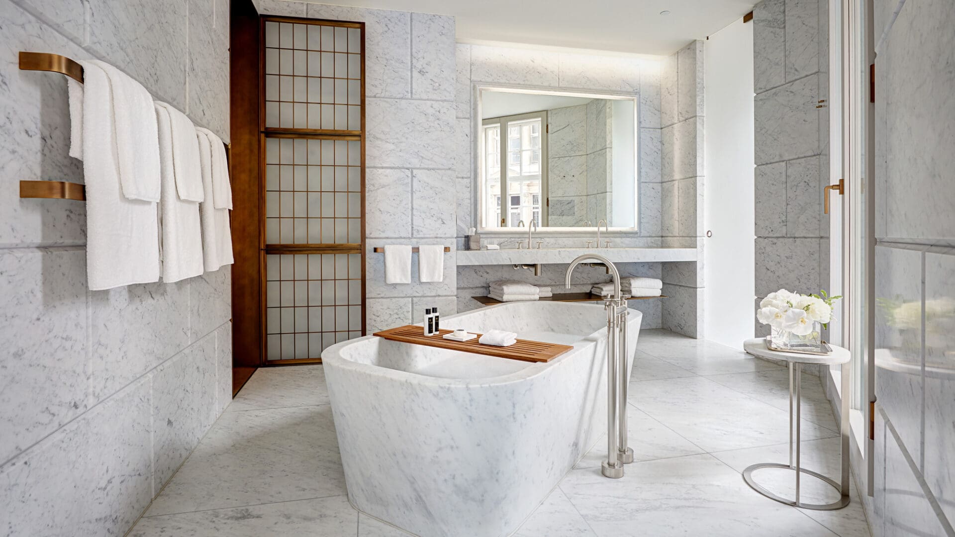 В отеле всего три таких номера. Из окон открывается вид на Пикадилли-Серкус, Риджент-стрит и Вестминстер. Одна спальня, холл с гостевым туалетом, ванная из каррарского мрамора и просторная гардеробная. В гостиной есть мини-кухня, обеденный стол на шесть персон и зона отдыха. Сьют можно расширить до варианта с двумя спальнями. Гостям предоставляется Mercedes-Benz S-Class или минивэн V-Class с водителем до 5 часов ежедневно.