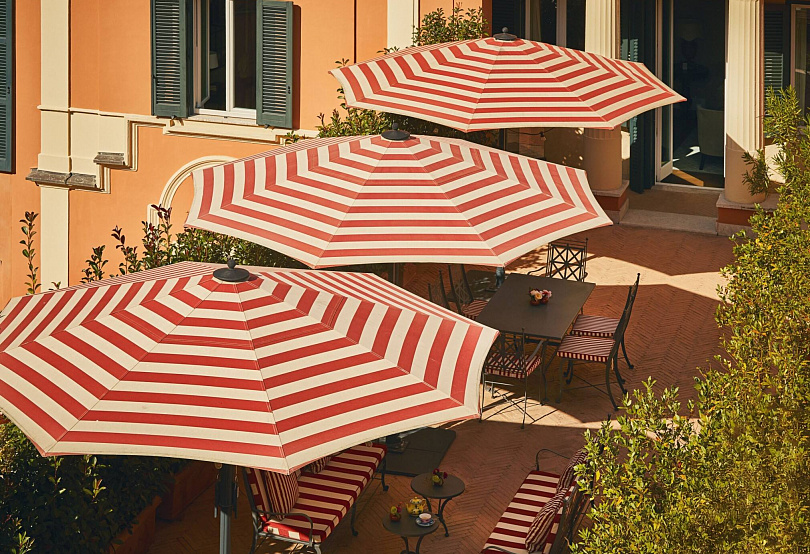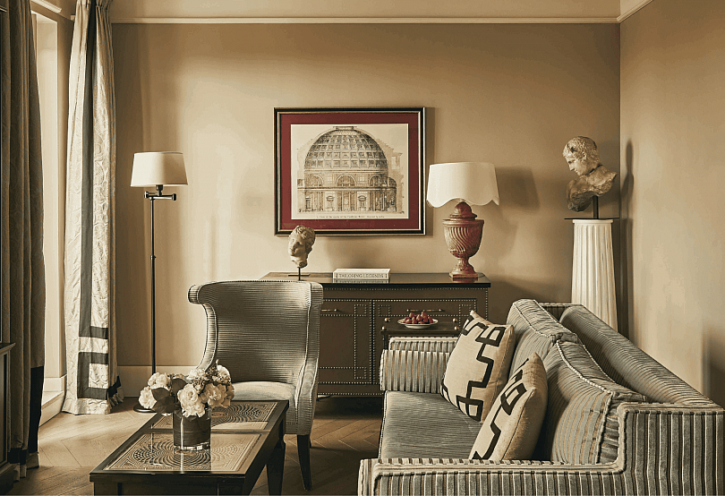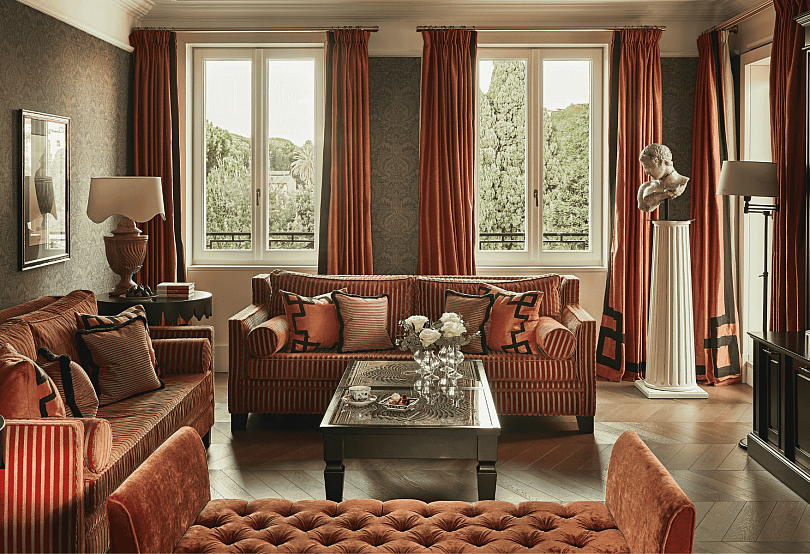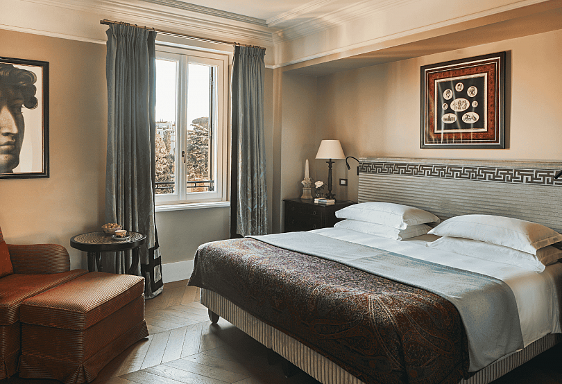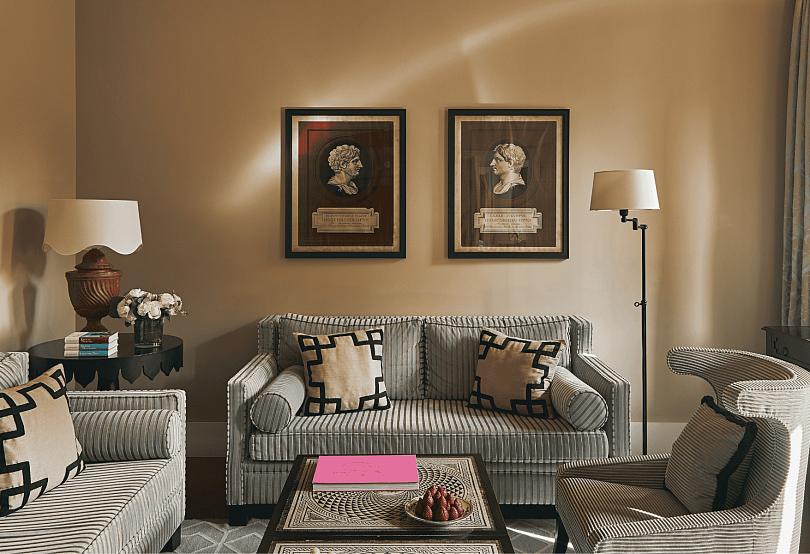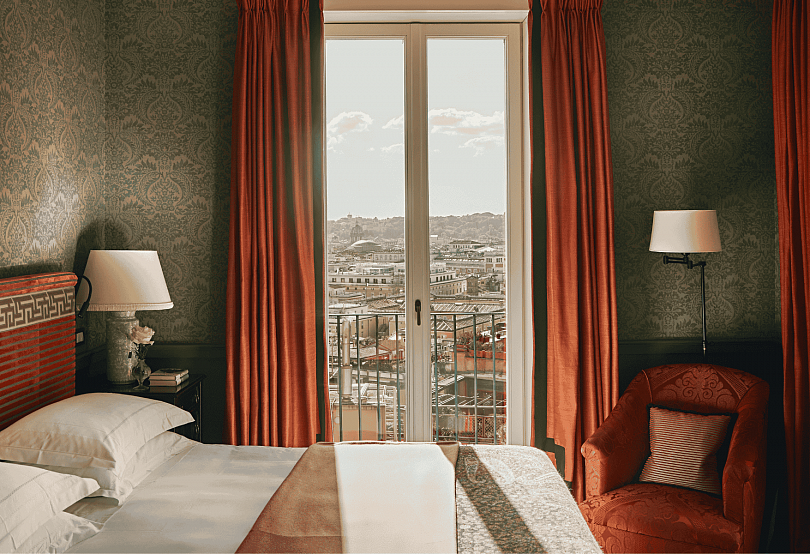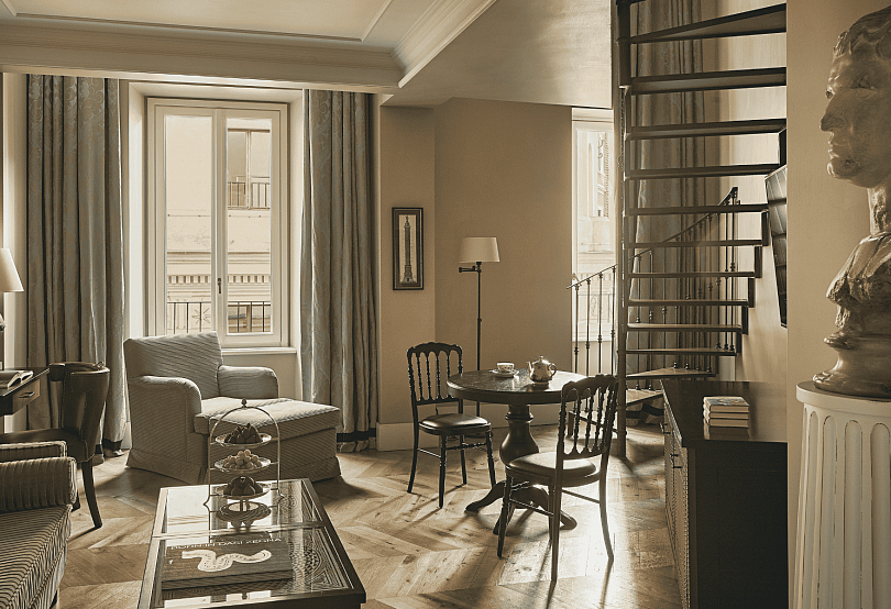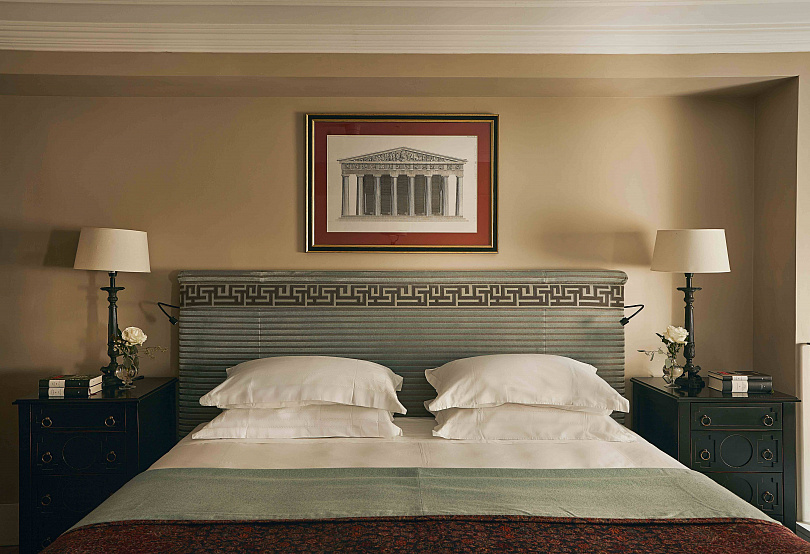 В XVIII веке Рим был полон юных аристократов, которые приезжали в город, чтобы гулять среди руин, изучать античную историю и флиртовать друг с другом. Архитектор Томмазо Циффер вдохновлялся теми историями, создавая дизайн отеля: крошечные репродукции и мозаики, популярные в то время, украшают кофейные столики, а дамы с прическами помпадур поглядывают на вас с обоев. С уважением относиться к прошлому, но не воспринимать его слишком серьезно — такой девиз у этого отеля.