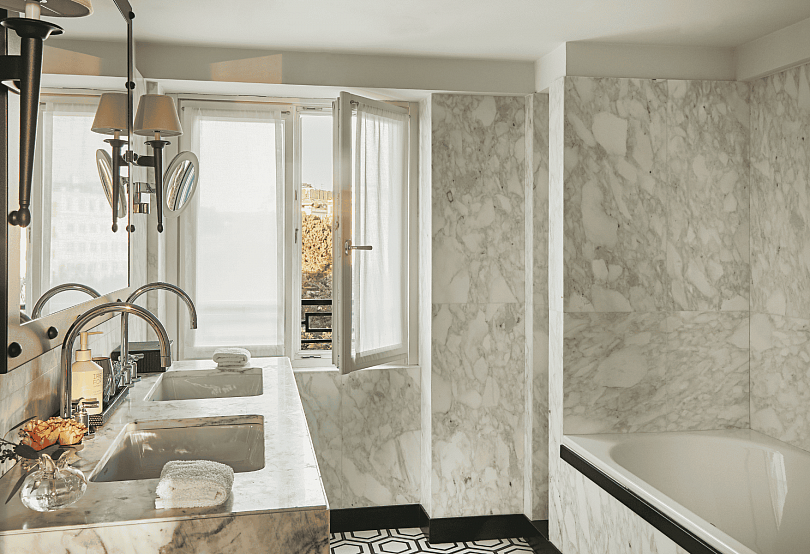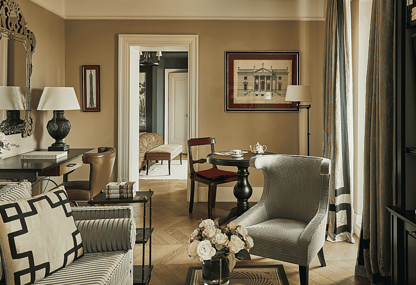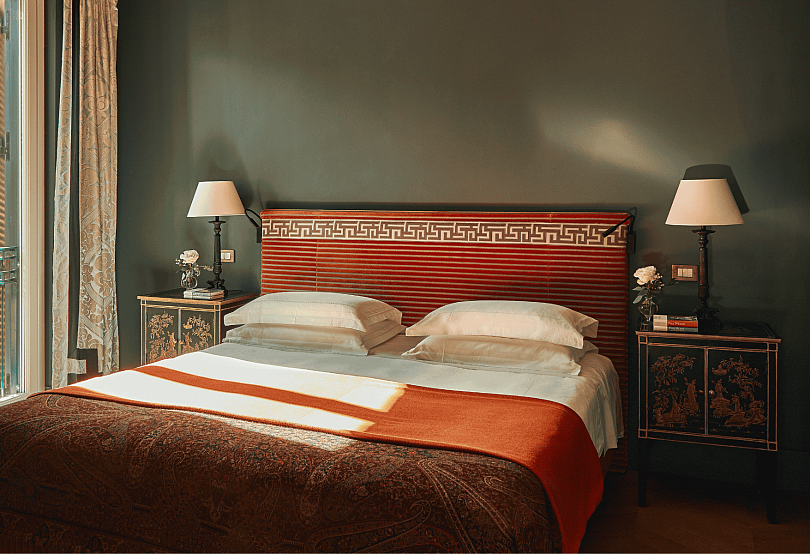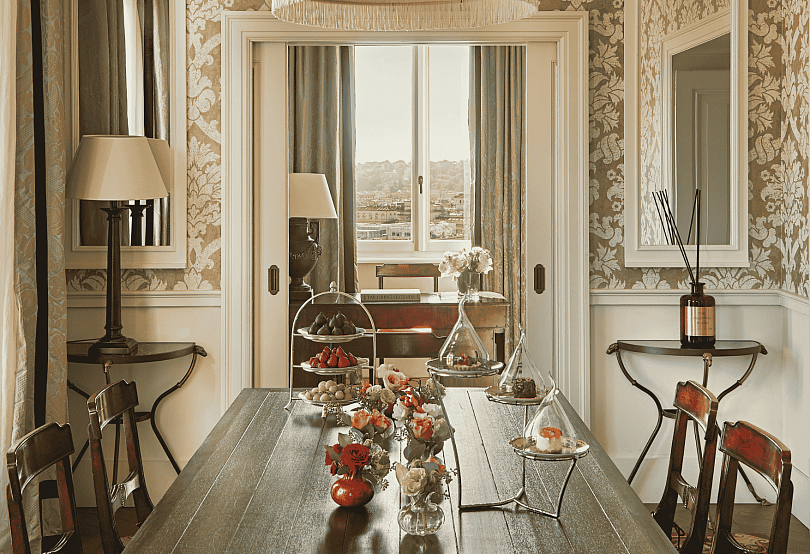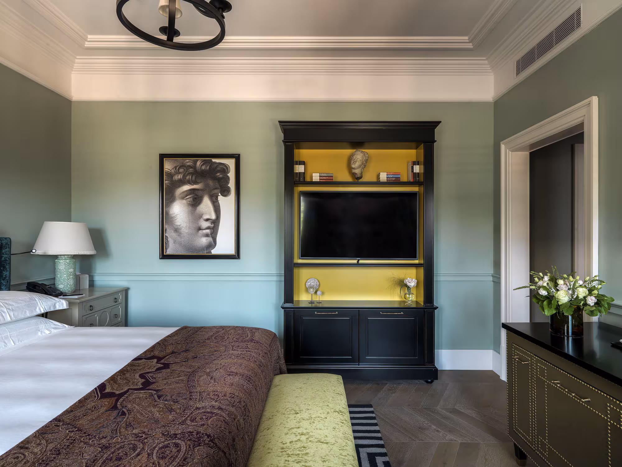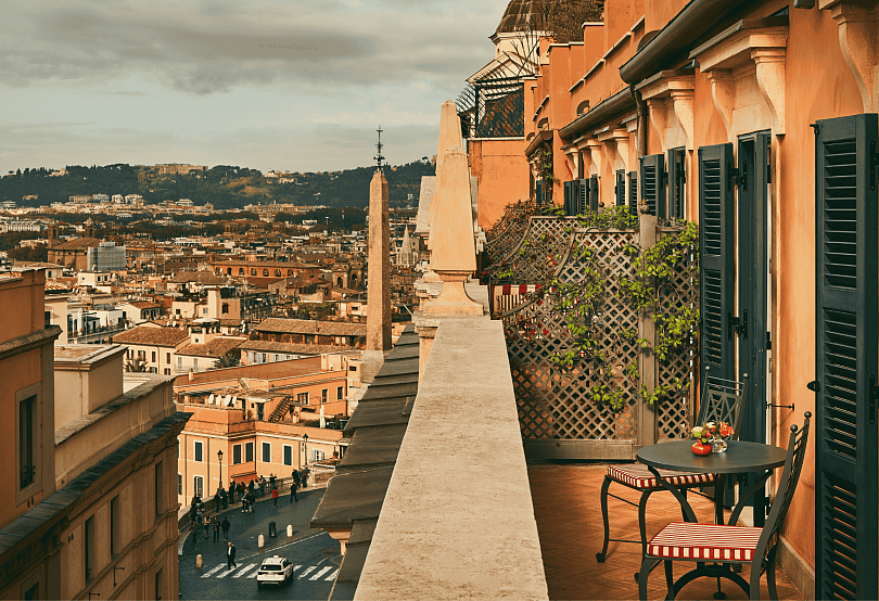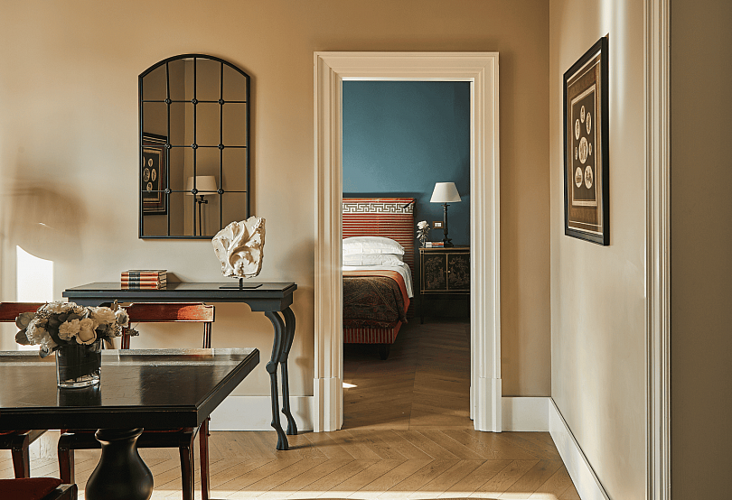 В XVIII веке Рим был полон юных аристократов, которые приезжали в город, чтобы гулять среди руин, изучать античную историю и флиртовать друг с другом. Архитектор Томмазо Циффер вдохновлялся теми историями, создавая дизайн отеля: крошечные репродукции и мозаики, популярные в то время, украшают кофейные столики, а дамы с прическами помпадур поглядывают на вас с обоев. С уважением относиться к прошлому, но не воспринимать его слишком серьезно — такой девиз у этого отеля.