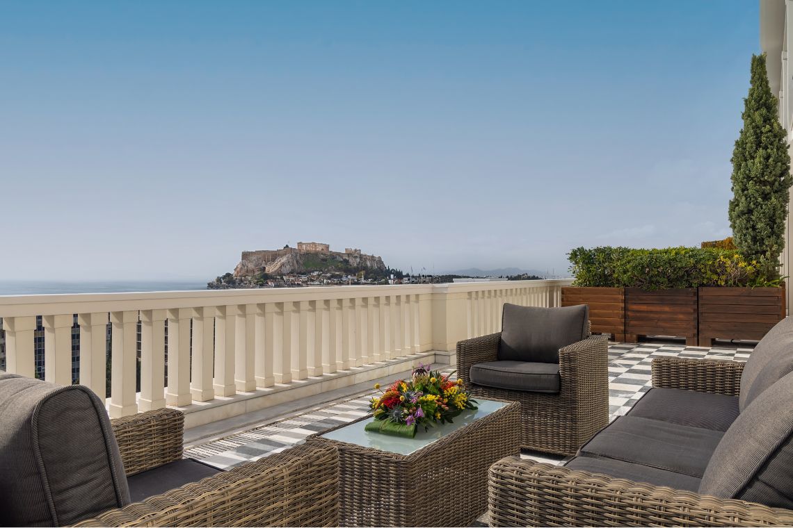 Номер на верхнем этаже с балконом и видом на город и Акрополь. Спальня с кроватью king-size. Отдельная гостиная, гардеробная. Две раковины, ванна и душ в ванной комнате. Некоторые номера этой категории можно объединить с соседними.