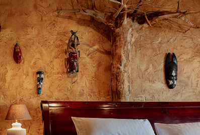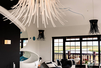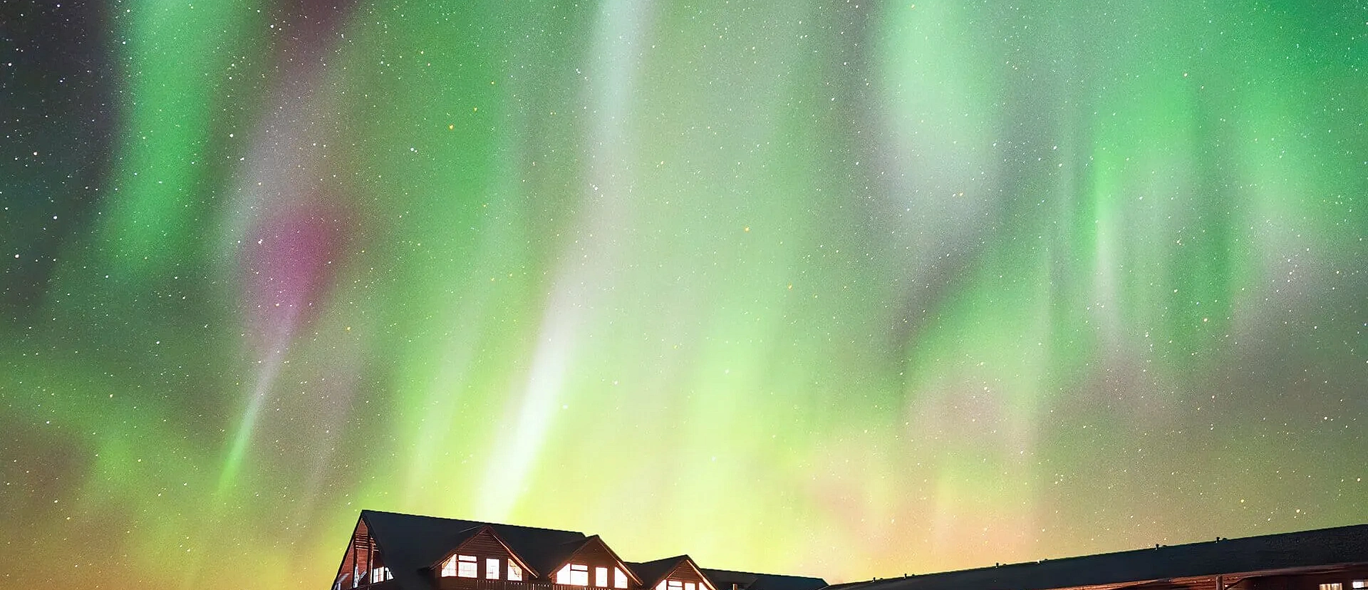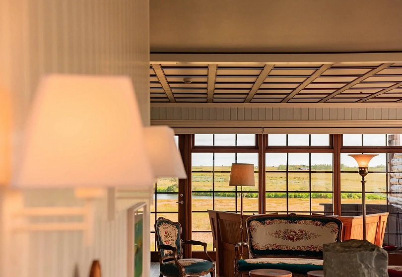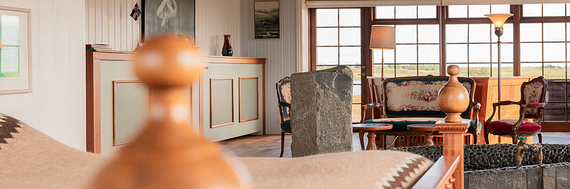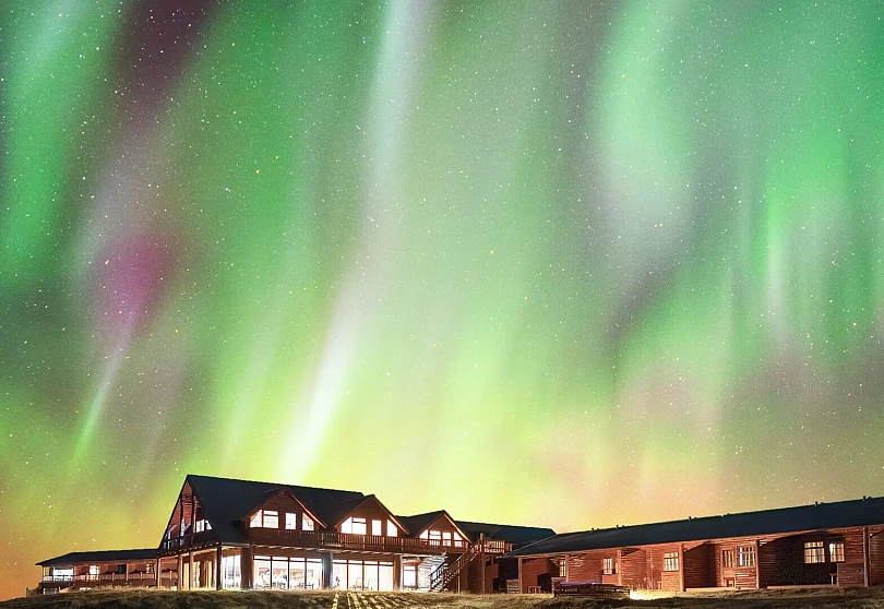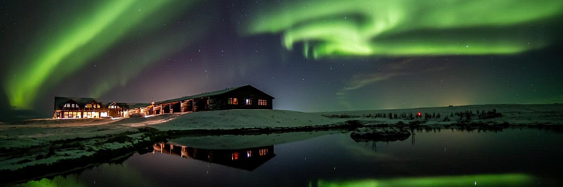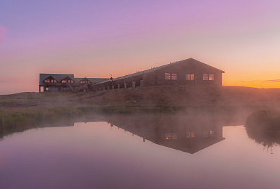 Отель построен из бревен в традиционном стиле: гостиные отделаны деревом, а за окнами разворачивается величественный и суровый исландский пейзаж. Каждый из сьютов посвящен отдельному континенту и оформлен в соответствующем стиле: африканский напомнит о «Тарзане», азиатский — о «Сёгуне».