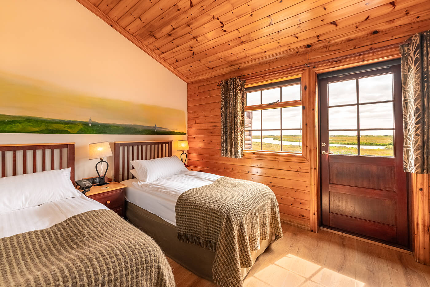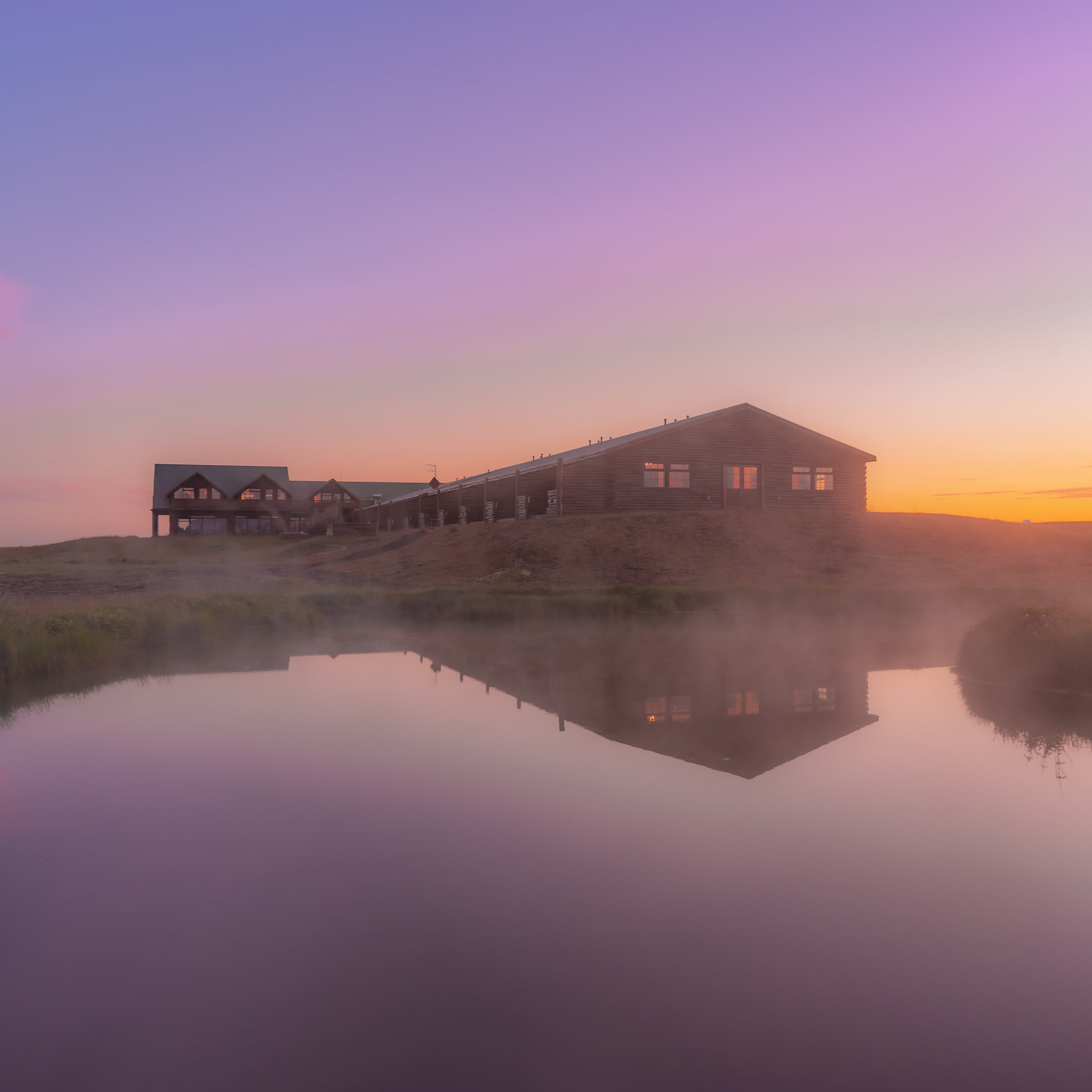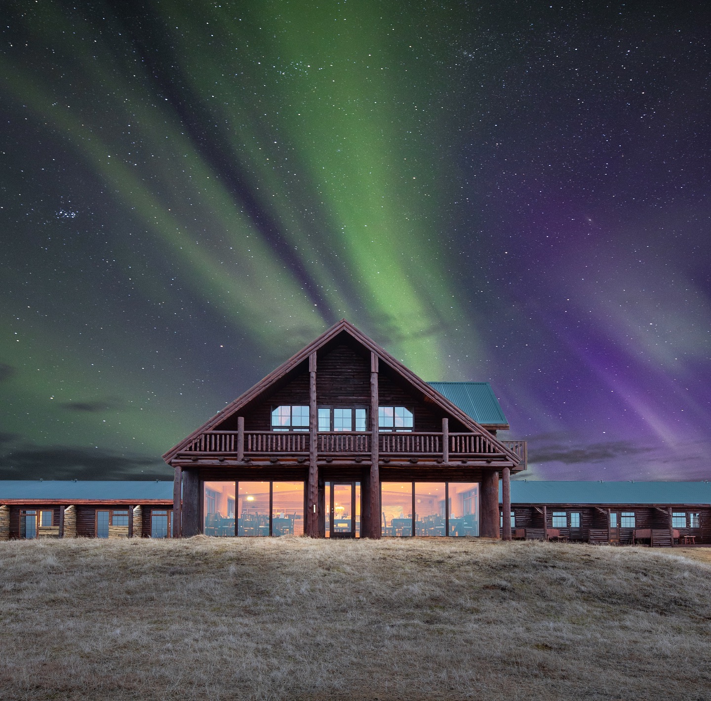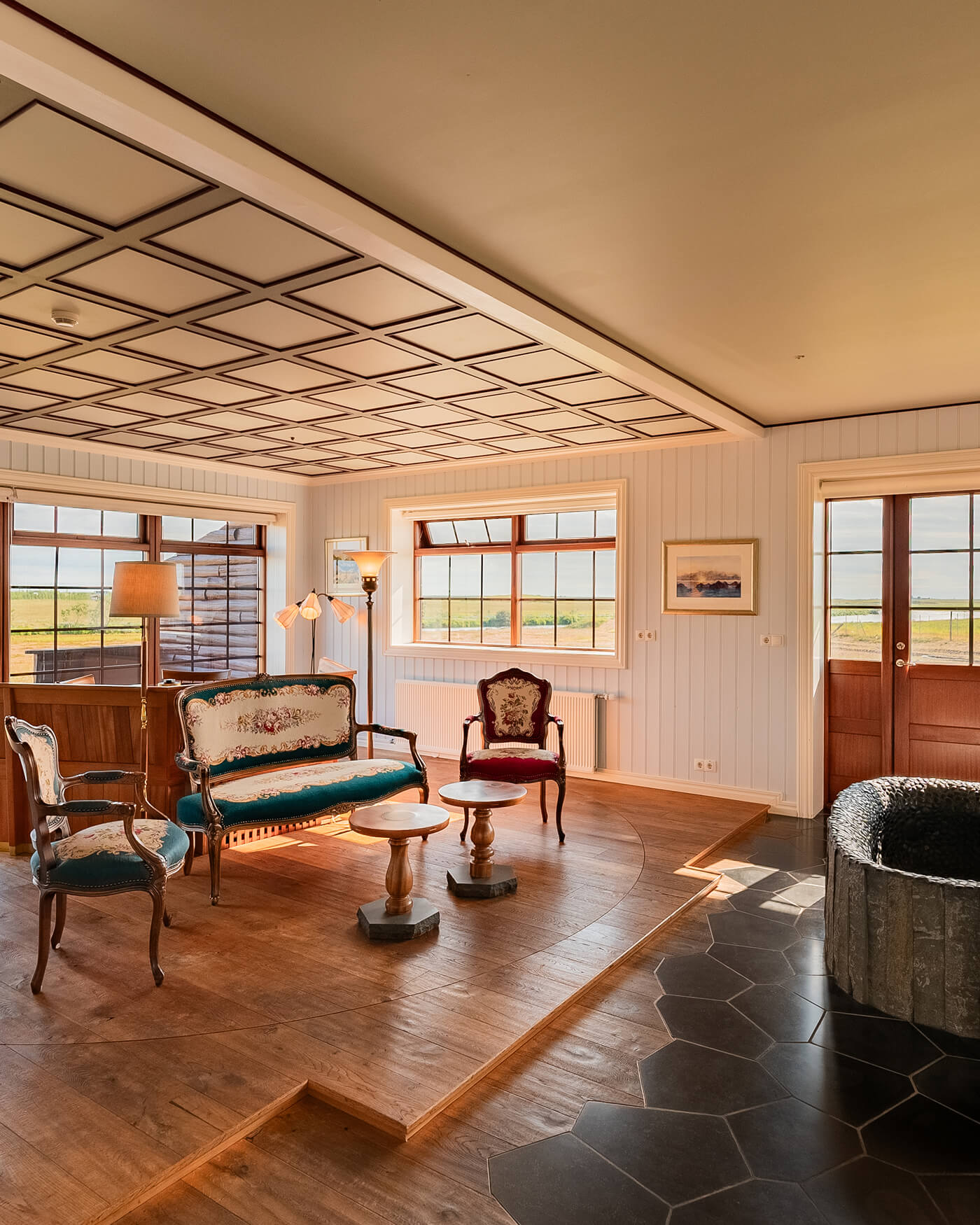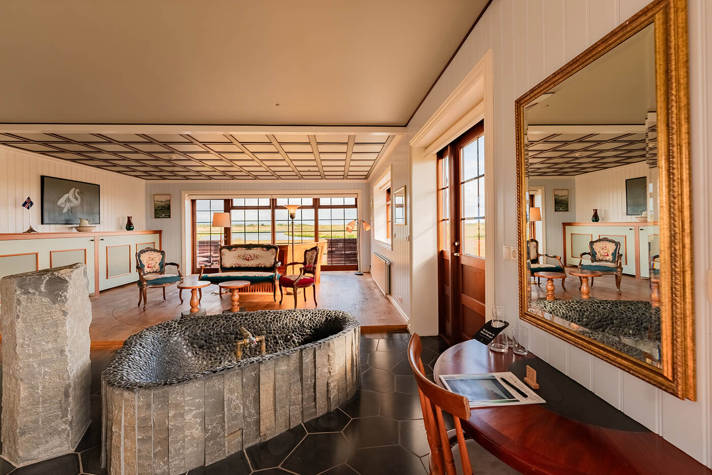 Отель построен из бревен в традиционном стиле: гостиные отделаны деревом, а за окнами разворачивается величественный и суровый исландский пейзаж. Каждый из сьютов посвящен отдельному континенту и оформлен в соответствующем стиле: африканский напомнит о «Тарзане», азиатский — о «Сёгуне».