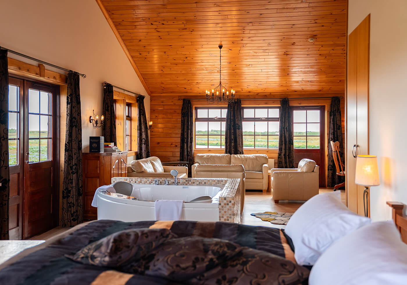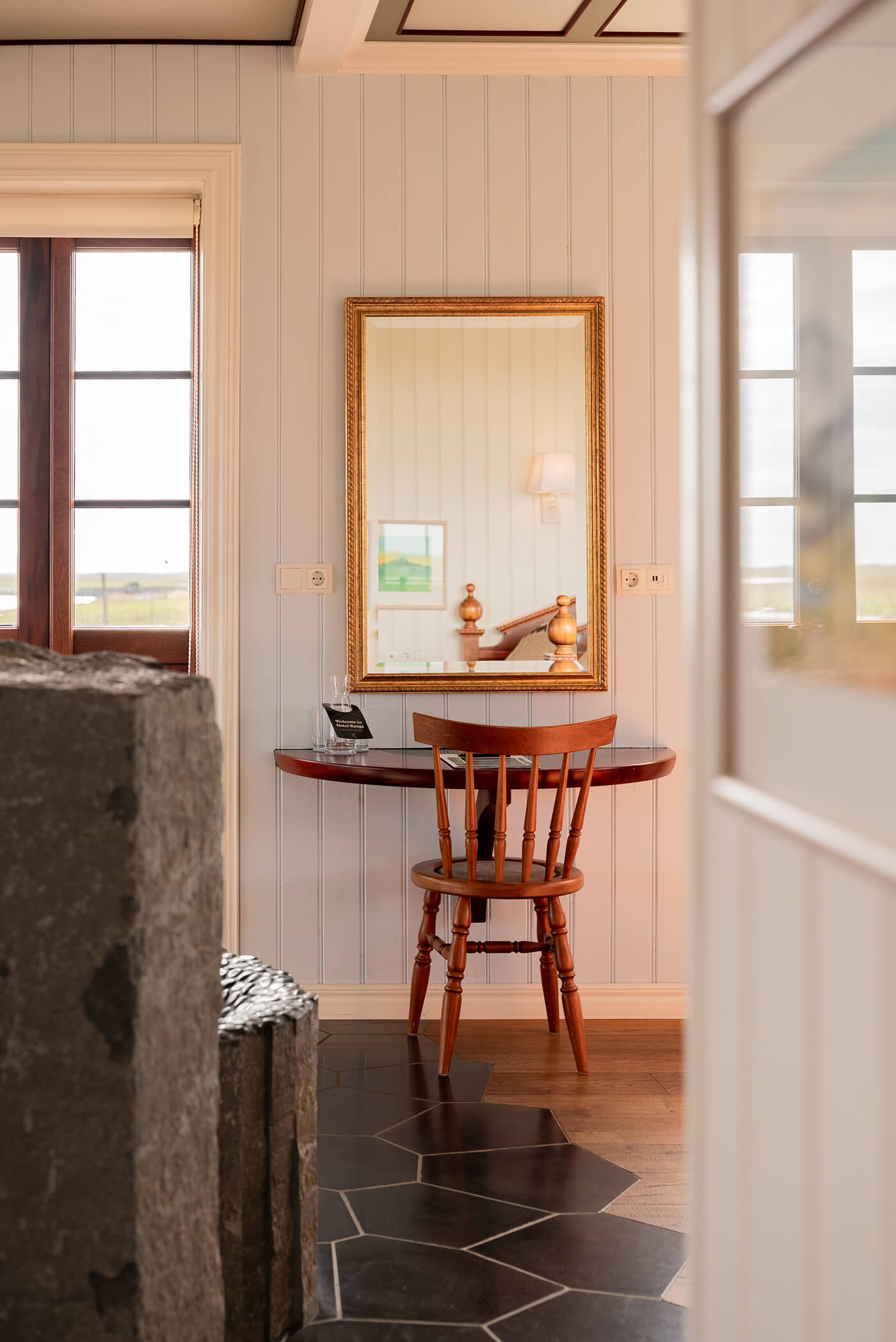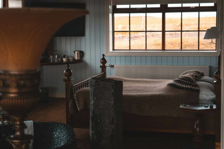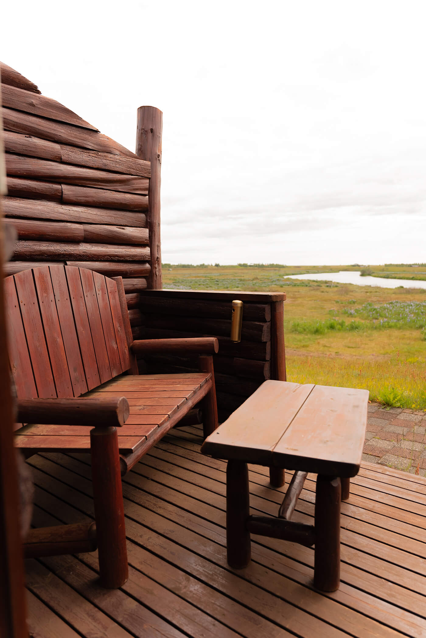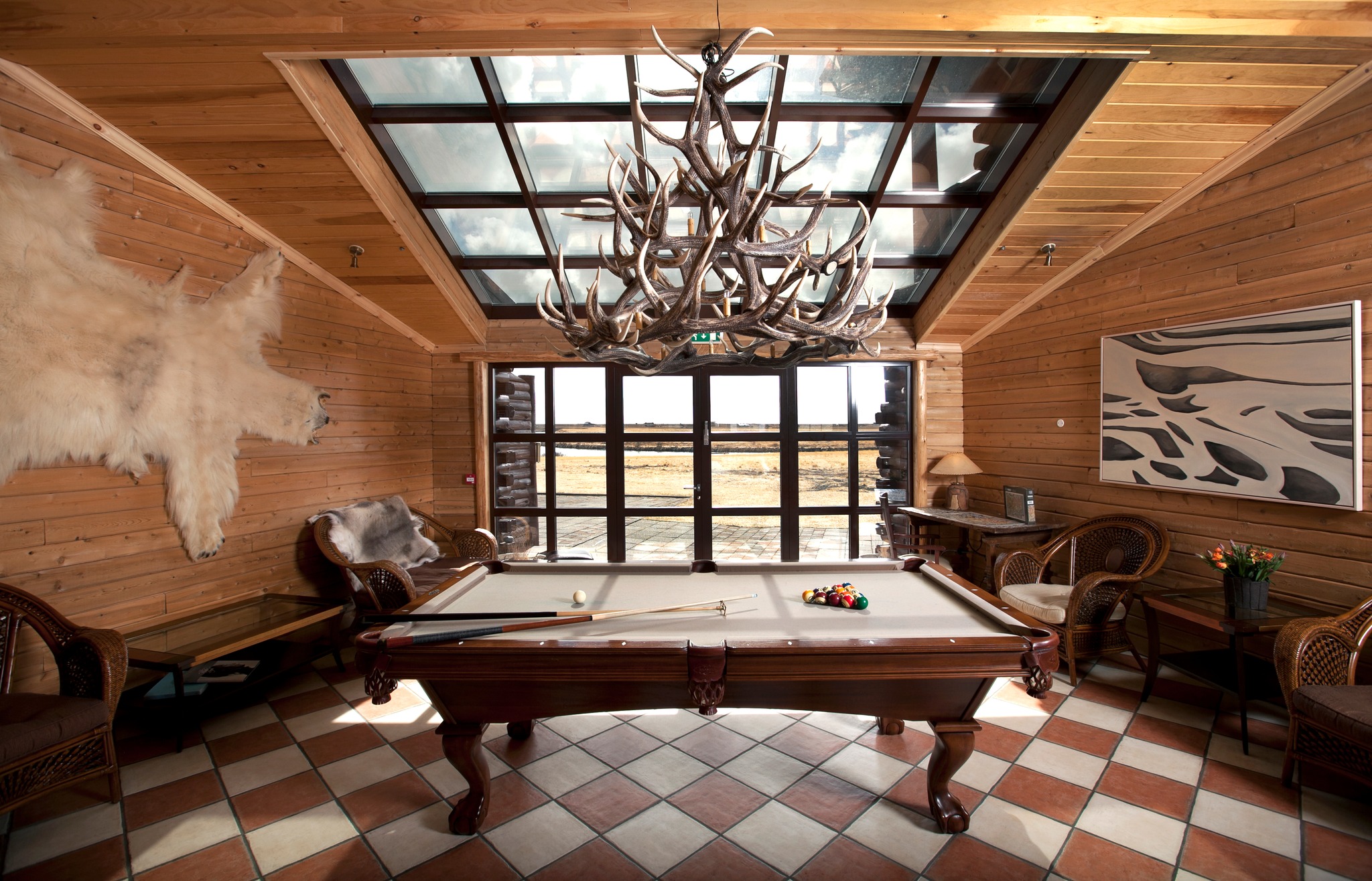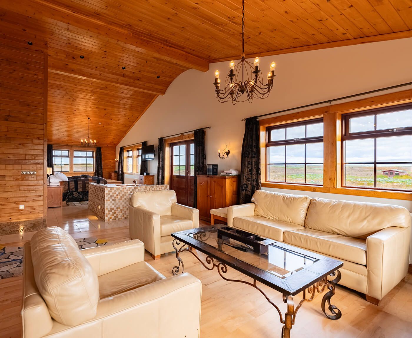 Отель построен из бревен в традиционном стиле: гостиные отделаны деревом, а за окнами разворачивается величественный и суровый исландский пейзаж. Каждый из сьютов посвящен отдельному континенту и оформлен в соответствующем стиле: африканский напомнит о «Тарзане», азиатский — о «Сёгуне».