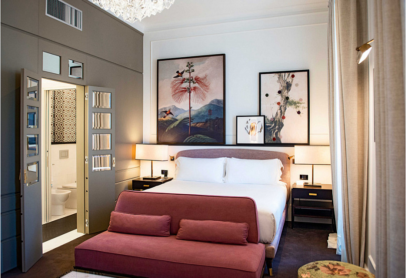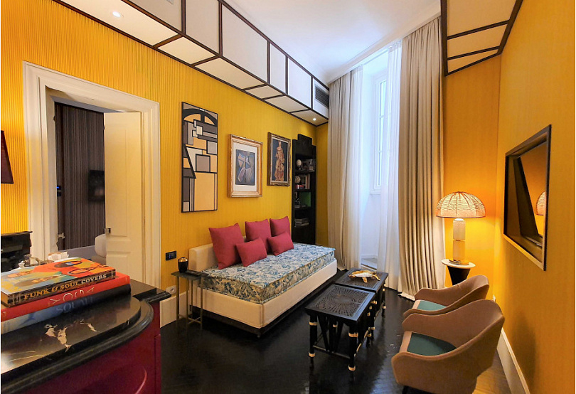 В превращении бывшего монастыря в бутик-отель участвовал Паоло Бонфини, посвятившую большую часть жизни дизайну съемочных площадок. И это заметно: пространство наполнено акцентами, неожиданными цветовыми решениями, эффектной мебелью и множеством произведений искусства. Легко почувствовать себя в кадре из «Великой красоты» Соррентино.