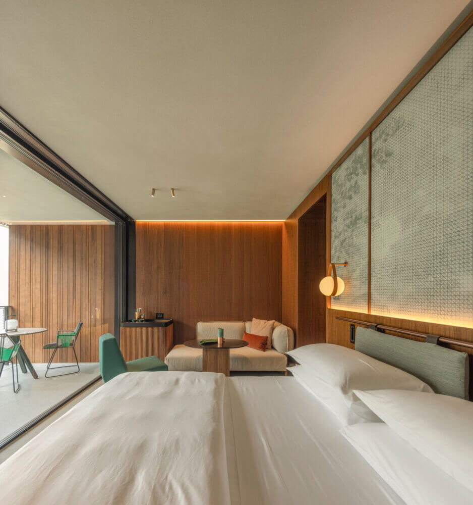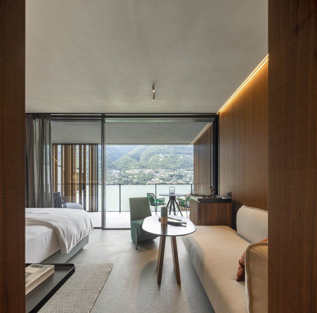 Номер с террасой и видом на озеро Комо. Кровать king-size. Гостиная зона с диваном, столом и креслом для чтения.