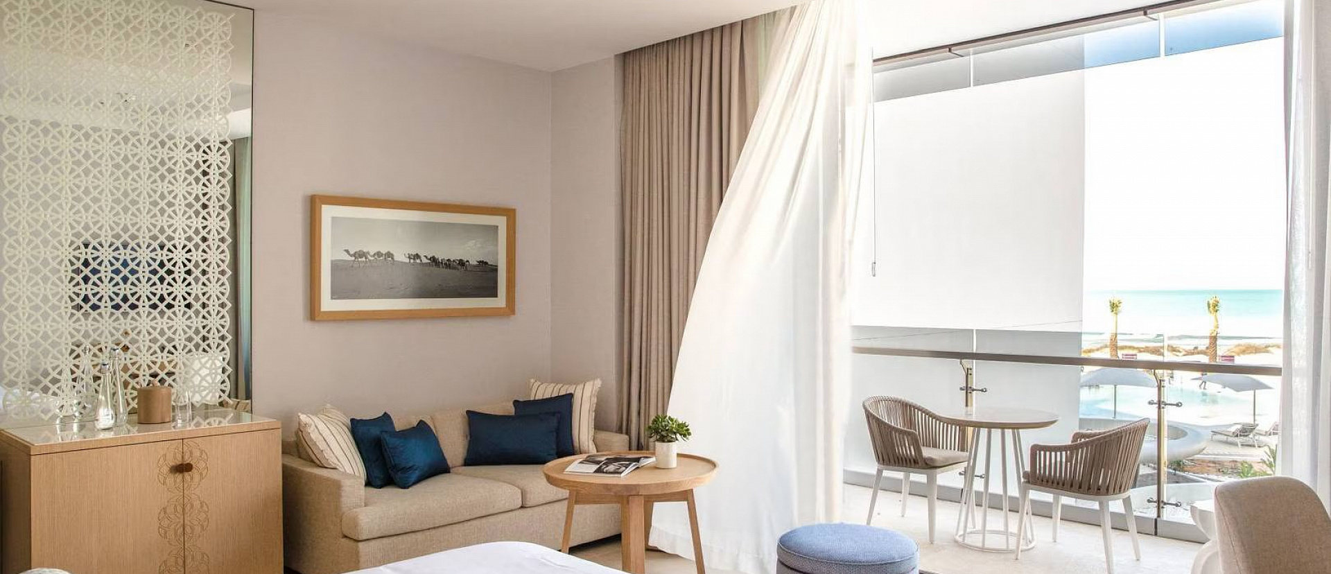Комната с видом на океан и возможностью размещения для двух взрослых и двух детей. Кровать king-size. В номере есть капсульная кофе-машина, в ванной комнате — отдельная ванна и душ.