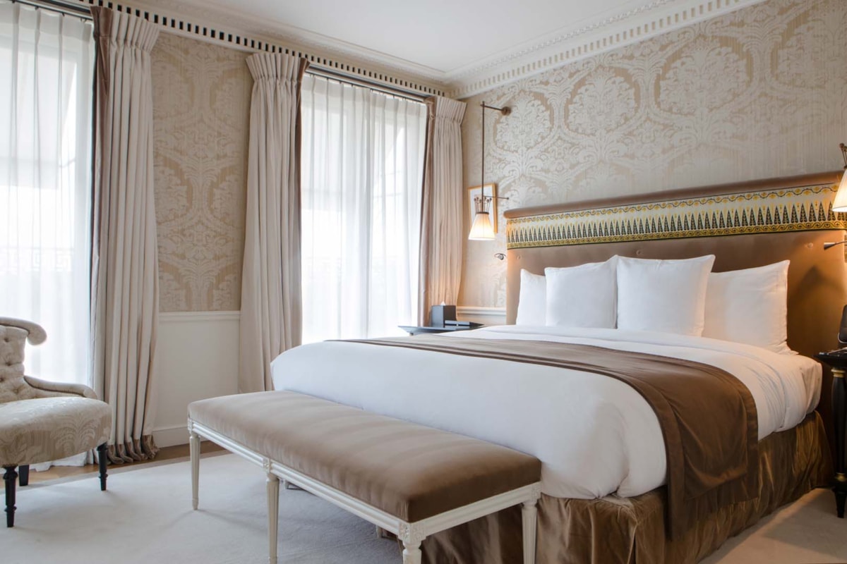 Номер с балконом и видом на Эйфелеву башню и Гран-Пале. Большая гостиная с обеденным столом, просторная спальня и гардеробная комната. Кровать размера king-size. Ванная комната с итальянским душем, ванной и двумя раковинами. Номер подходит для людей с ограниченными возможностями.