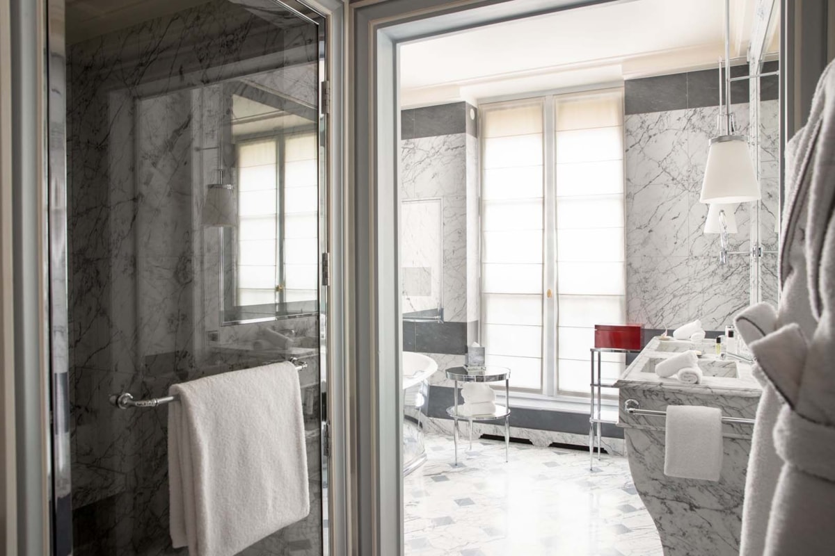 Номер с видом на внутренний двор отеля. Кровать размера king-size. Ванная комната с итальянским душем, ванной и двумя раковинами.