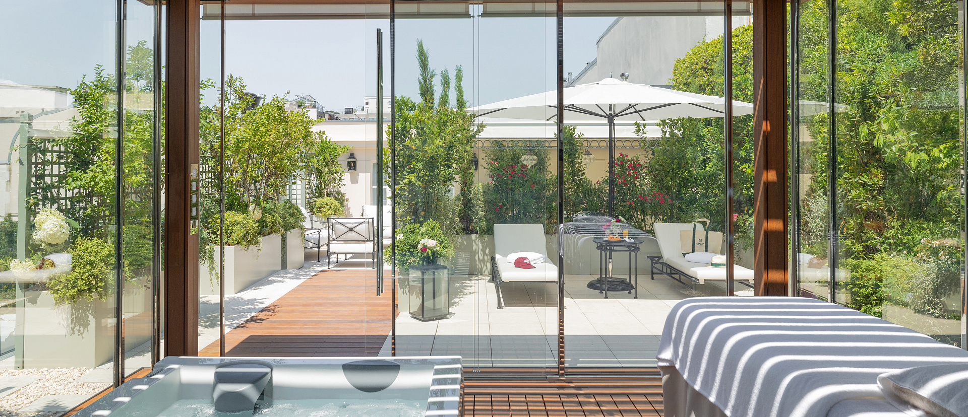 Номер с большой террасой, джакузи под открытым небом и видом на сады отеля. Кровать king-size в спальне. Отдельная гостиная, две ванные комнаты с тропическим душем, двойными раковинами и глубокими ваннами.