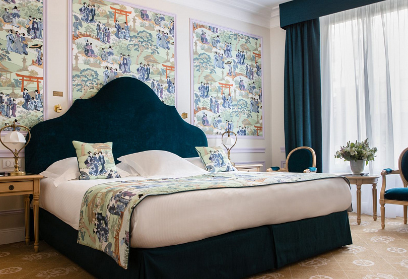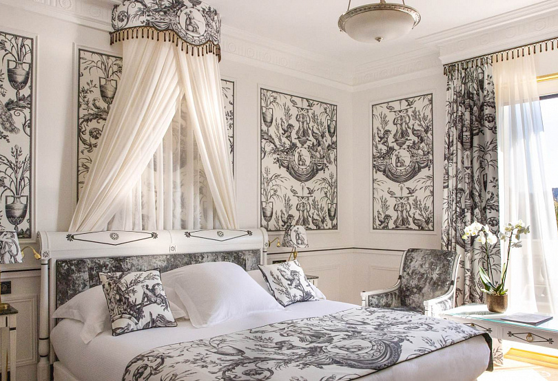 Каждый из номеров и сьютов оформлен в своем стиле — повторов нет. Один в духе Марии Антуанетты, другой — Людовика XIII с балдахином золотого цвета и фарфоровыми вазами; третий, Parisienne, с изголовьем в виде чемодана и монохромной гаммой, воплощает современную Ривьеру. Остается только выбрать атмосферу по своему вкусу и настроению.