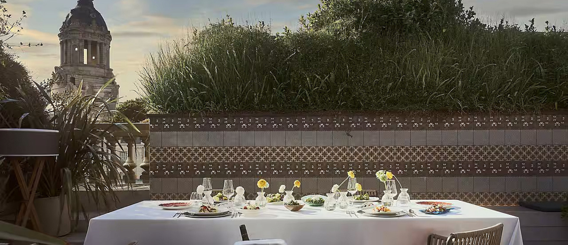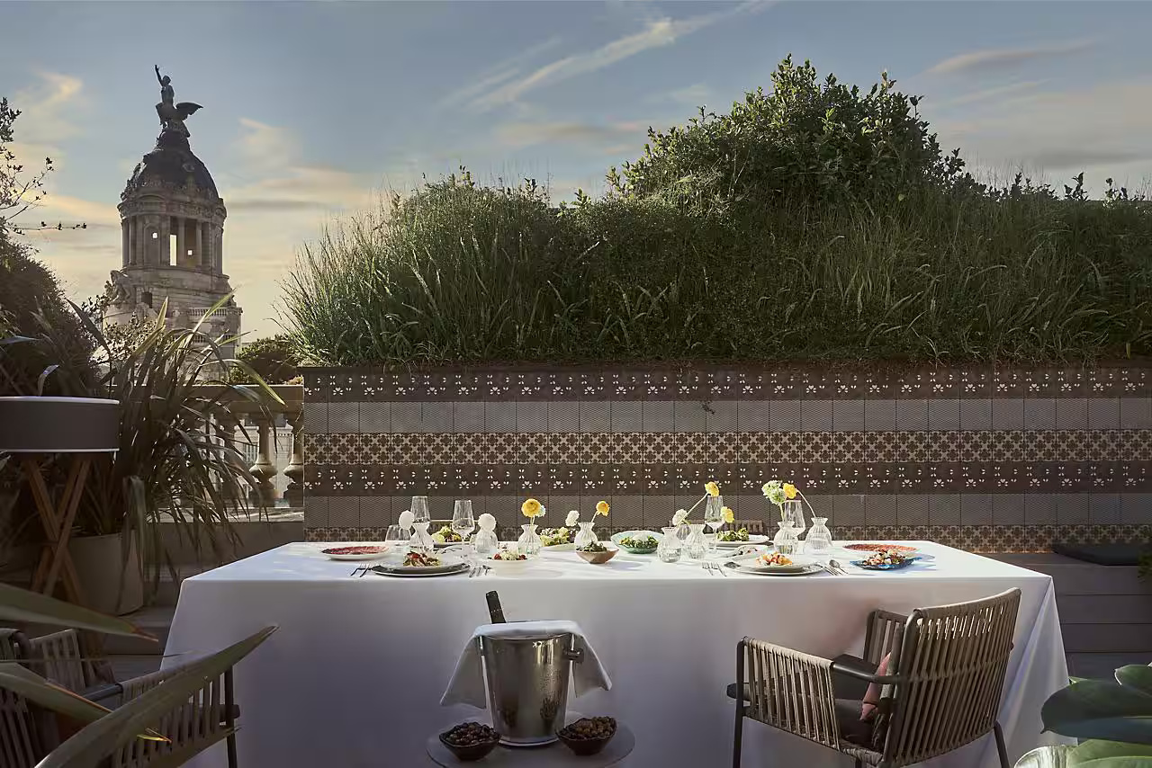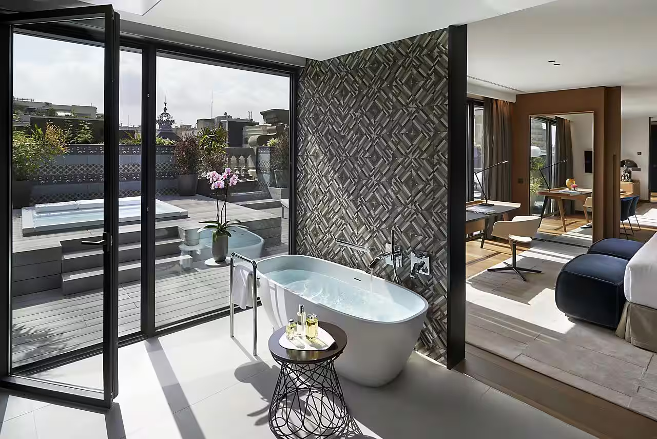 Номер на верхнем этаже отеля с отдельной гостиной и столовой зонами, большой гардеробной и гостевым туалетом. Просторная терраса с шезлонгами, лаунж-зоной и обеденным столом на шесть человек. Кровать king-size в спальне, большая овальная ванна, две раковины и душевая кабина в ванной комнате.