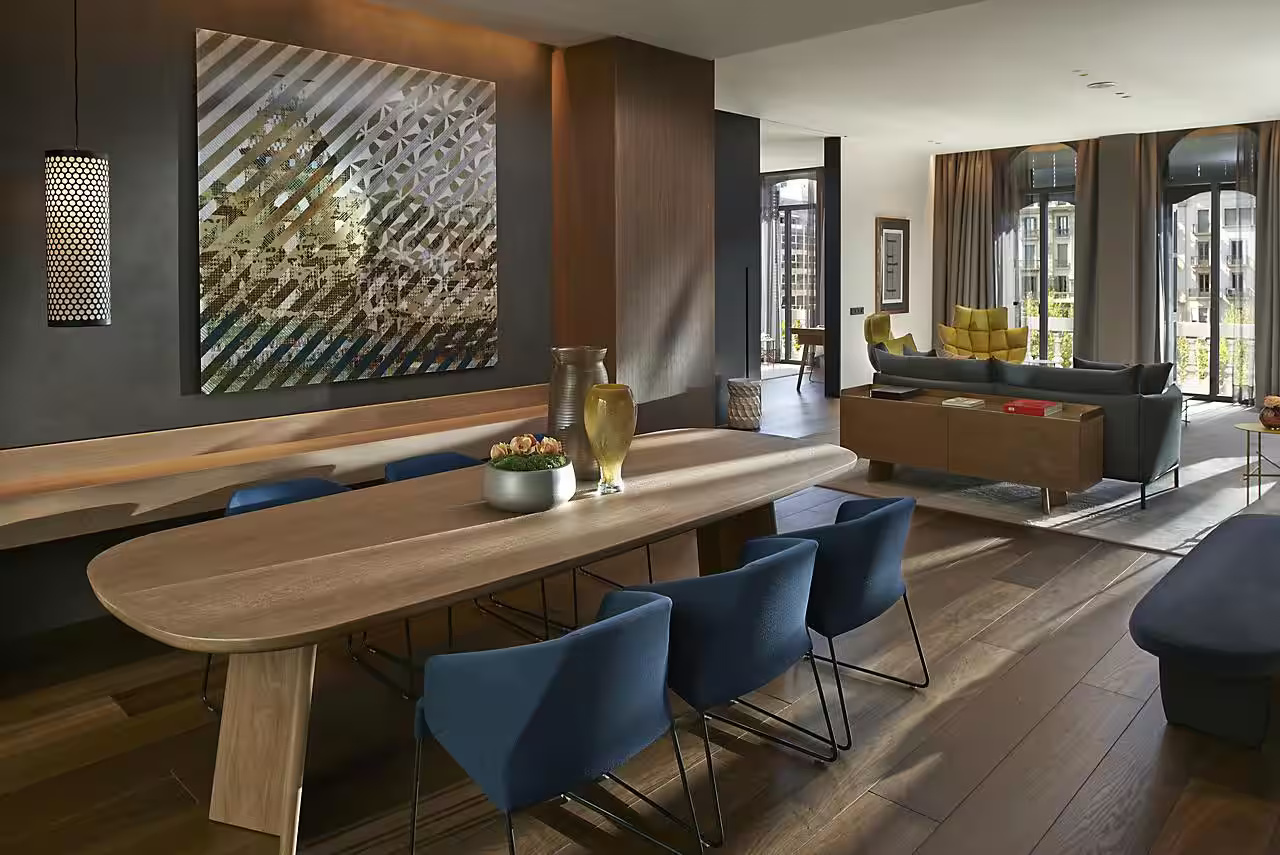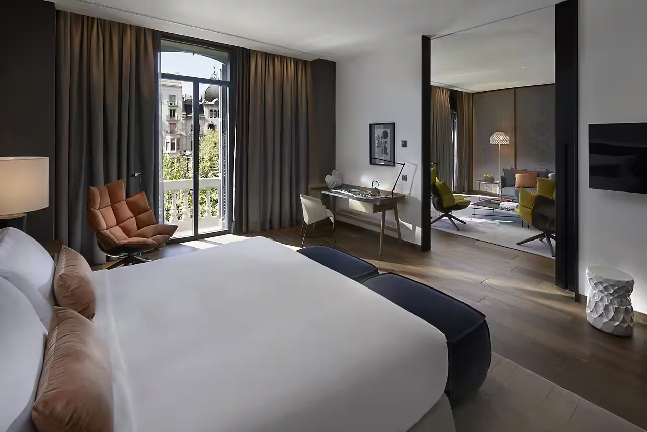 Номер с террасой, откуда открывается вид на сад или город. Отдельные гостиная и столовая зоны, большая гардеробная и гостевой туалет. В спальне кровать размера king-size, в ванной комнате — две раковины, ванна и душевая кабина.