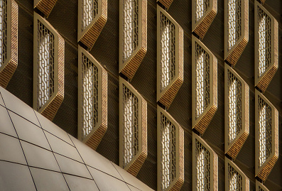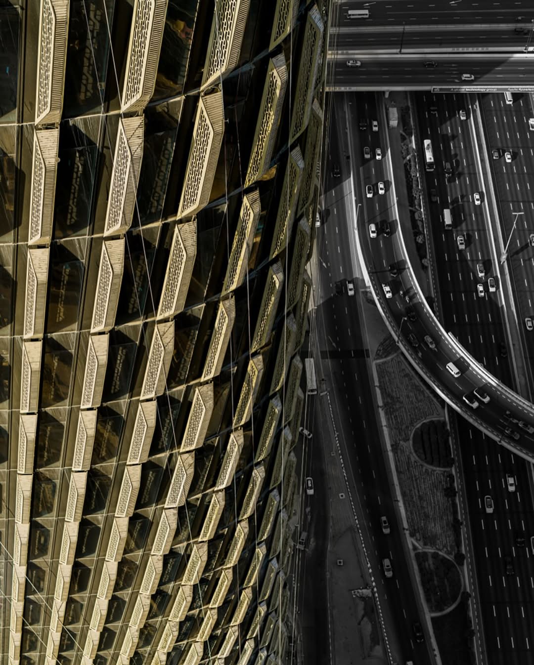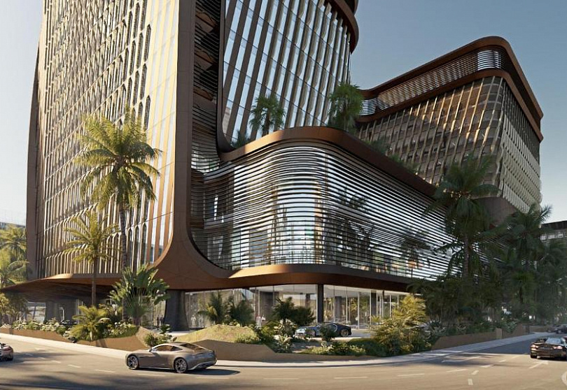 Башня поднимается на 303 метра в высоту и считается самым высоким керамическим фасадом в регионе — снаружи он эффектно играет бликами на солнце, а внутри работает как инженерное решение: керамика снижает поглощение тепла, тогда как «ребра» фасада направляют потоки воздуха и создают естественное охлаждение.