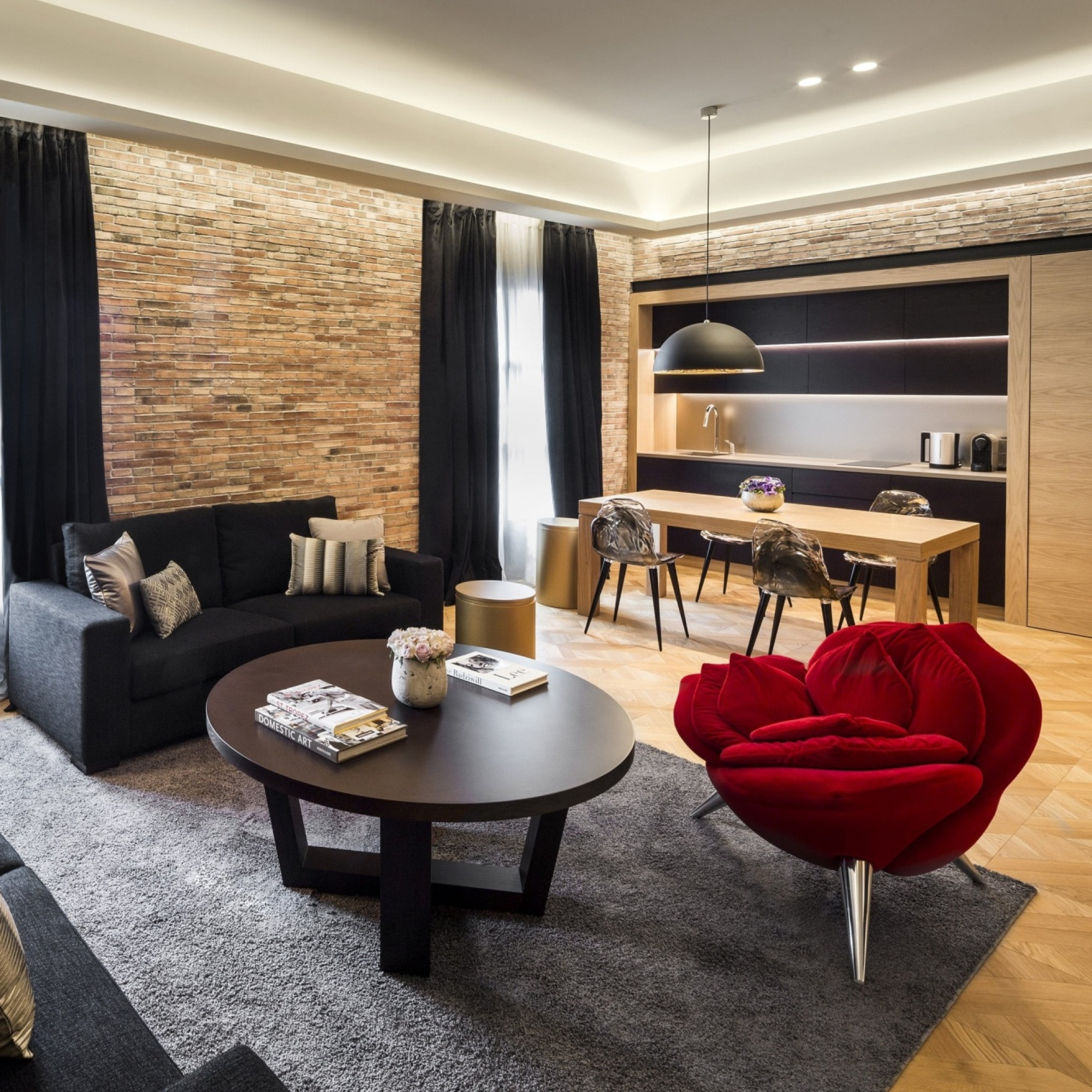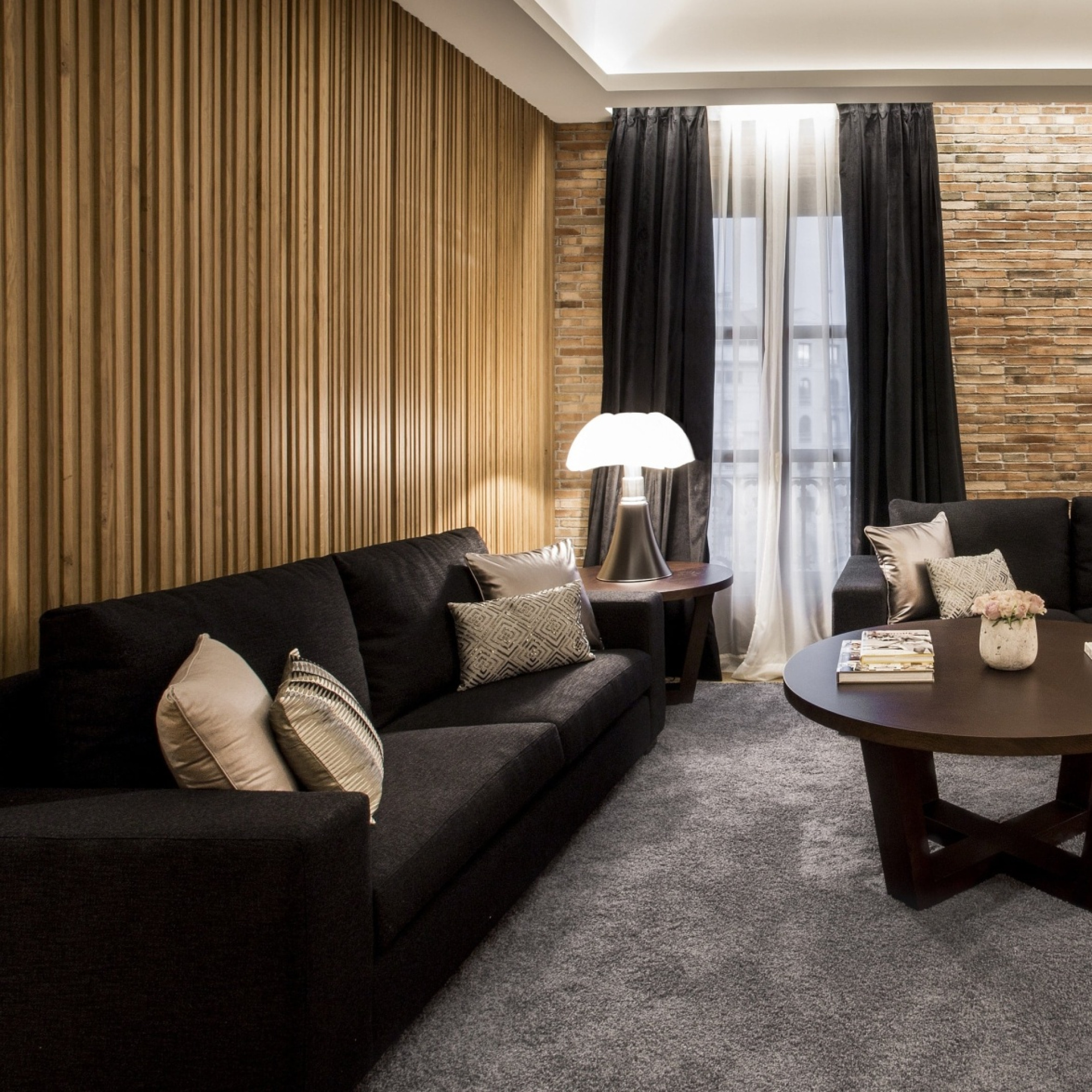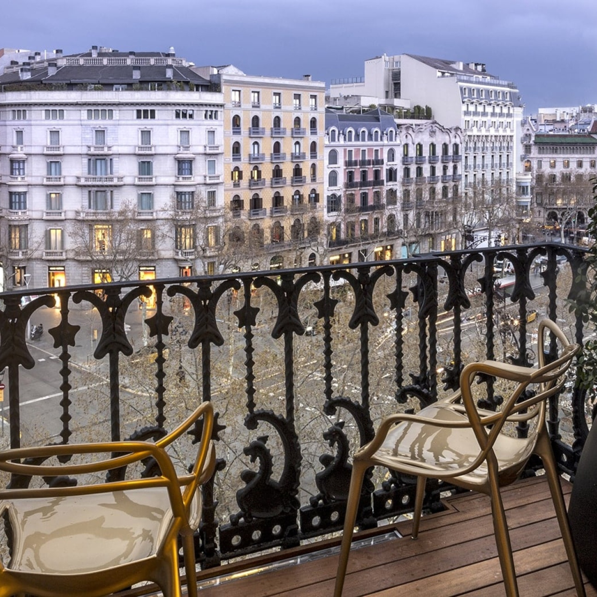 Большой номер с балконом и видом на Пасео-де-Грасиа. Просторная спальня, к которой примыкает гардеробная и ванная комната с джакузи. Отдельная гостиная, столовая на шесть человек, кухня, гостевой туалет.