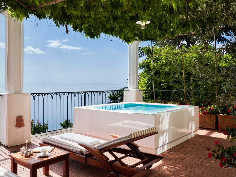 Номер, расположенный в садах отеля. Терраса с джакузи, обеденной зоной и видом на море. Кровать king-size в спальне. Ванная комната с душевой кабиной.