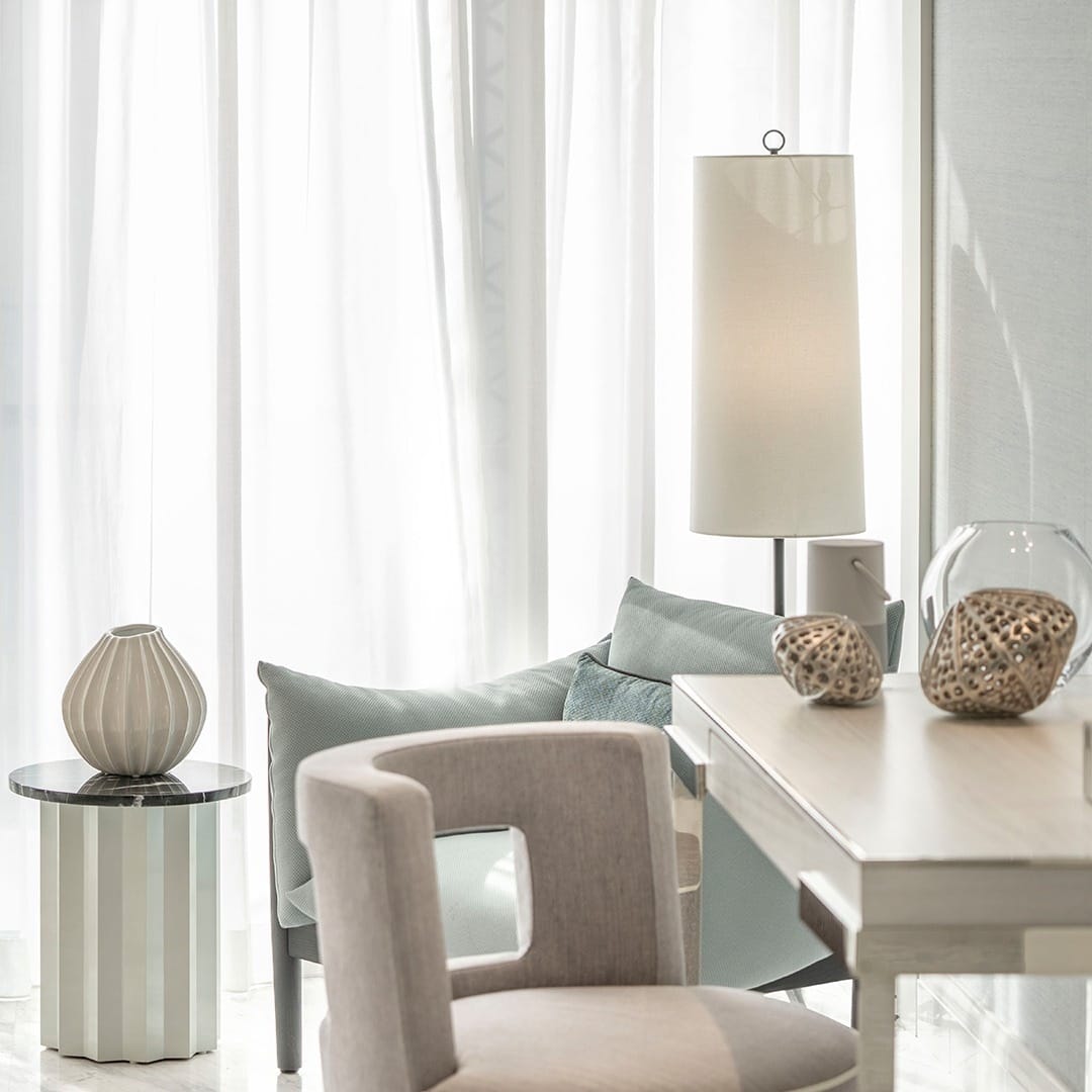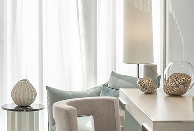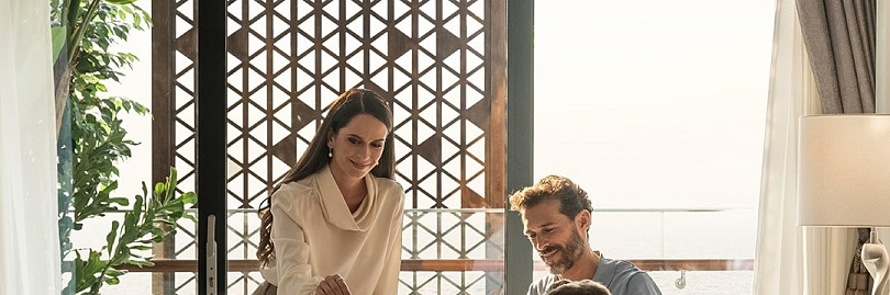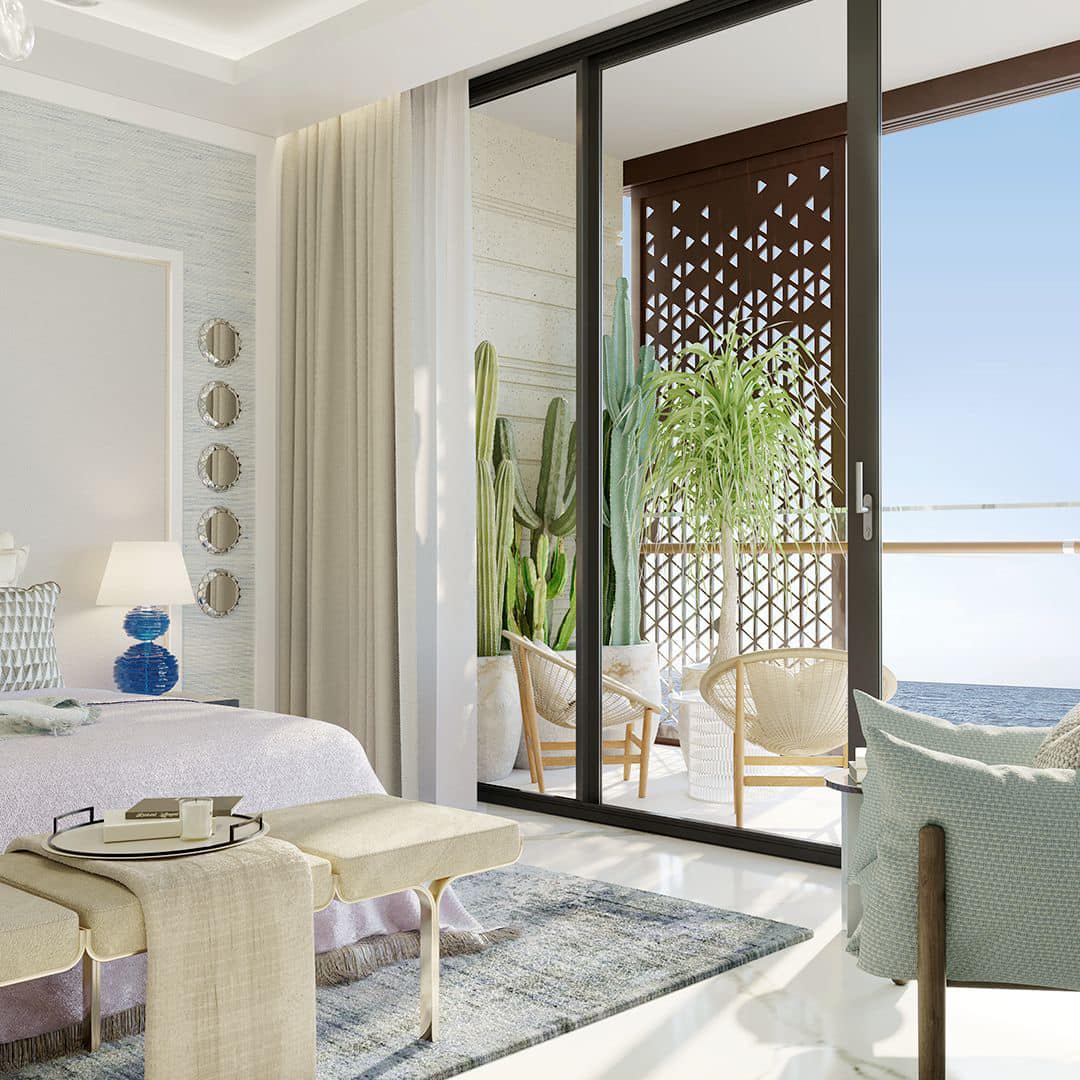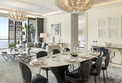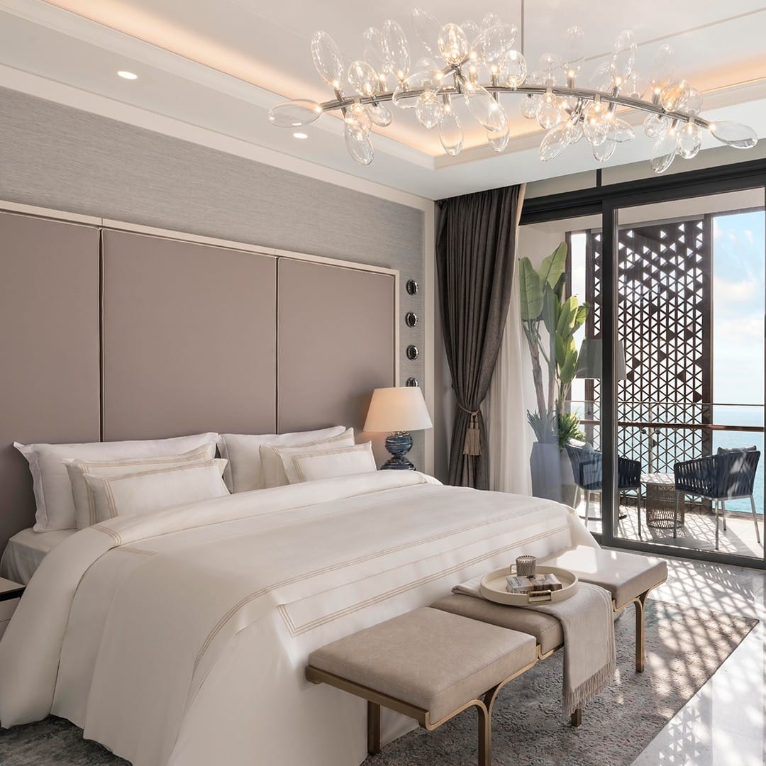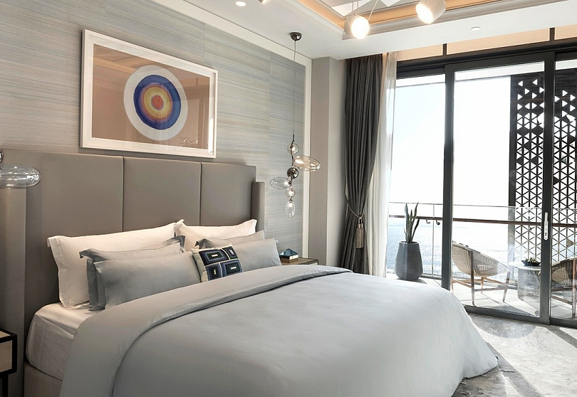 Внутри — почти двести номеров и сьютов с щедрой площадью от 60 м², почти все — с панорамным видом на море. Интерьеры лаконичны: светлый камень, матовое дерево, мягкий текстиль и продуманное освещение. Ванные комнаты отделаны мрамором, косметика на полках создана специально для отеля.
