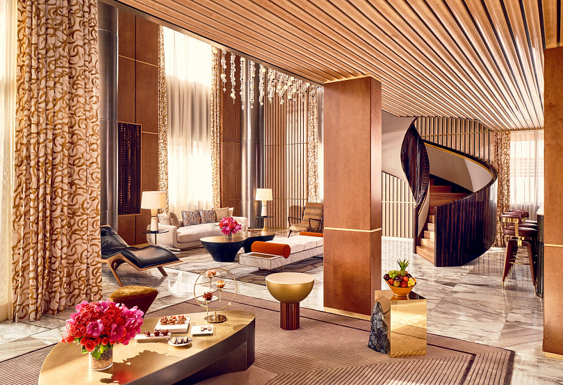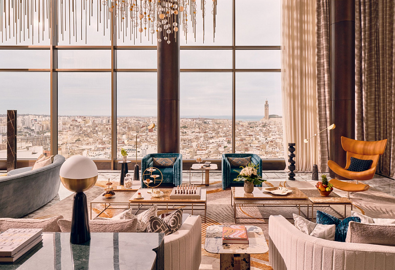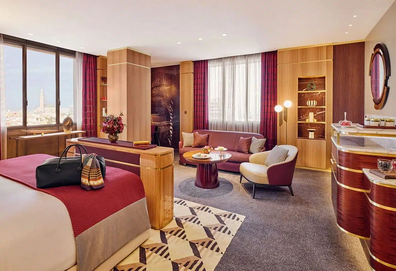 Флагманский Royal Mansour в Марракеше давно стал одним из самых роскошных отелей страны, если не всего мира, но не ожидайте увидеть его копию в Касабланке. Риадная размеренность здесь сменяется современностью, розовые камни уступают место мрамору (его сюда свозили со всего света, от Бразилии до Намибии), в лобби стоит аквариум с рыбами из Амазонки, а в интерьерах номеров много стекла и золота. Отель умело отражает мультикультурность города и его талант брать лучшее из всех миров.