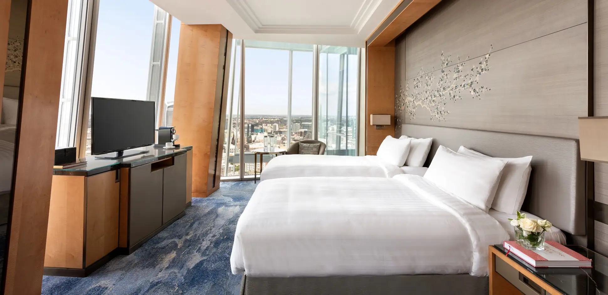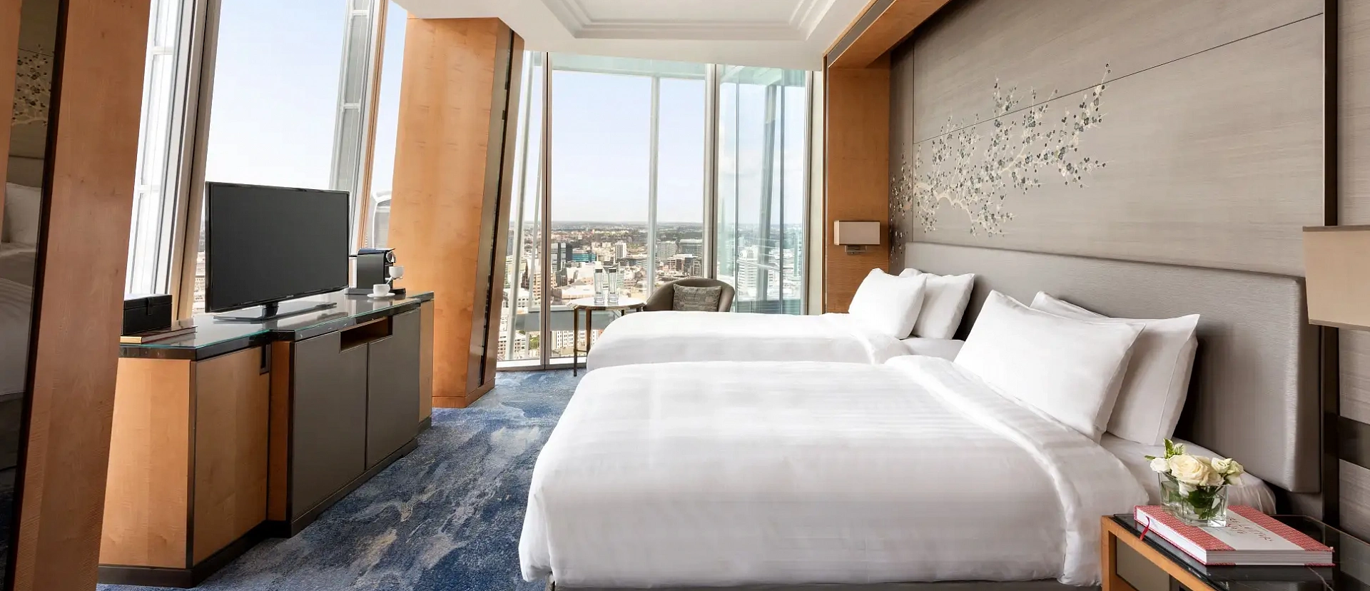Объединенный номер с двумя спальнями и панорамными видами на город. Кровать king-size в одной комнате и две отдельные кровати в другой. Ванная комната с тропическим душем, подогревом полов и отдельной ванной.