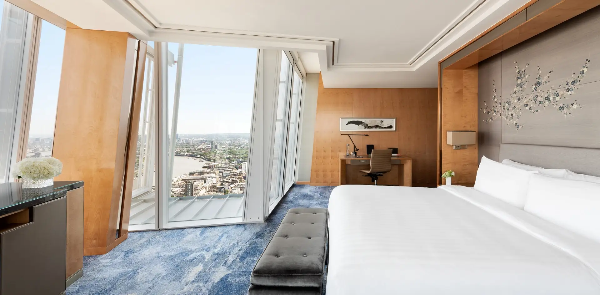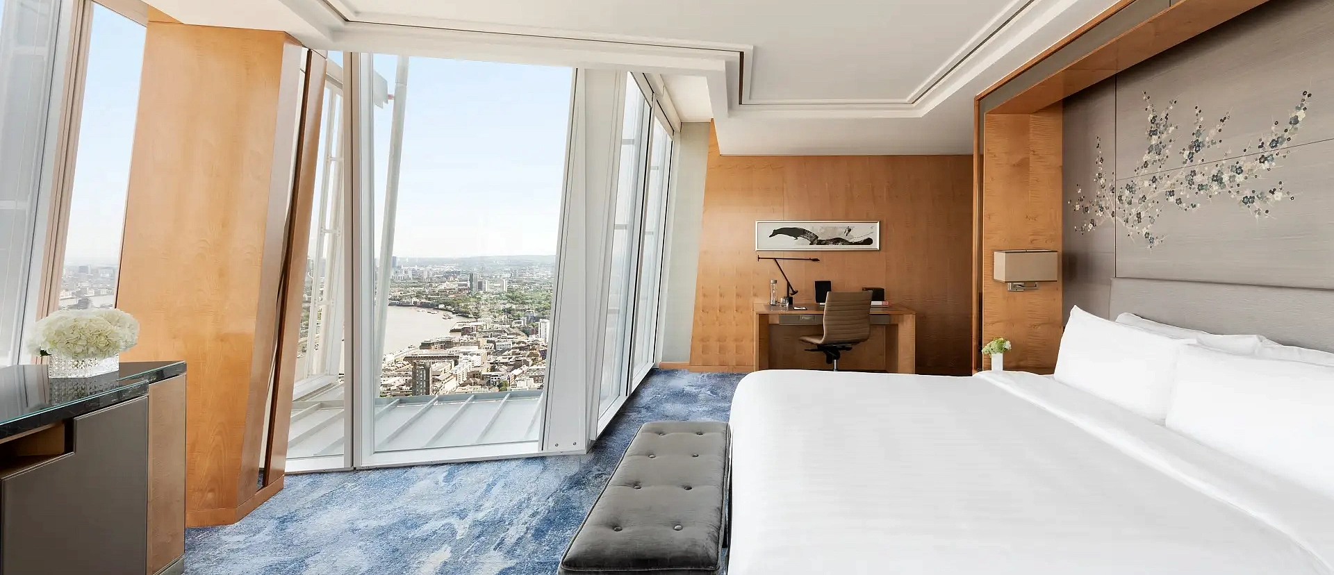 Угловой номер с панорамными окнами и видом на знаковые достопримечательности города: Биг Бен, здание Парламента, галерею Тейт Модерн и театр «Глобус». Ванная комната с тропическим душем, подогревом полов и отдельной ванной.