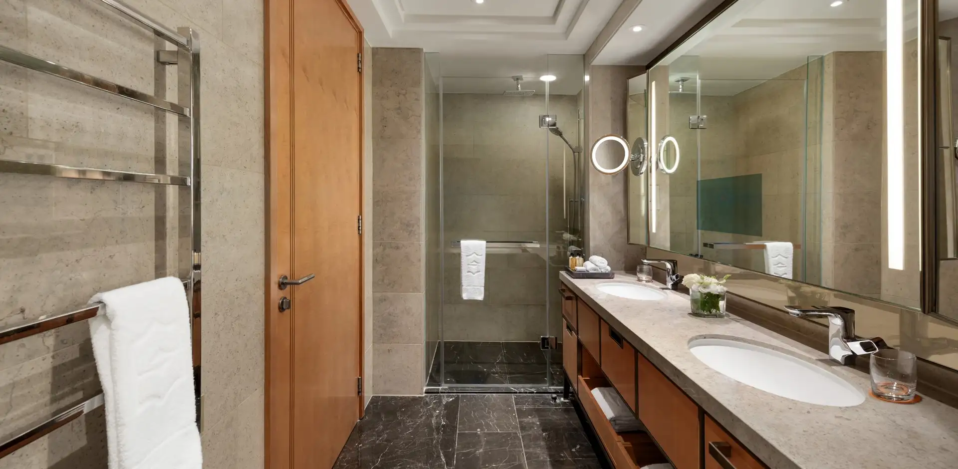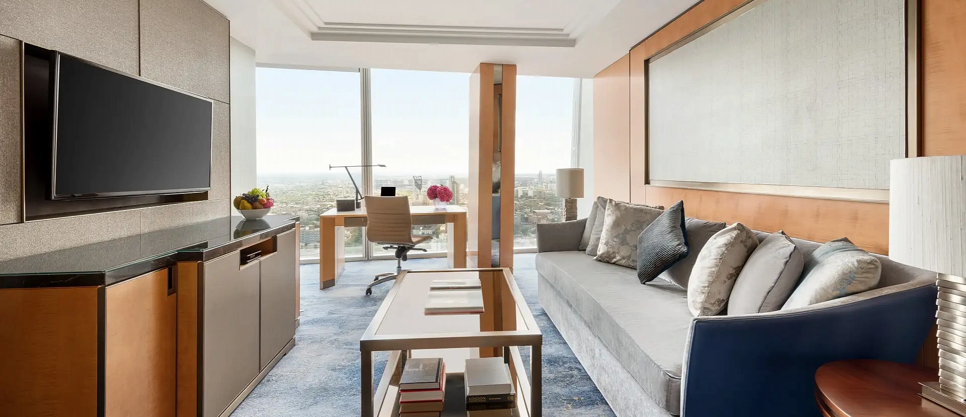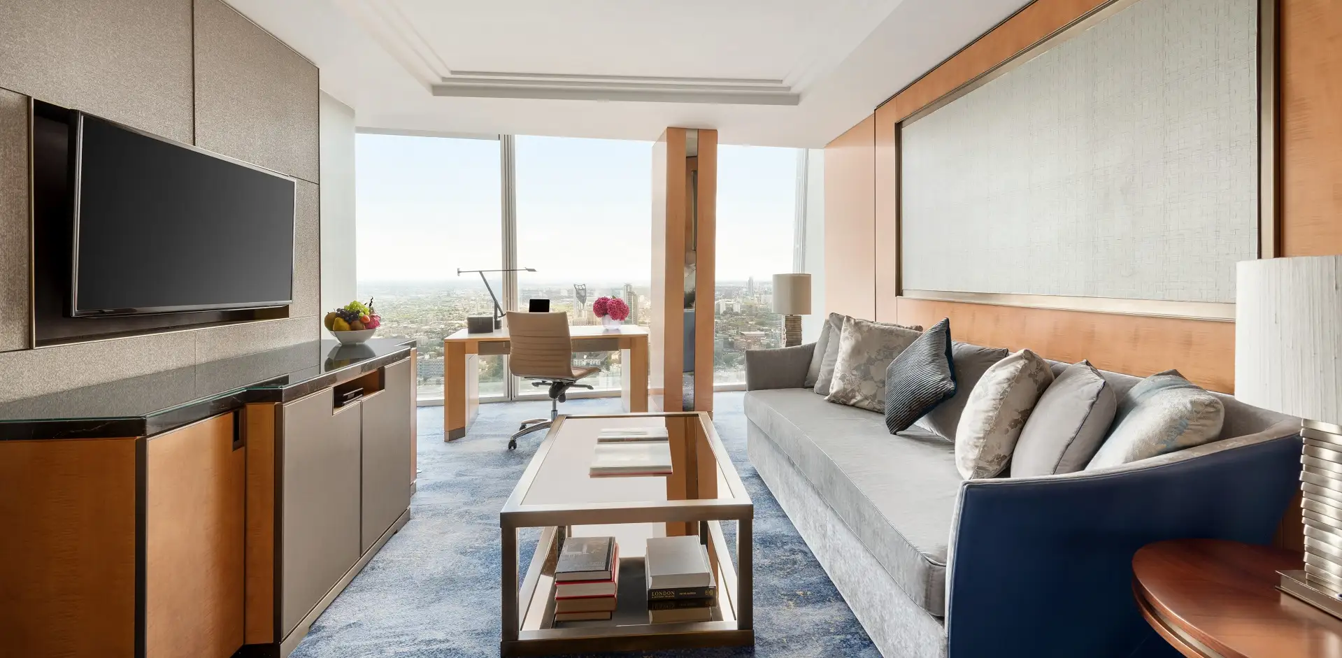 Номер с отдельной гостиной и видом на южную часть Лондона. Ванная комната с тропическим душем, подогревом полов и отдельной ванной.