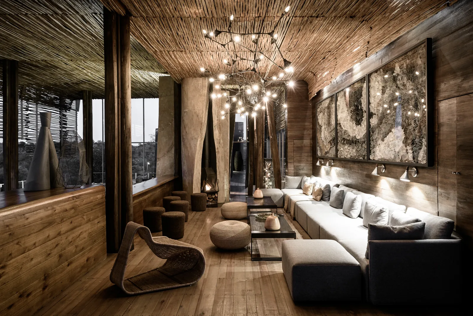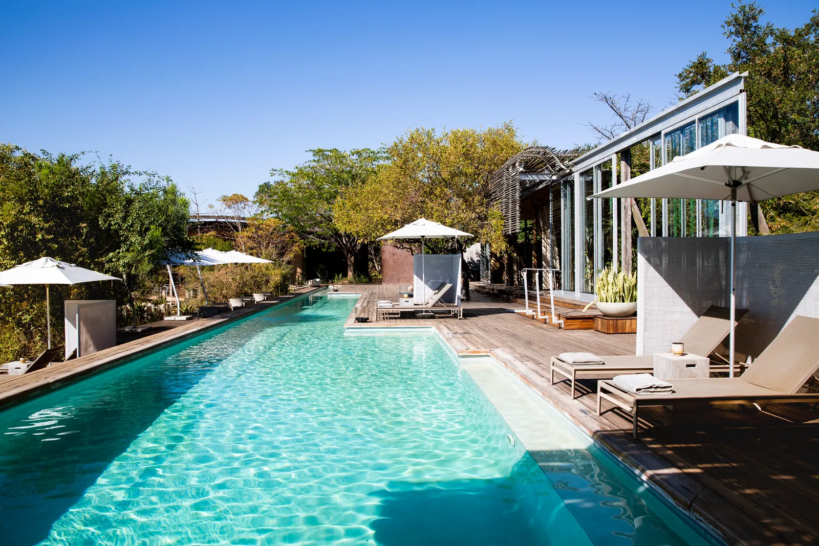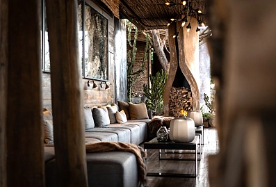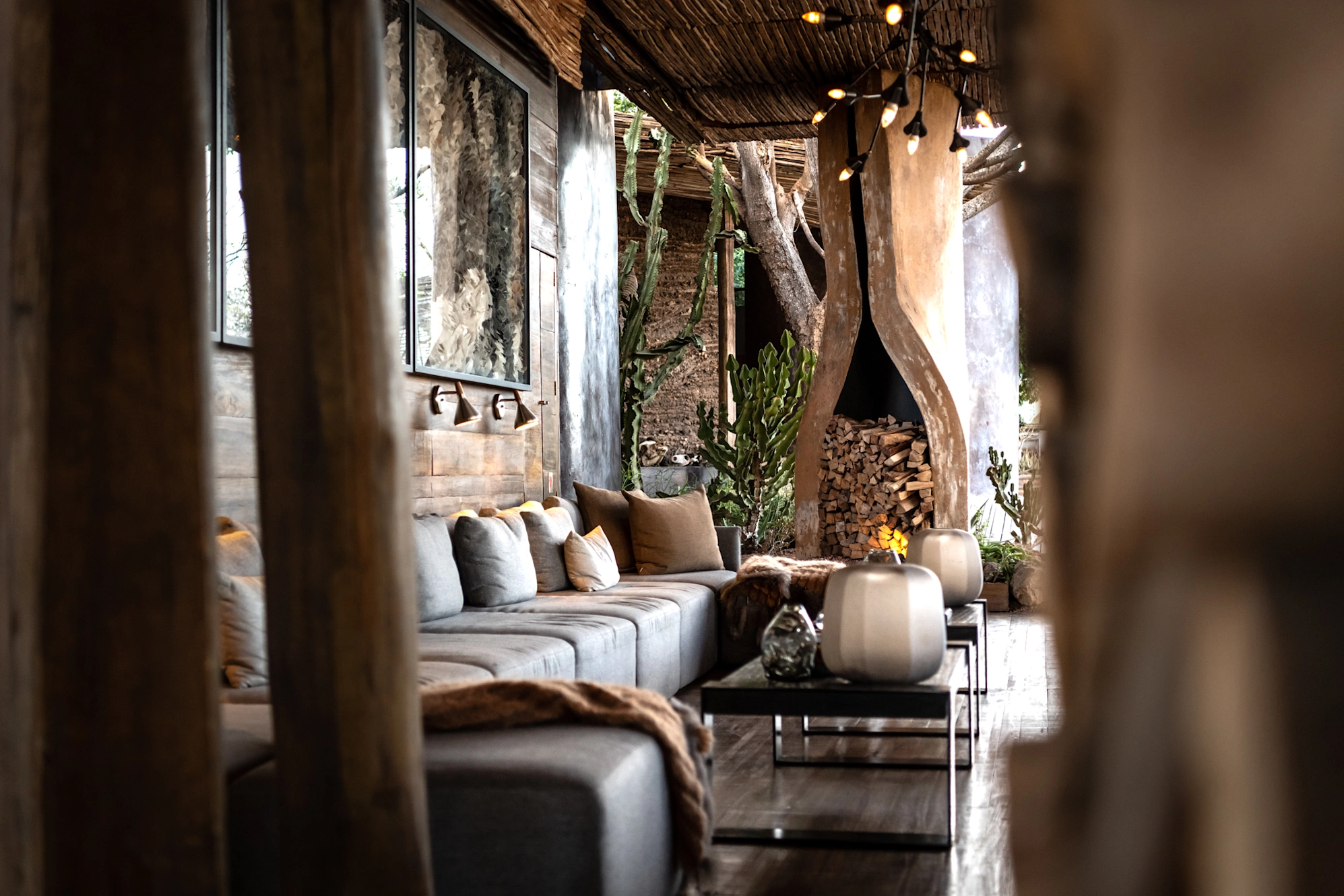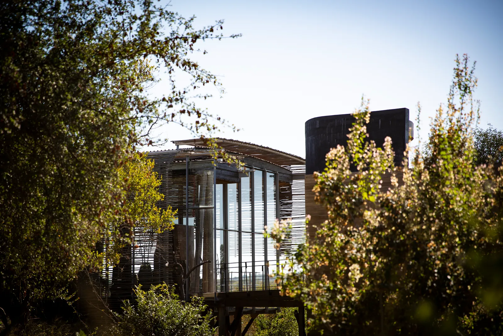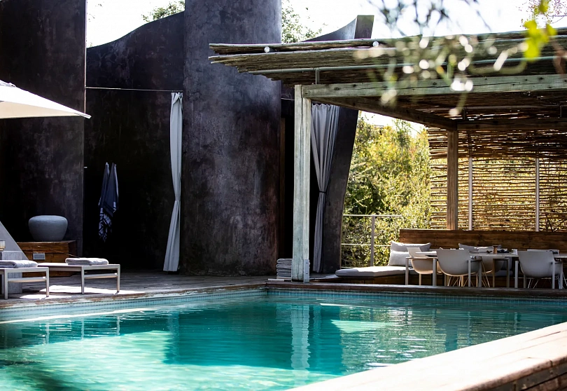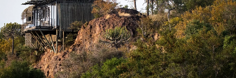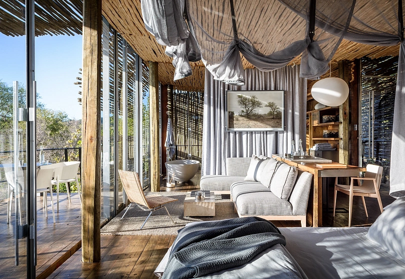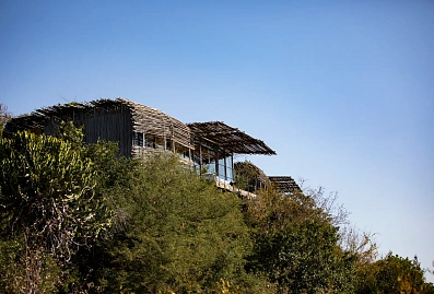 Пятнадцать сьютов открытой планировки и две виллы встроены в скальные выступы и выглядят так, словно подвешены над долиной и рекой. Ландшафт здесь — не привычная саванна, а холмы и горы, покрытые похожими на кактусы деревьями. Ощущение, что вы на дикой природе, приходит мгновенно — спасибо панорамным окнам.