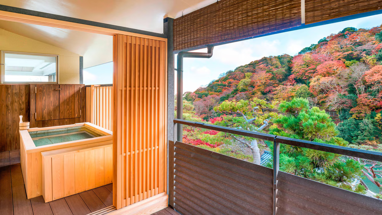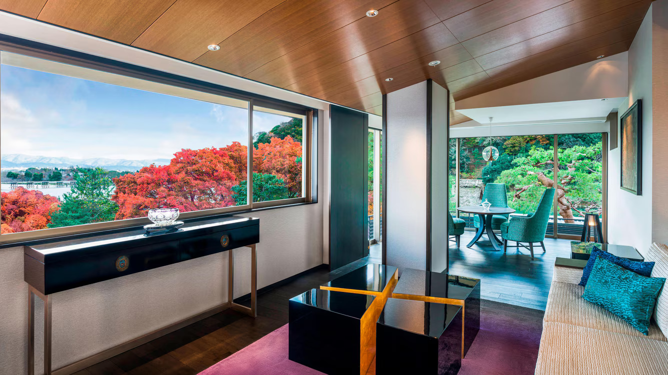 Номер с видом на гору и реку. Отдельная гостиная, столовая зона, большая спальня с кроватью king-size. Традиционная японская деревянная ванна.