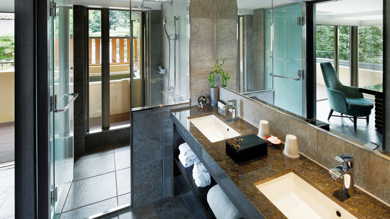 Просторный номер с отдельной гостиной и видами на реку и гору. Доступен с двумя отдельными кроватями. Ванна с термальной водой на открытом воздухе.