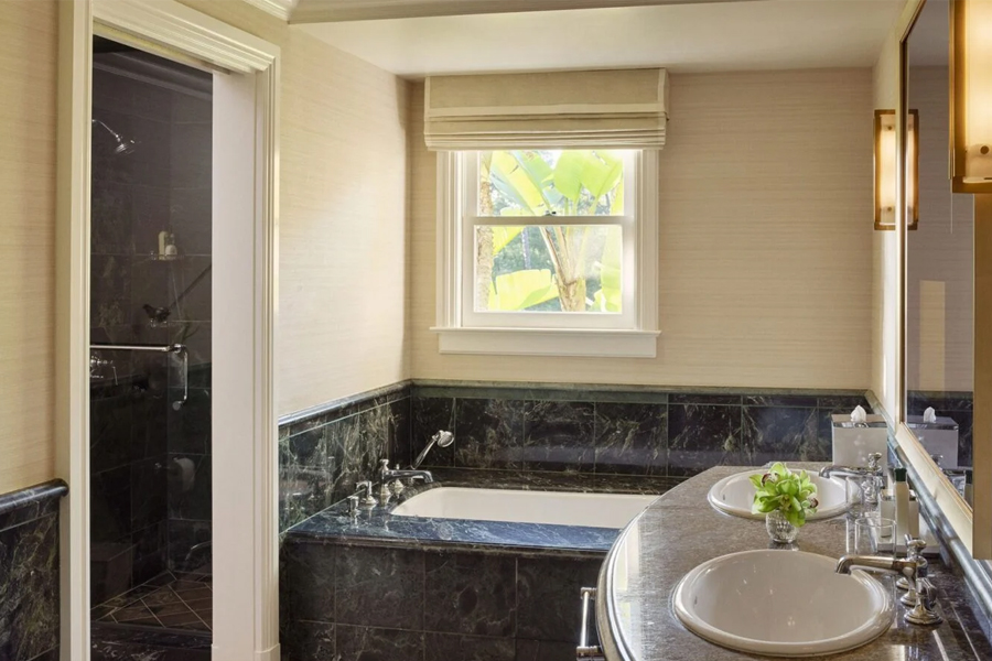 Просторный номер с отдельным входом и патио с видом на сад. Кровать king-size. Две раковины, ванна и душевая кабина в ванной комнате.