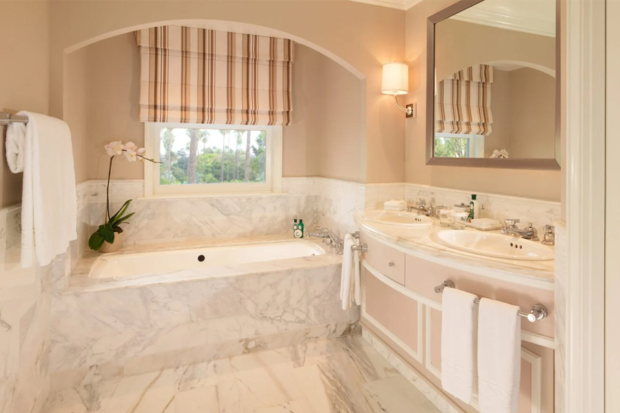Просторный номер с видом на сад и кроватью king-size. Ванна и душевая кабина в ванной комнате.